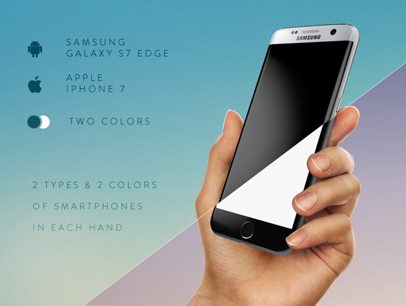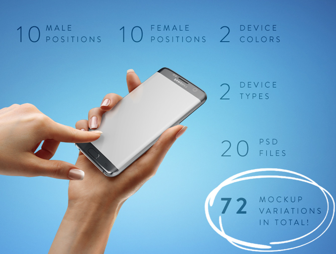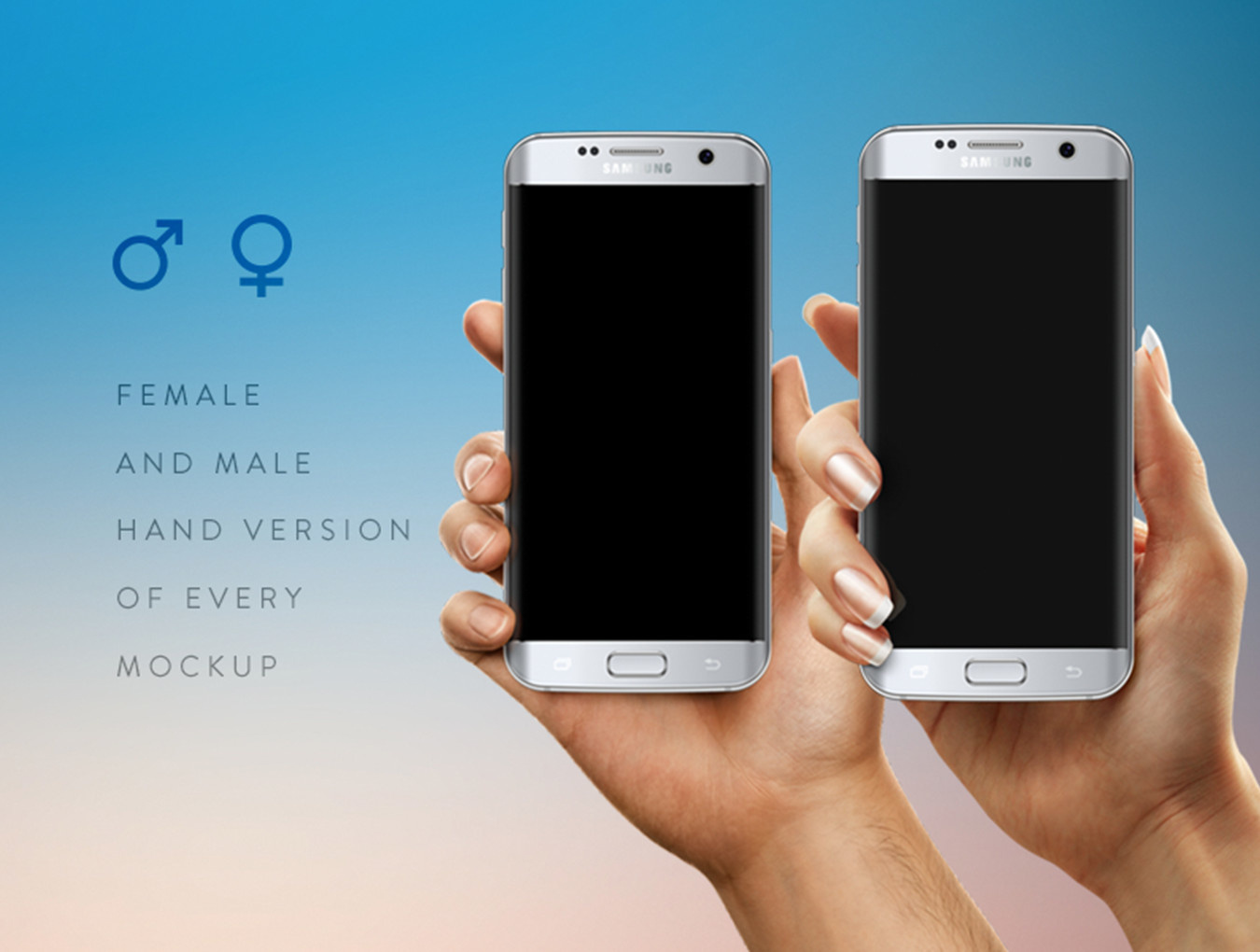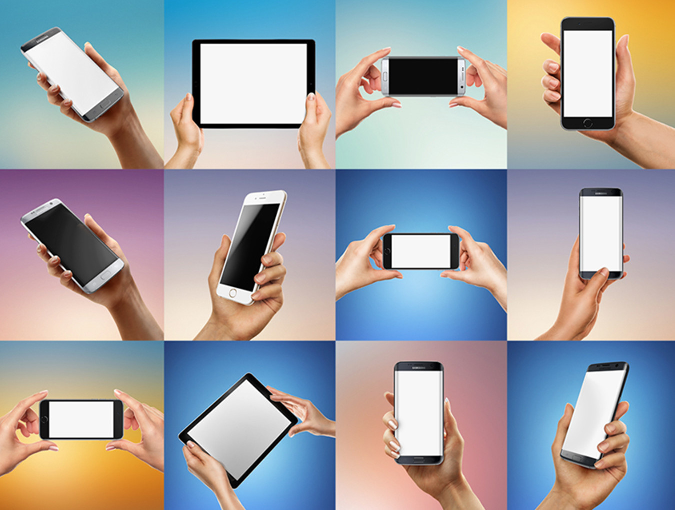 优质孤立的女性和男性手拿着苹果iPhone 7,iPad和三星Galaxy s7边缘为您完美的应用程序展示捆绑72种样机变化。 20 psd文件,有男性和女性版本的10个不同的手部位置以及2种颜色变化的2种类型的设备。专为设计师精心打造。易于使用的智能对象屏幕可让您在几秒钟内粘贴所需的图像!这些模型适合任何背景,可以轻松适应您的设计。模型的Web质量将允许PSD文件的快速性能。