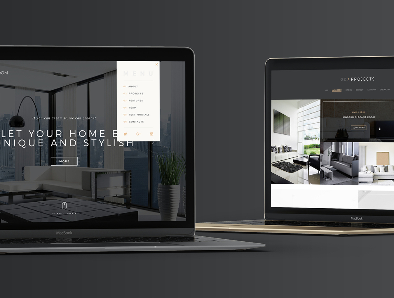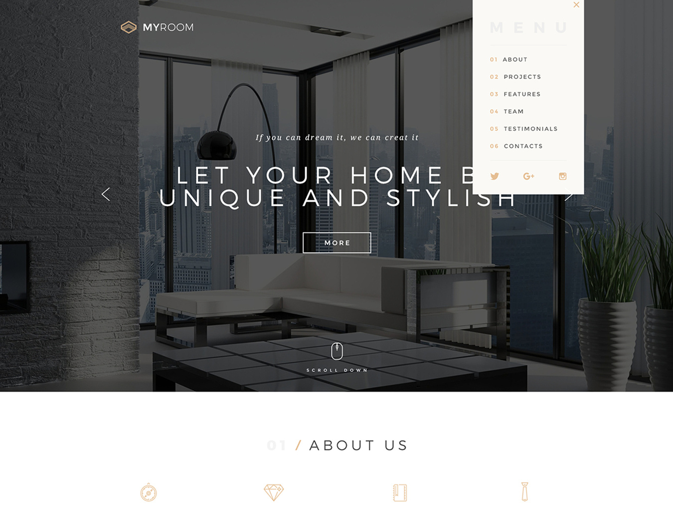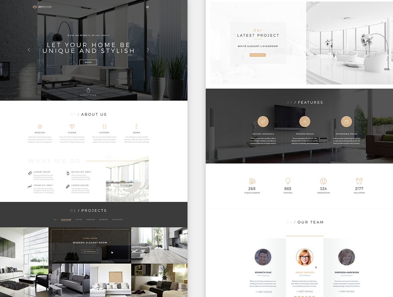 MyRoom是一款优雅,豪华,时尚的基于网络的室内设计PSD模板,基于1170px网格系统。这个现代模板使用免费的标志性和谷歌字体和一些时尚的信息图表为创意投资组合风格的网站。 MyRoom可用于广泛的网站,如建筑局,室内设计和其他企业或创意机构。