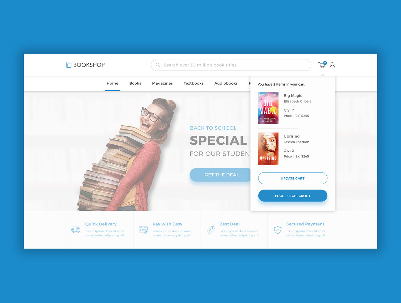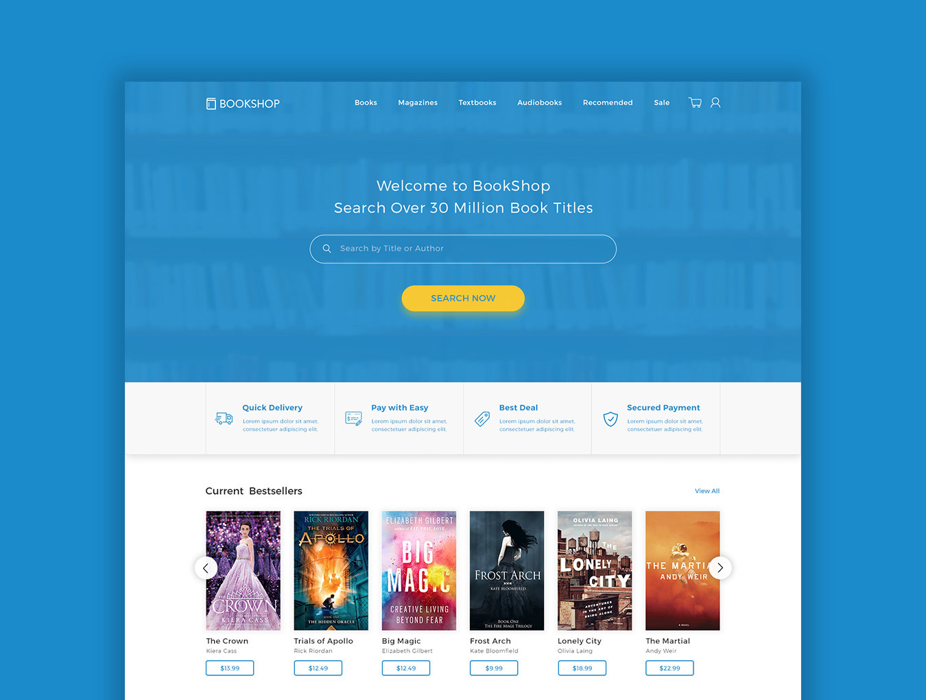 书店是在线书店服务的现代和新鲜设计模板。此PSD模板包括书籍列表,书籍详细信息,作者页面,付款页面以及博客。书店是一个完整的模板,可以为您的书店网站做好准备!这些PSD文件易于定制,分层且适当命名。