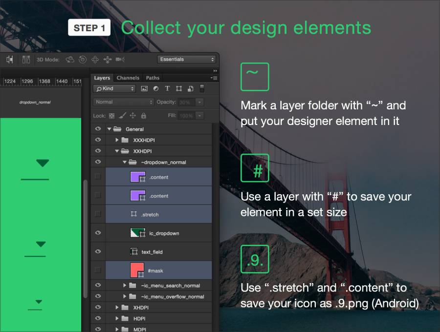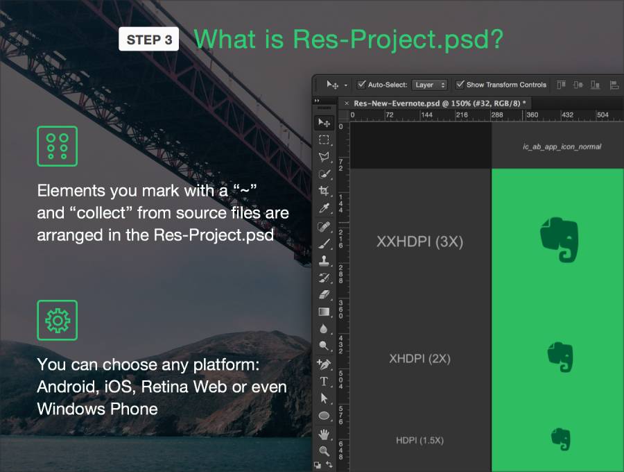 Resonator是一个梦幻般的扩展,旨在收集,导出和存储各种移动平台和网络的图形资源。 点击 使用Resonator,您可以将所有项目的屏幕上的所有设计元素都收集到一个Res-Project.psd中,导出所有带有文件名和有组织的文件夹结构的设计元素,并存储所有设计元素以便传输到其他开发者在一个单一的文件。