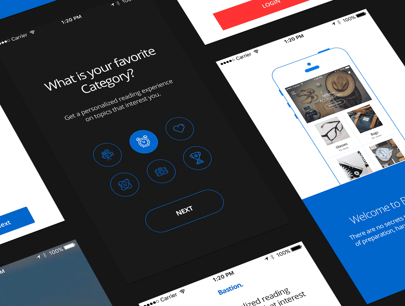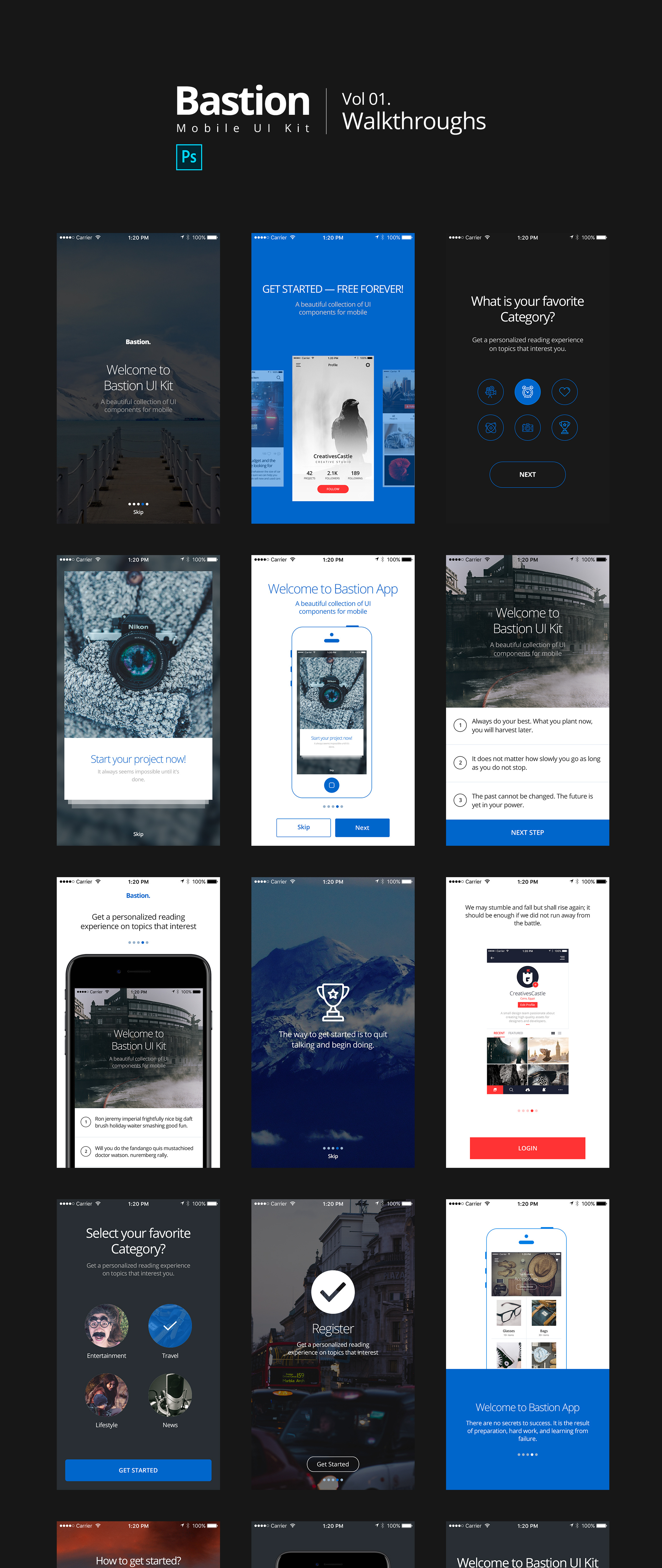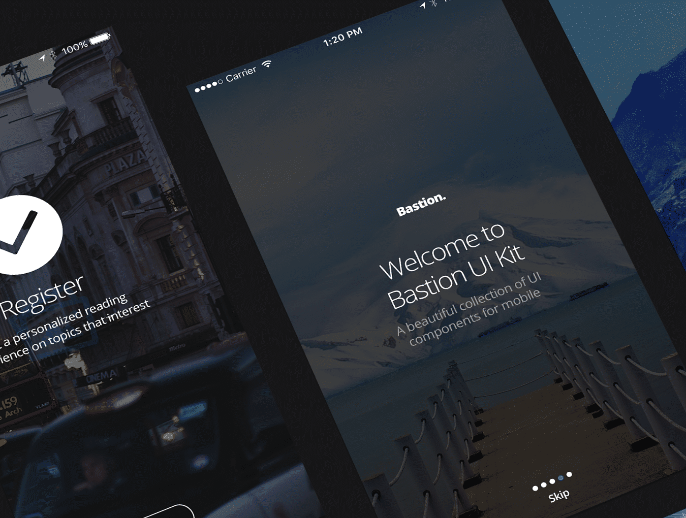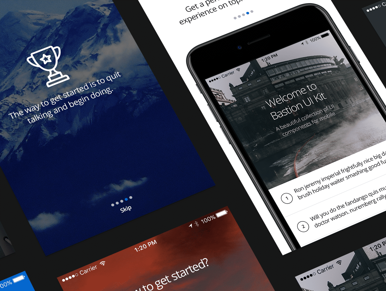15用于在Photoshop中设计的移动设备的漫游屏幕.Bastion Mobile UI Kit第1卷