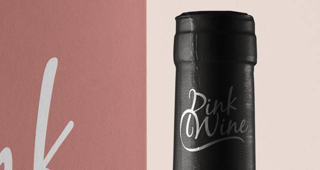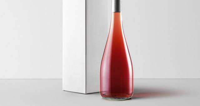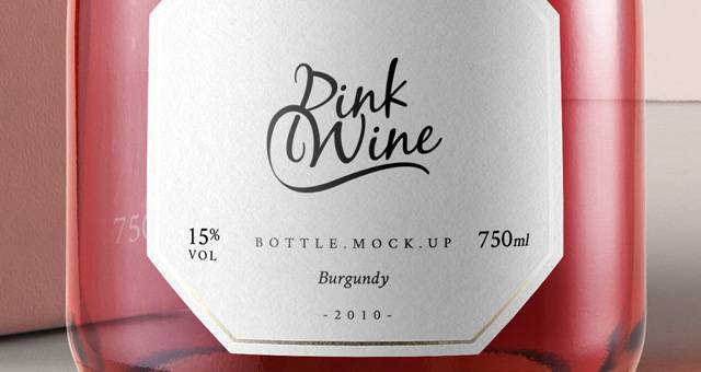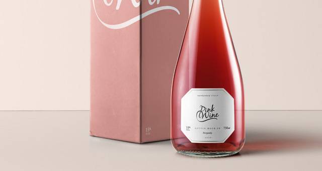 这是一个圆形的psd粉红色玫瑰葡萄酒勃艮第瓶子模型及其盒子。您可以添加自己的标签设计图形并更改颈部颜色。