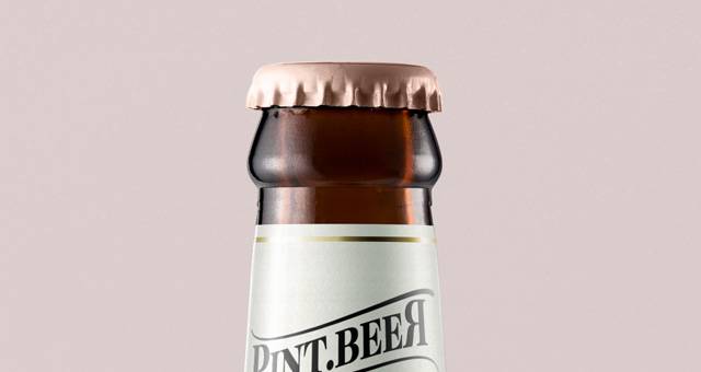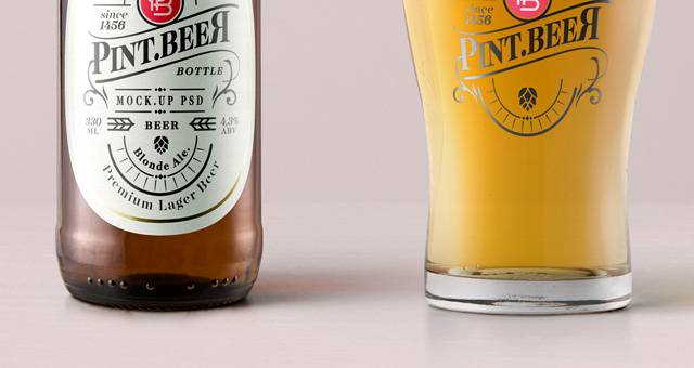 这是一个色彩琥珀的psd啤酒瓶模型,其品脱玻璃展示您当地的啤酒酿造品牌设计。轻松添加自己的标签设计,并更改帽子颜色,使其成为您自己的。