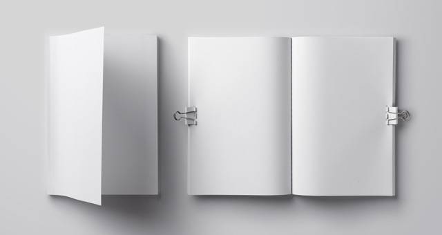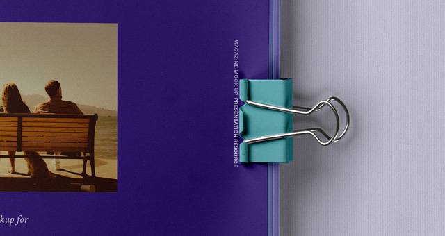 这是一个开放的psd杂志模型俯视图,带有两个装订器和一个打开的前盖视图。使用智能层轻松显示您的打印设计风格。