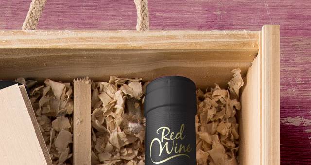 这是我们的psd葡萄酒木箱的开放版本,其盖子和酒瓶。轻松添加您的品牌设计来展示您的工作。