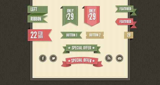 一套完整的复古和复古网络菜单丝带,复古的社交图标,复古的网页按钮。理想的创建一个老式的网页设计,使您的项目脱颖而出。您可以轻松地更改psd上的颜色,使您的自定义主题。