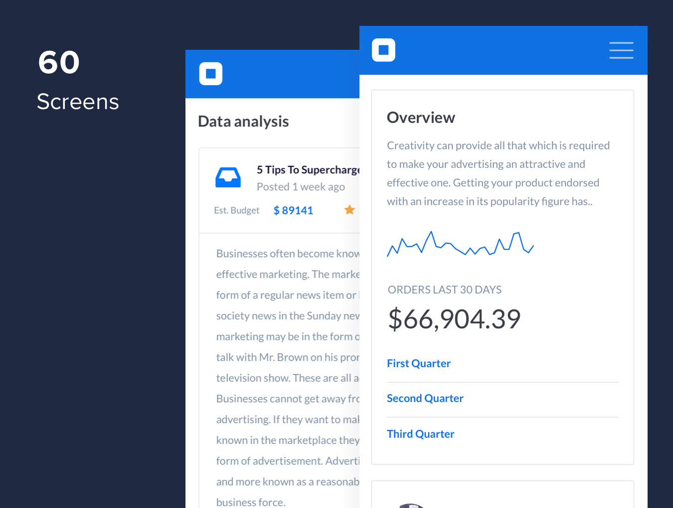 60个移动仪表板UI屏幕可帮助您为客户设计漂亮的界面。这些是我的Admin Dashboard桌面UI工具包中的移动版本。 Sketch和Photoshop文件附带了我最喜欢的Google Free Web字体之一:Lato。
