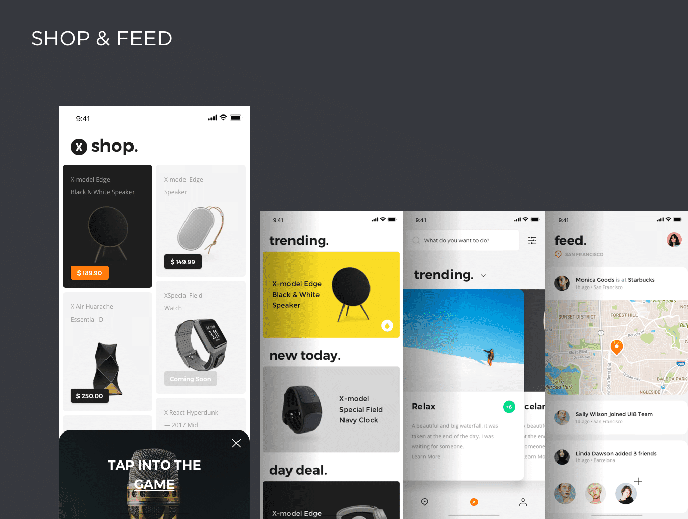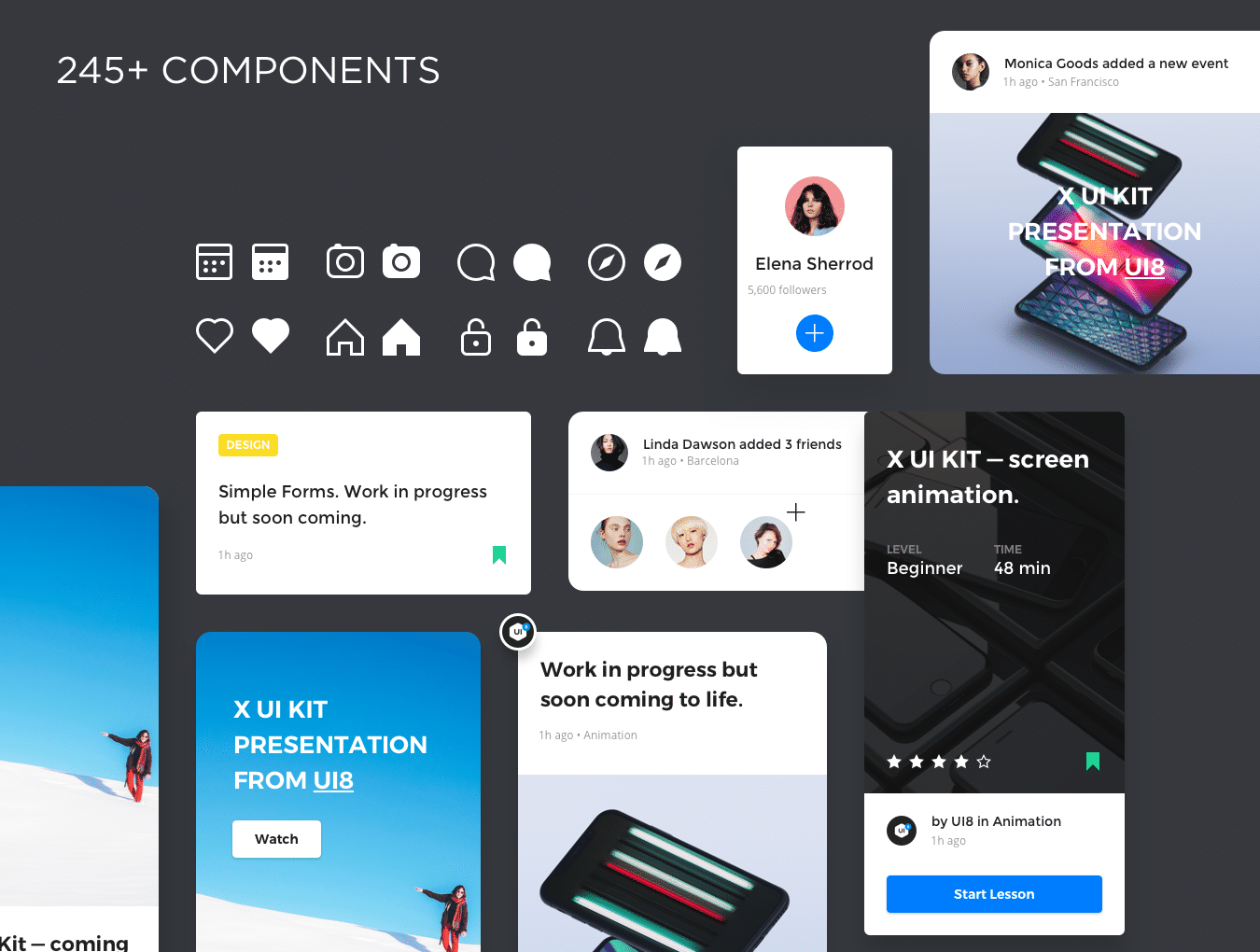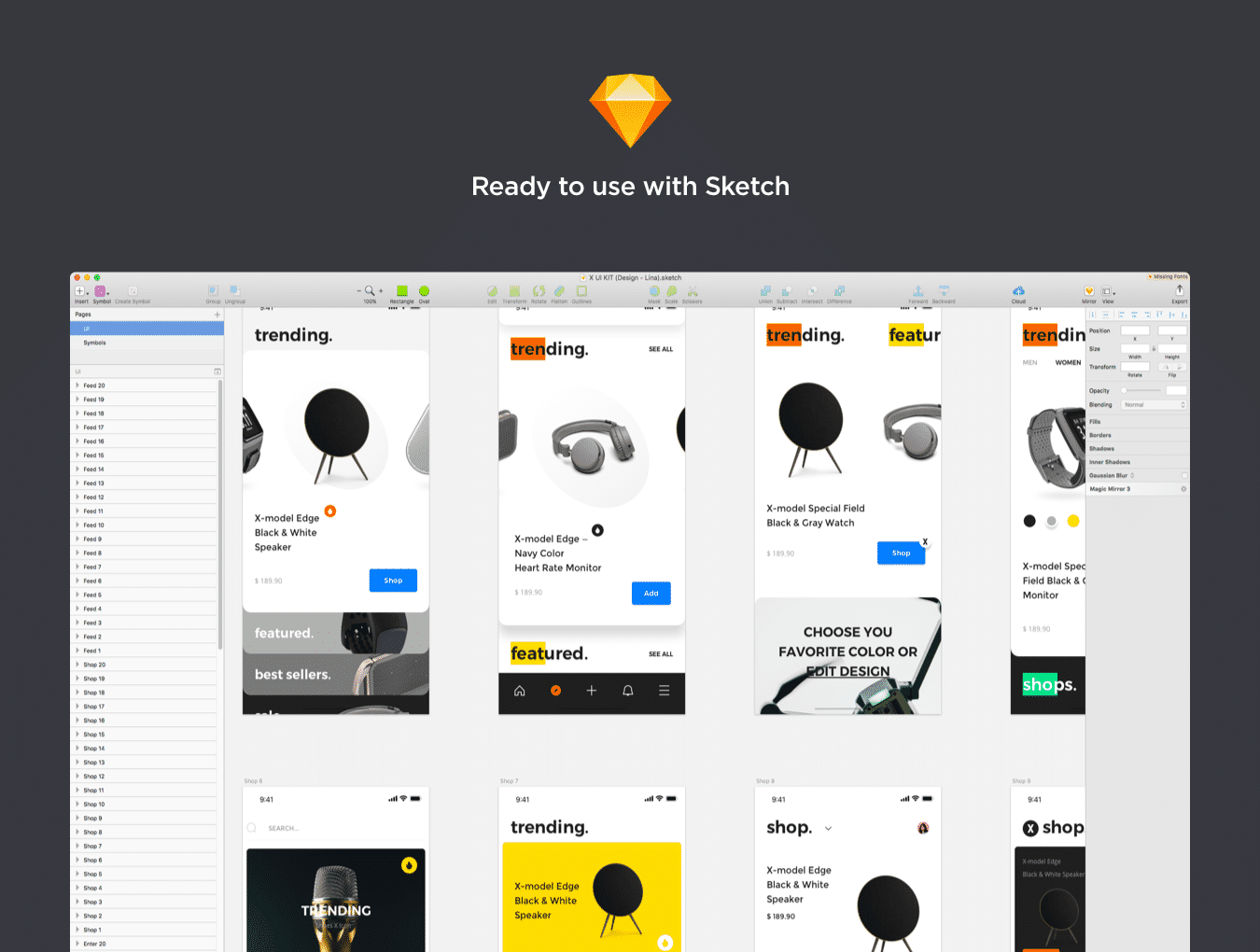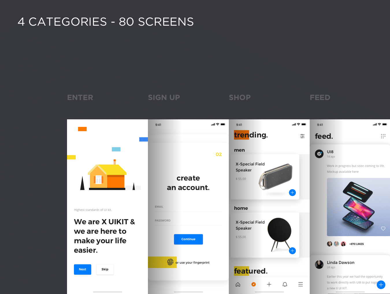 介绍X UI KIT!各种各样的80个iPhone X大小的屏幕模板,包括4个不同的类别;演练,商店,饲料和进入。拥有超过245个组件和易于修改的元素,这个iPhone X UI工具包是您下一个项目必备的。所有资产都与Sketch兼容。