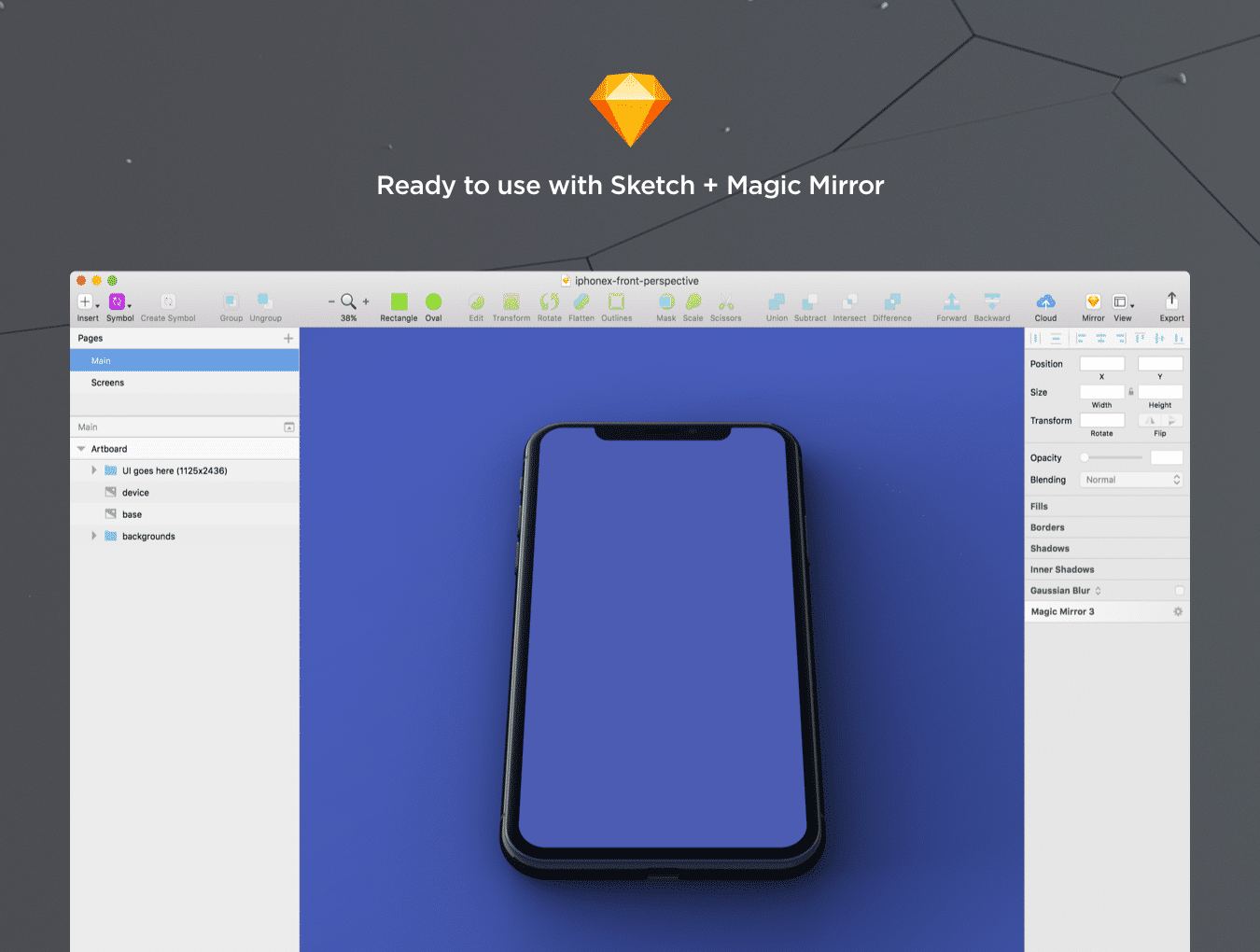 高度详细的Front Perspective iPhone X模型专为Photoshop和Sketch设计。包括3个奖励背景图像;蓝色,织物和详细的木板背景。需要Sketch Mirror插件。
