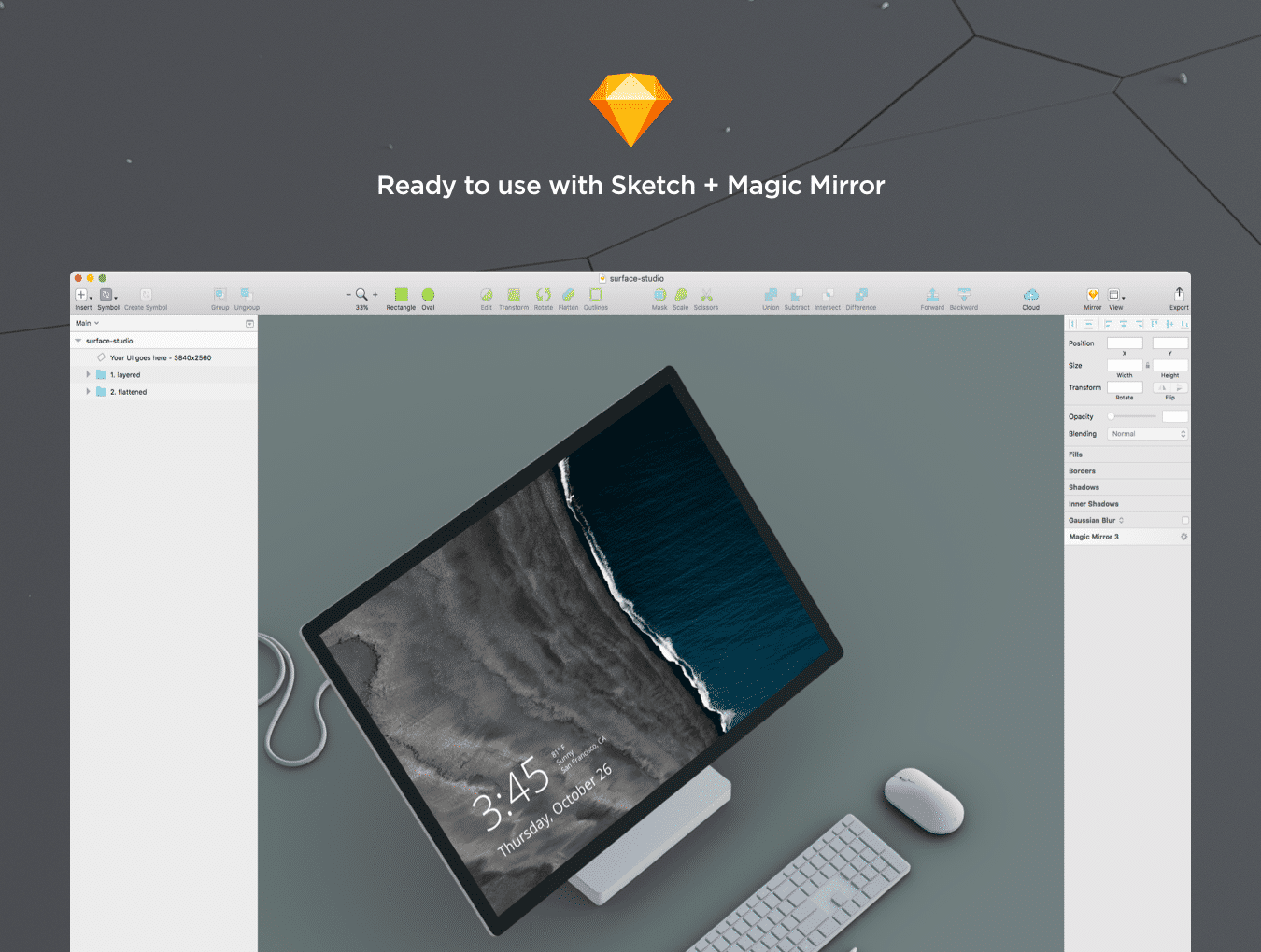 为Sketch和Photoshop设计的令人惊叹的Microsoft Surface Studio的高分辨率模型。包括高分辨率背景屏幕图像。需要Sketch Mirror插件。