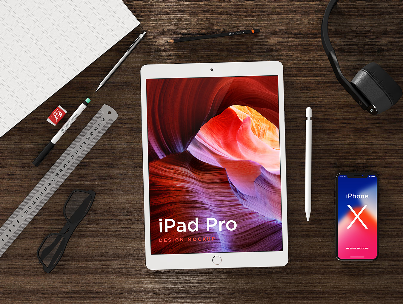 Creative iPad Pro,iPhone X和Sketchbook Mockups。,Creative Setup Mockup