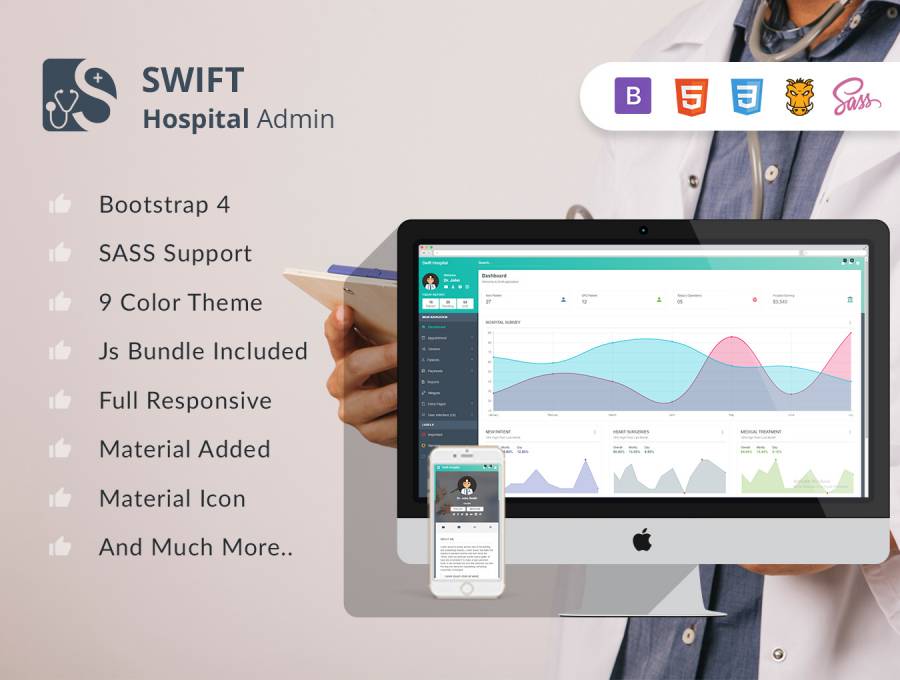 Swift Hospital Admin是医疗保健,医院和医疗行业的Bootstrap 4 Material Design高级管理仪表板主题。