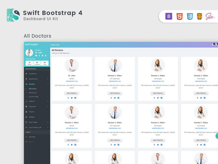 适用于医生和医院的Bootstrap 4仪表板,Swift医院管理员
