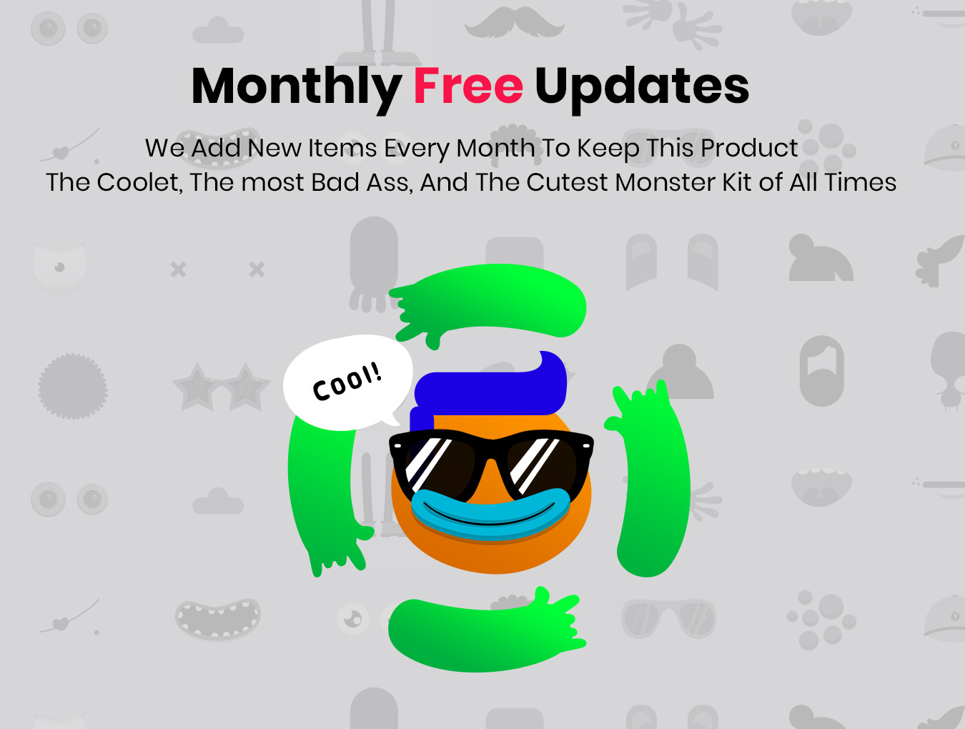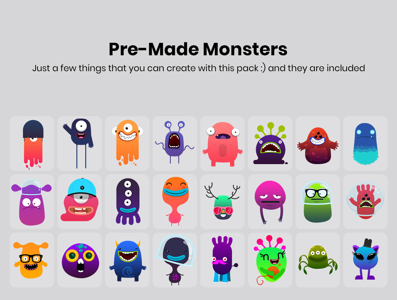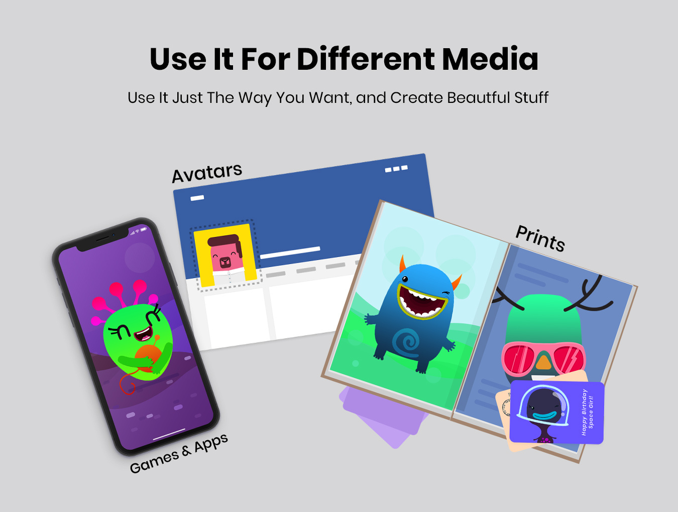 立即制作超过+200件物品的超棒怪物或角色,并将其用作品牌或服务的促销品。这些可爱的小动物一目了然地在每个人的脸上露出笑容。自己创造一个可爱的怪物很容易,也很有趣。只需选择你的身体部位,将它们混合在一起,你就会在几分钟内发现一个新生的怪物。