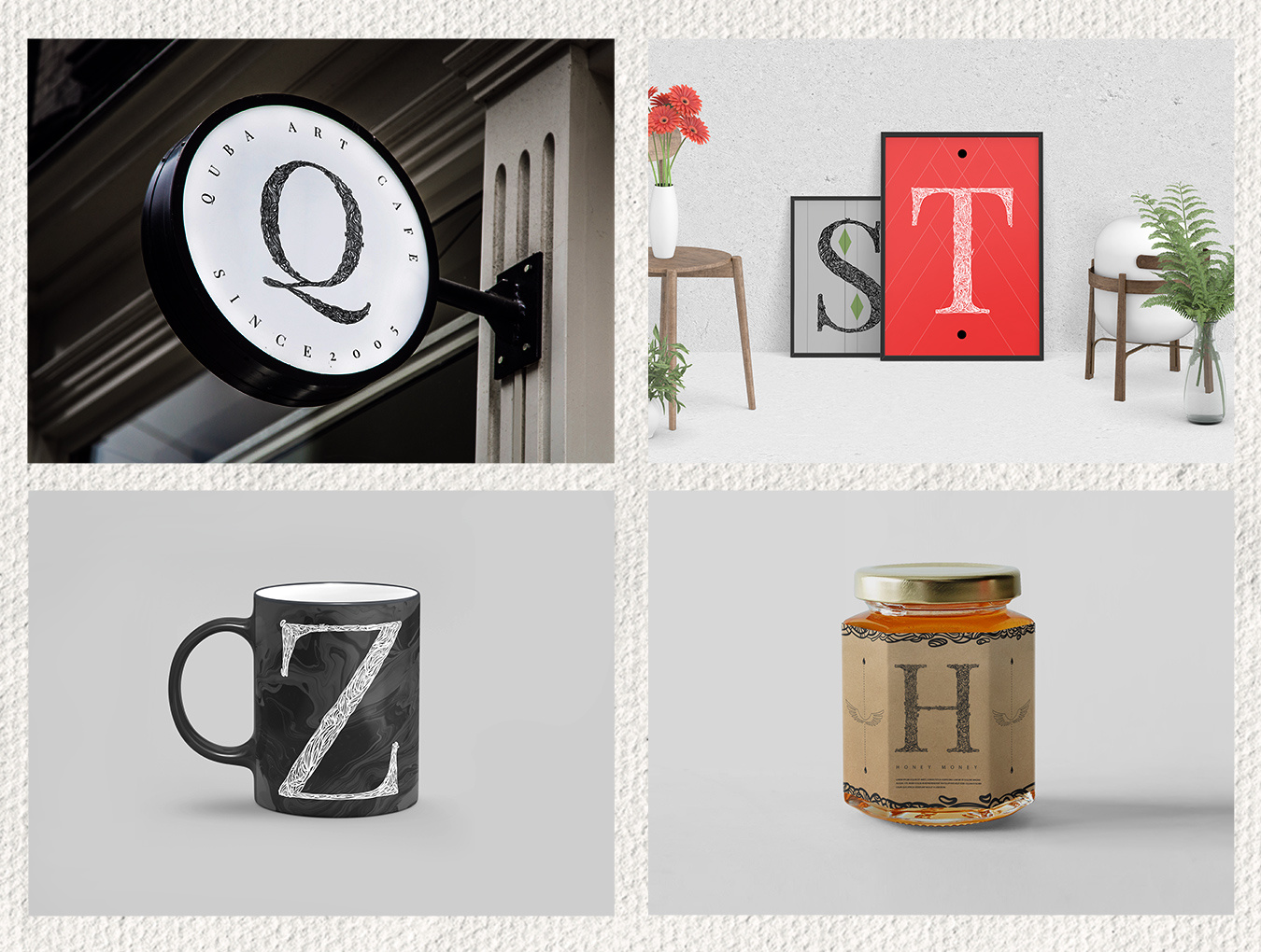 我很高兴终于发布这个艺术包。基于漂亮字体“Playfair”的图形字母表。这些优秀的字母为您的品牌增添了视觉效果,并帮助您营造一种独特的感觉,将会吸引您的观众心灵。