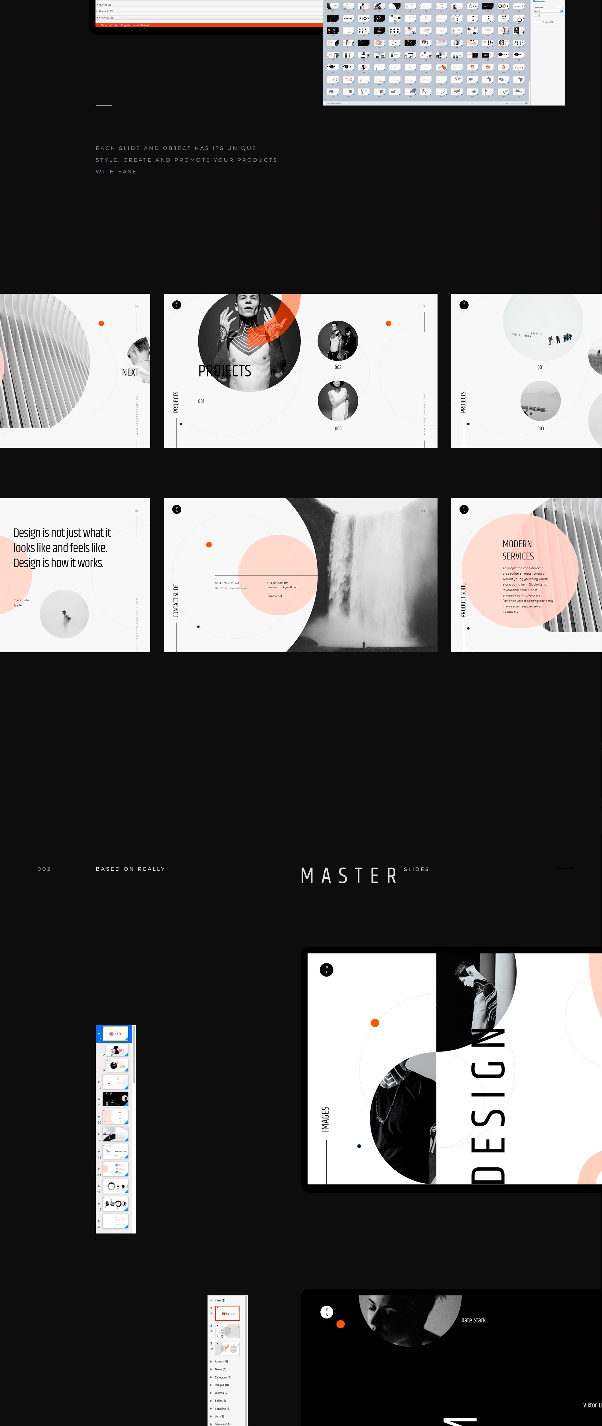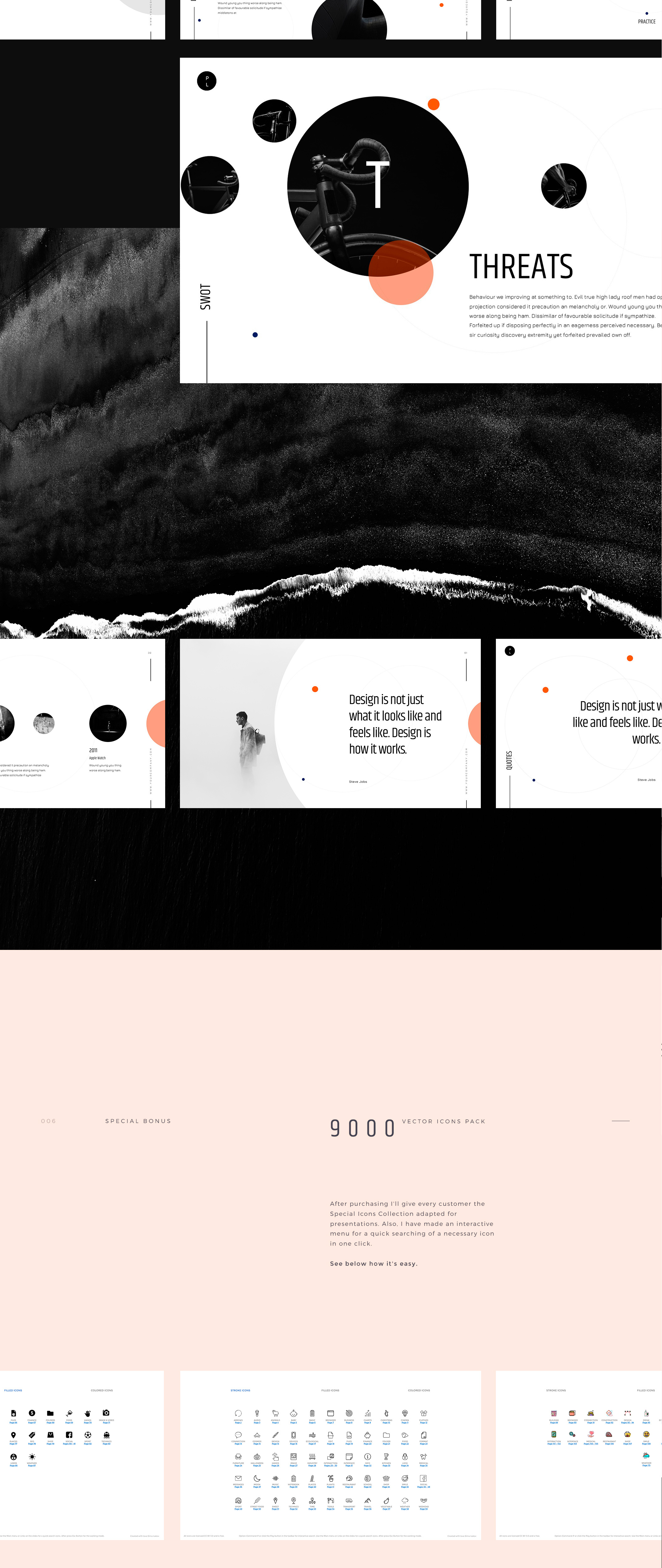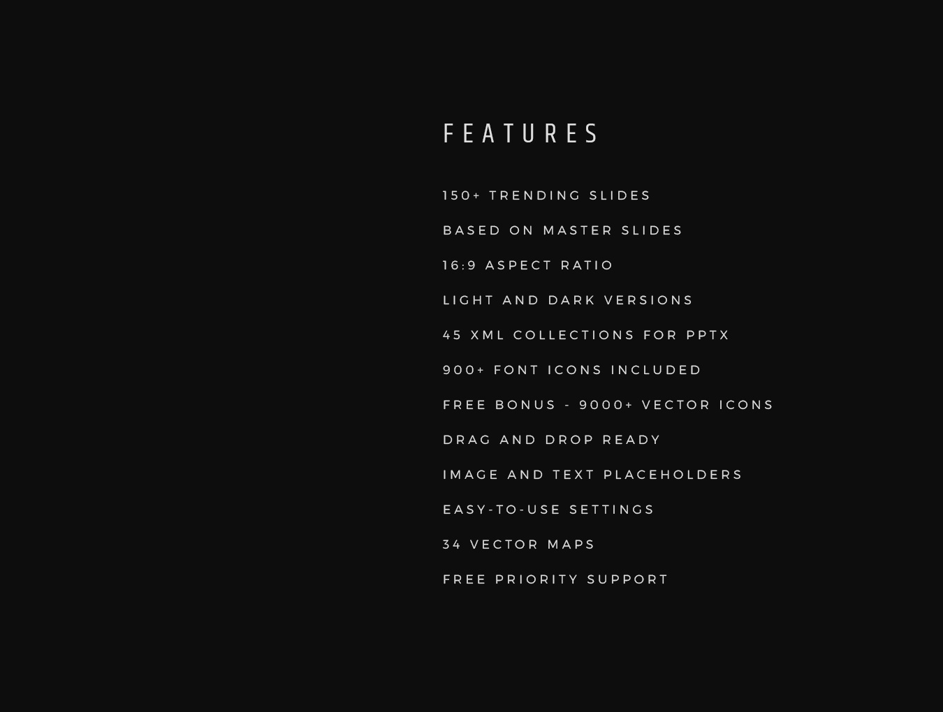 这种多用途模板符合最新的设计趋势。根据120多个主幻灯片创建150多个独特的幻灯片。交互式菜单允许您创建高级演示文稿。不需要特殊的知识。每个人都可以创建一个惊人的演示文稿,只是改变图像和文字使用嵌入式900+集合中的字体或矢量图标。在轻按和黑暗样式之间单击切换即可更改颜色。您还可以安装一个完整的45 xml集合,其中包含字体组合和颜色设置,以便轻松更改任何对象。和往常一样,通过易于使用的单击设置节省您的时间。