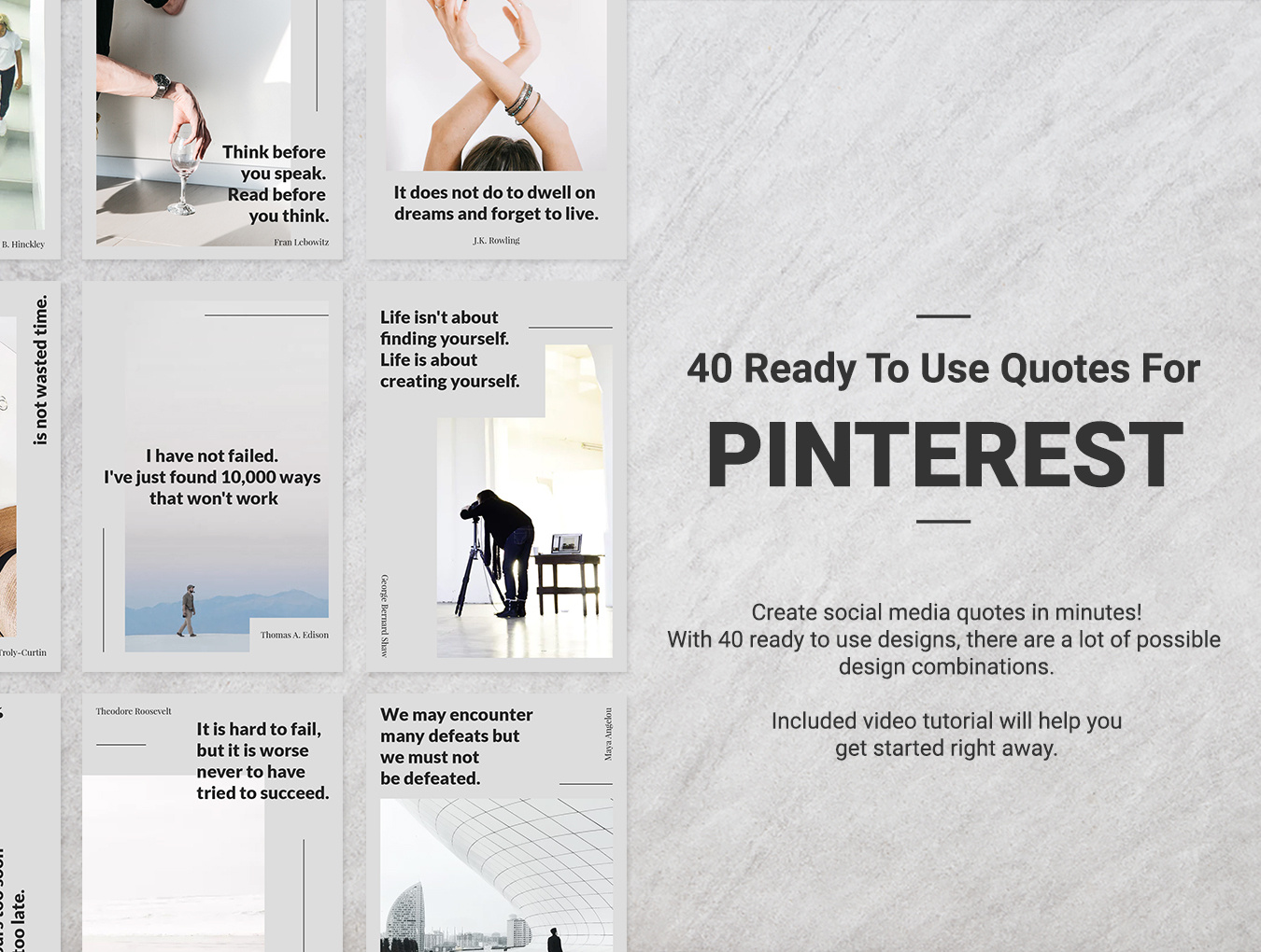 40准备使用Pinterest Quotes将激励您和您的粉丝。更改文本,颜色,图像,笔触和形状以获得所需的最佳效果。混合搭配以创建您的自定义报价,并使用我们的社交媒体备忘单,使其适应其他社交媒体网络规模。清洁文件设置将帮助您在几秒钟内编辑引号,视频教程将帮助即使是最基本的用户立即开始。