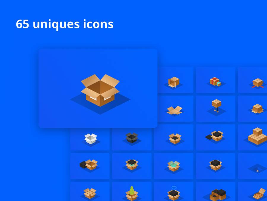 65等距框图标。最简单,最不寻常的盒子,一切都与它们相连。在Sketch,Illustrator,Figma(仅限链接访问),Affinity Designer和Photoshop设计的这些独特的等距形状框插图上,可轻松更改颜色和大小。还支持格式:EPS,SVG,PDF和PNG。