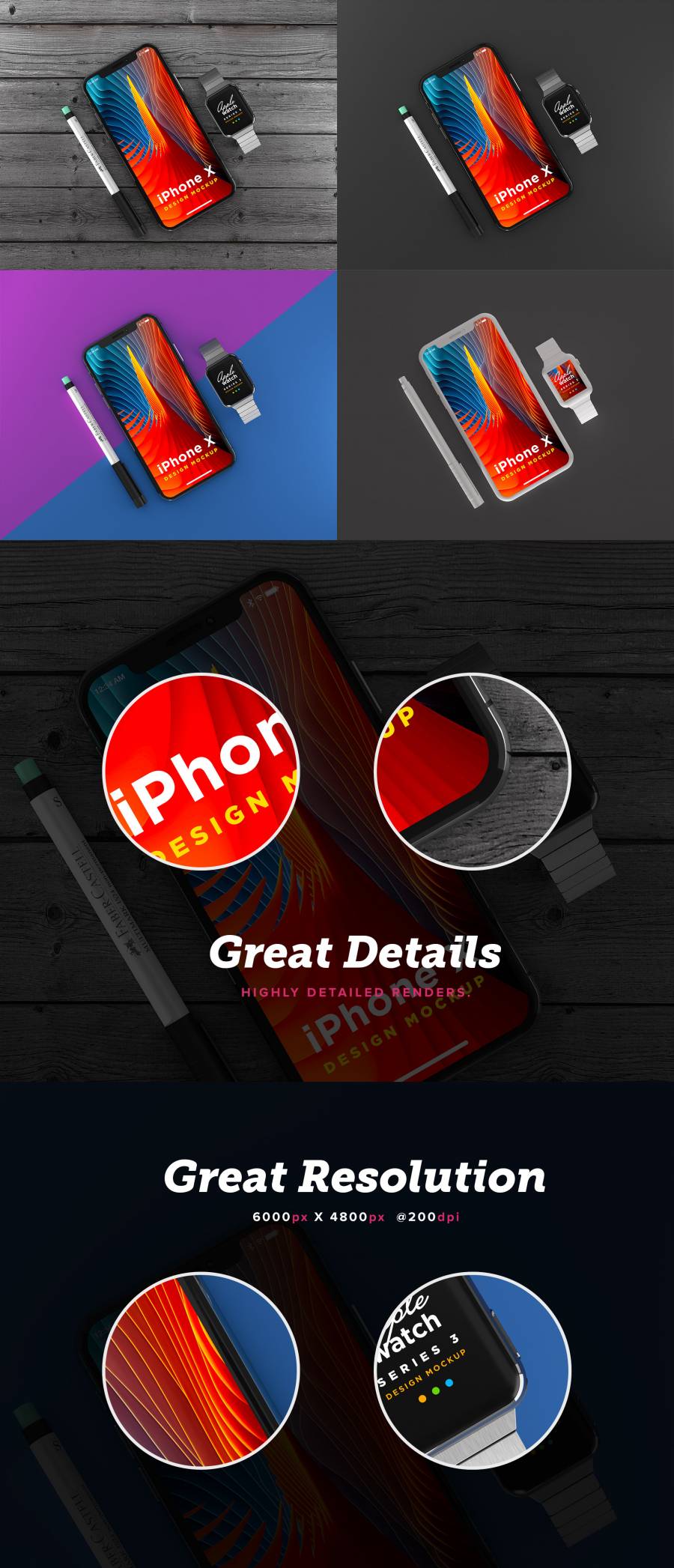 iPhone X和Apple Watch的高分辨率Photoshop文档。在200 dpi的分辨率下以6000 x 4800像素的高分辨率创建,以保持各种用例的最佳图像质量。