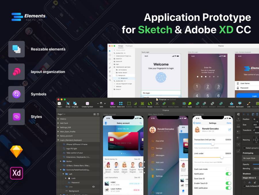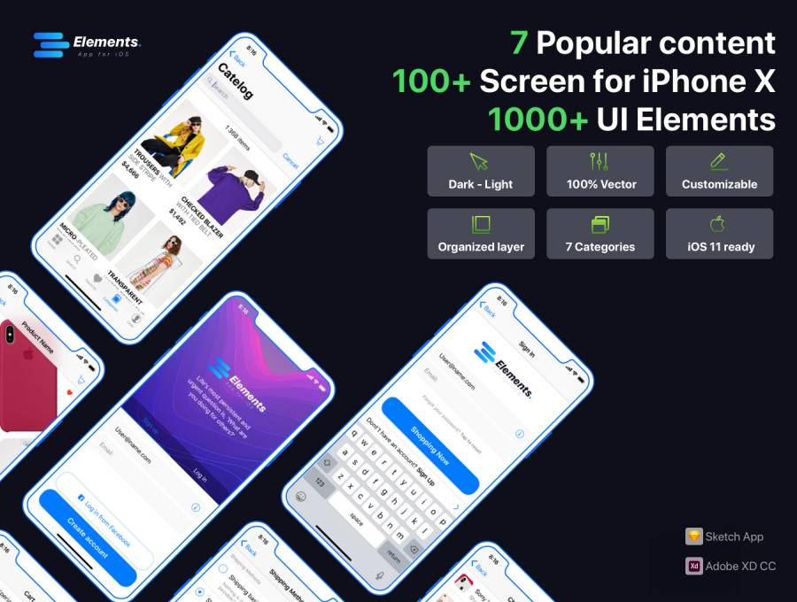 移动应用程序iOS UI工具包使用多用途是100多个屏幕的集合,制定了iOS指南,并分为7个流行的内容类别,并为Sketch和Adobe XD CC精心组装。让您的应用设计更快!