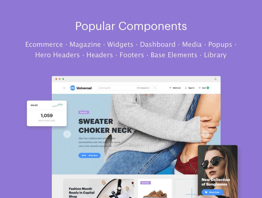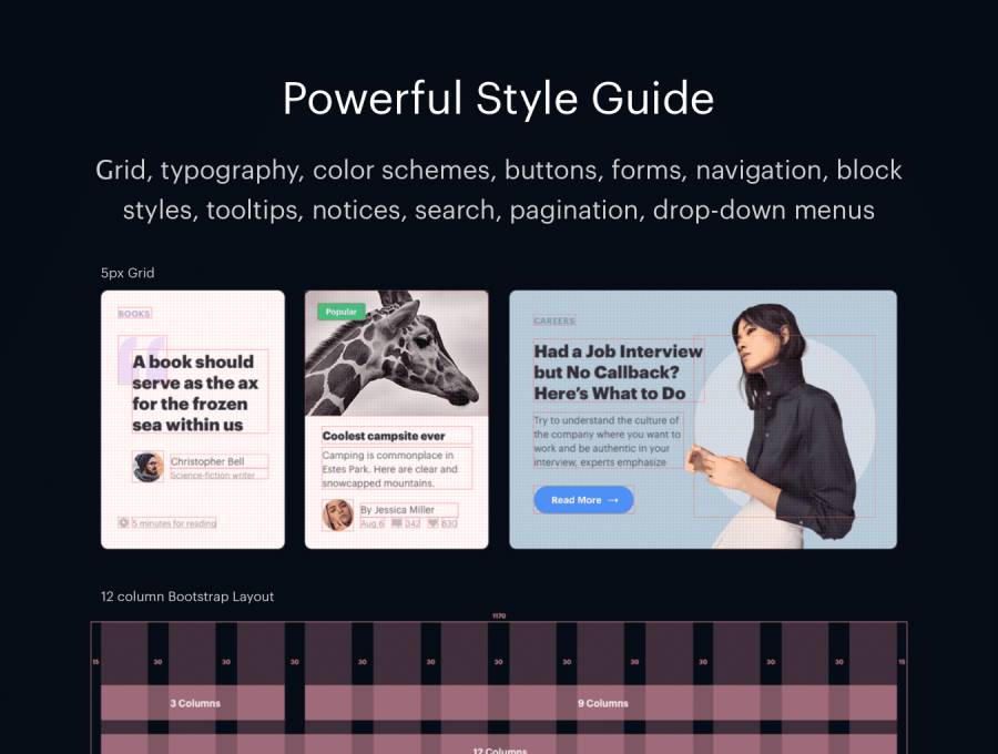 时尚简约的523 UI组件,用于创建现代化的在线商店,博客,杂志或在线媒体。 2种字体变化的黑暗与光明屏幕。可以根据需要使用文件 - 更改文本样式,颜色,添加或替换照片和图形。根据需要自定义模板。为了向您展示Universal的灵活性,我们为所有文件轻松制作了两种颜色和排版系统。