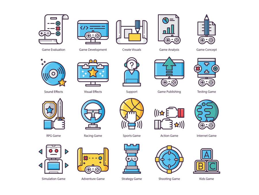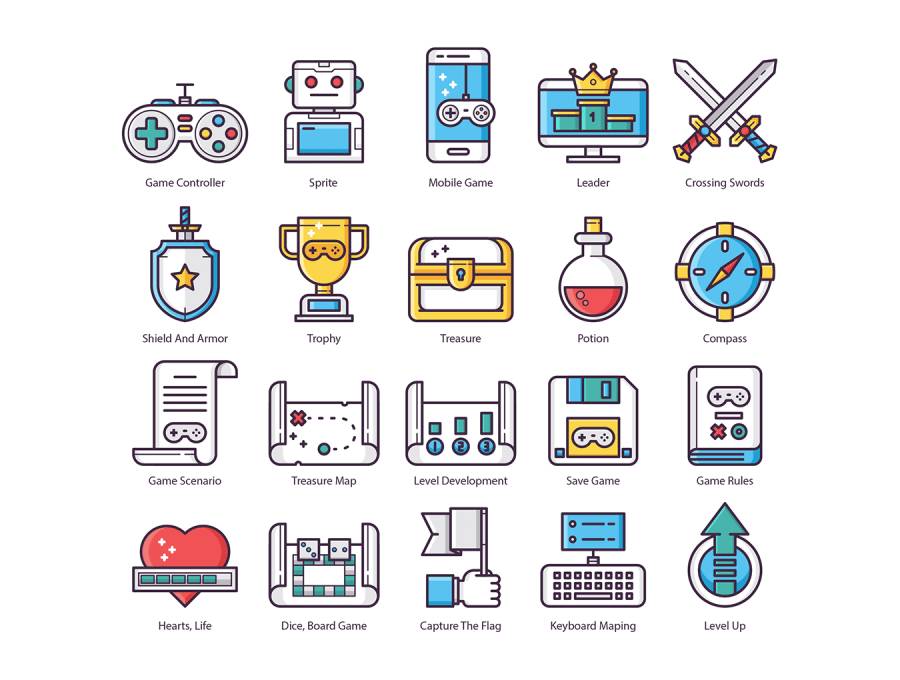 一套65个用于游戏设计主题的多色图标。如果您正在开发游戏设计项目,则此图标集仅适合您。提供AI,EPS,PNG,PSD,SVG。我们的图标是100%矢量,因此它们在Illustrator中完全可编辑和可扩展。