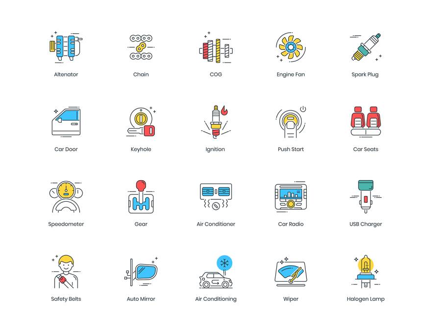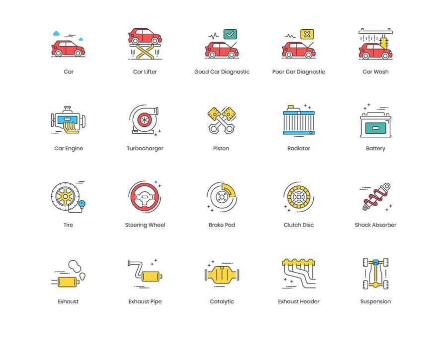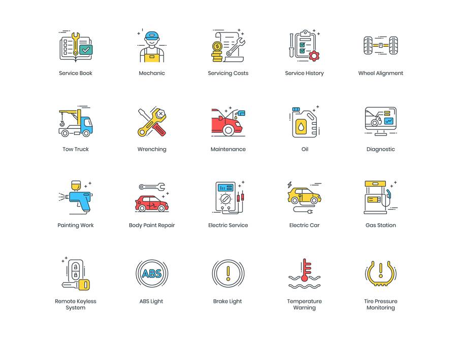 基于67个矢量的彩色线图标的集合,用于汽车服务,维修和保养,车辆汽车零件/备件,仪表板灯符号...图标以5种不同的文件格式提供; AI,PSD,SVG,EPS和PNG。单击顶部的完整预览按钮以查看包含的所有图标。