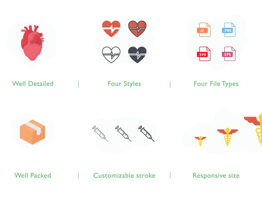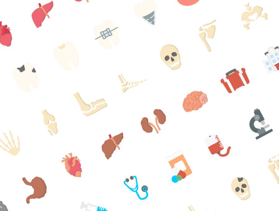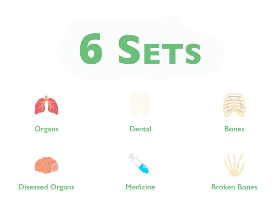 216个医疗总图标; 4种风格的6大类。 36个器官图标,48个牙科图标,36个骨骼图标,36个病态器官图标,48个医学图标,36个骨折图标。图标有Ai,EPS,SVG和PNG格式。