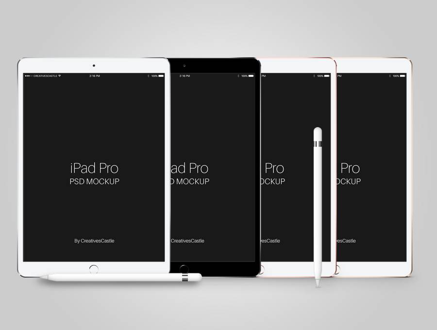 带有4种颜色变化笔的iPad Pro PSD样机。带笔的iPad Pro