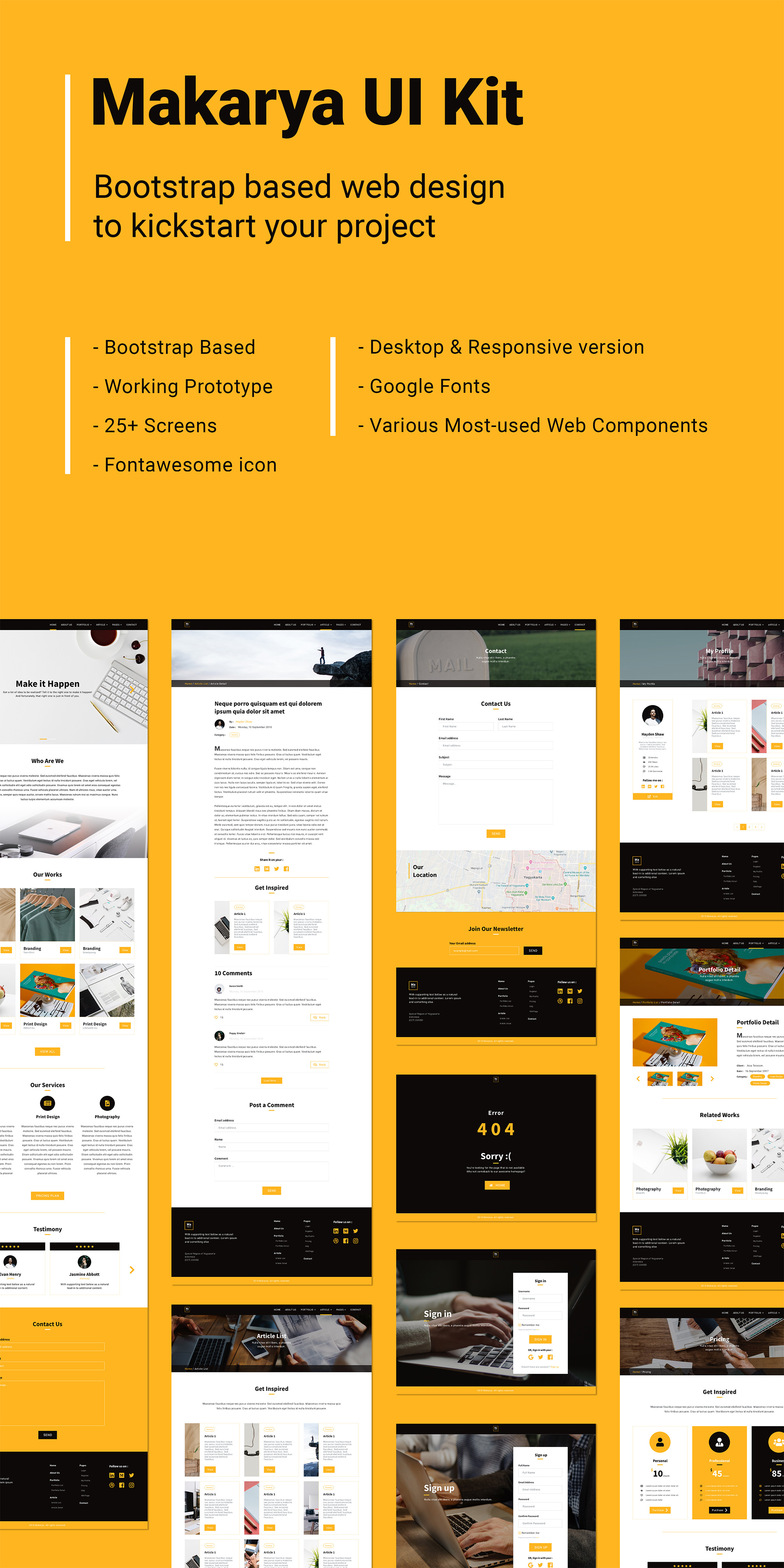 这个Makarya UI工具包包含网站页面设计(包括桌面和响应版本),可以帮助您启动项目。 不仅如此,该设计还基于bootstrap,还使用了Google Font&Fontawesome图标。 最有趣的部分是,所有页面设计都与Adobe XD提供的原型相关联。