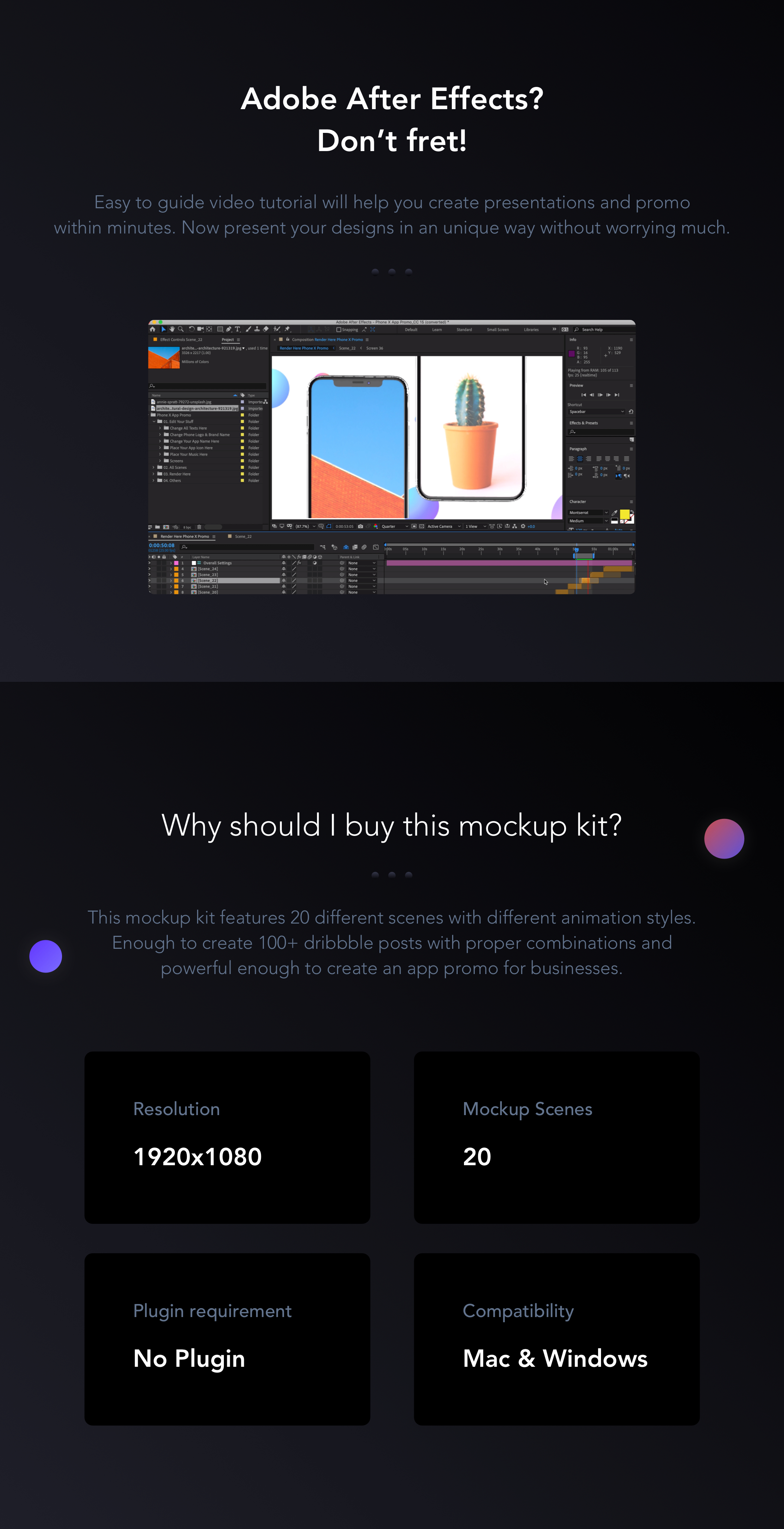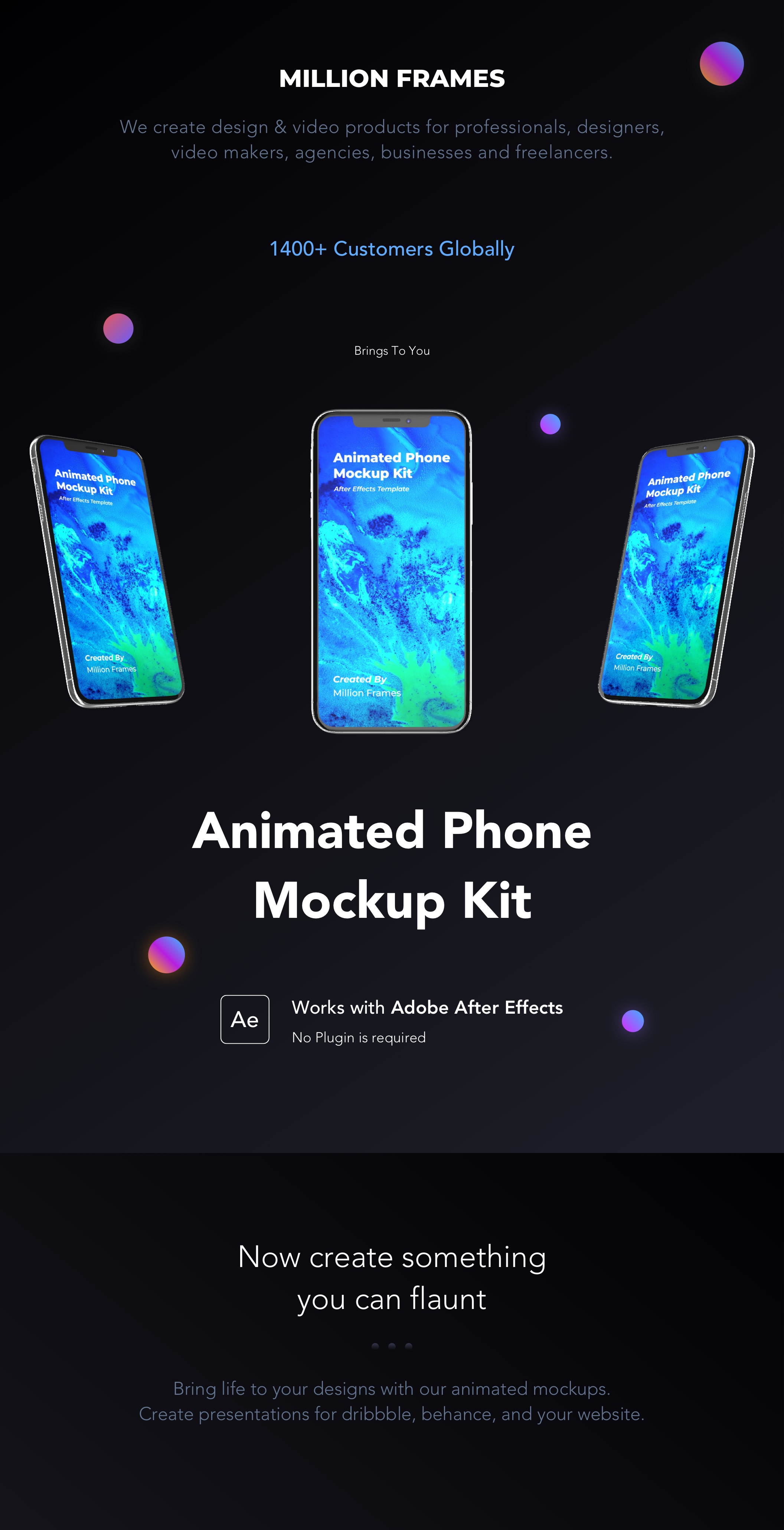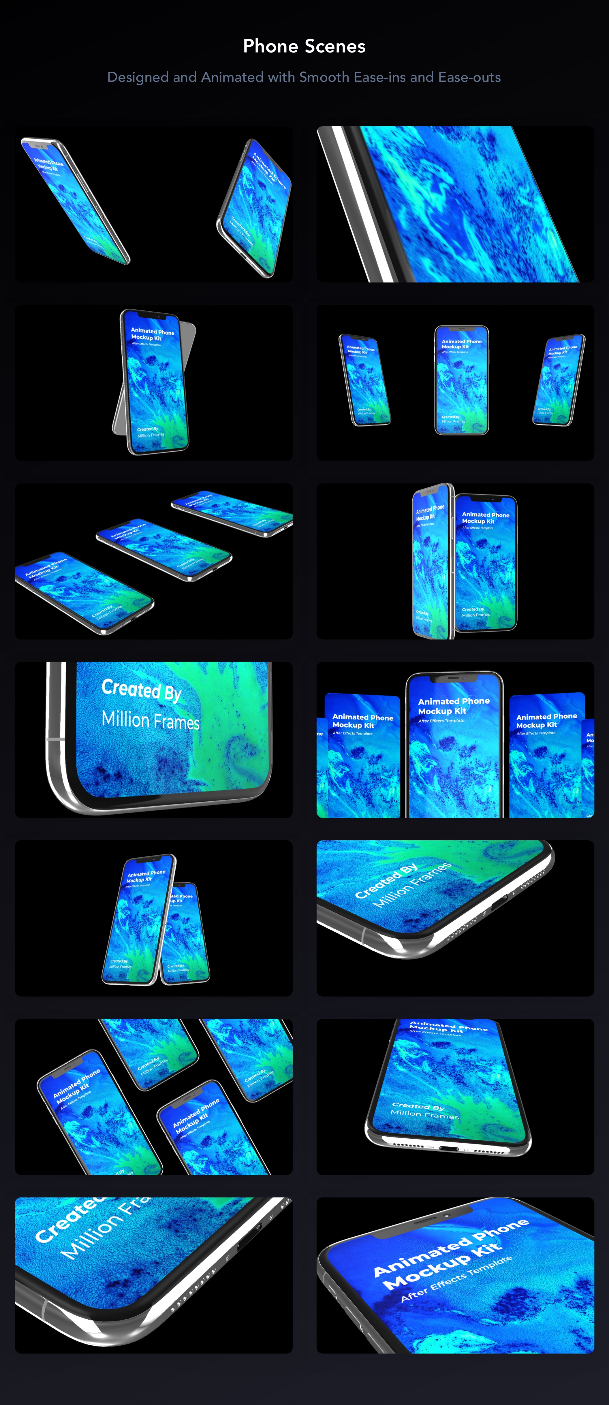 Combine it with other mockups and create your own army of display mockups. It is compatible with Adobe After Effects and it doesn't require any 3rd party plugin. You can easily change the screens of the phone mockup with just dragging and dropping inside a particular composition. Hope you love using it in your process.