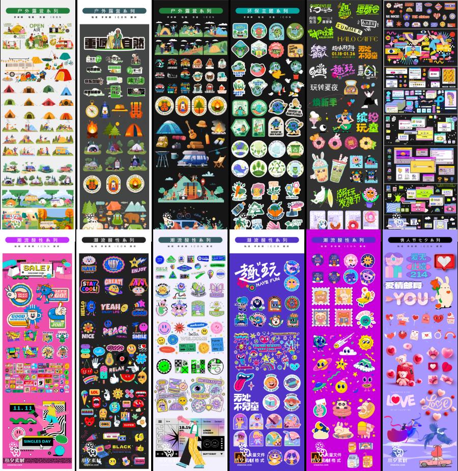 12套潮流酸性趣味卡通户外露营环保节日插画手举牌贴纸ai矢量设计素材