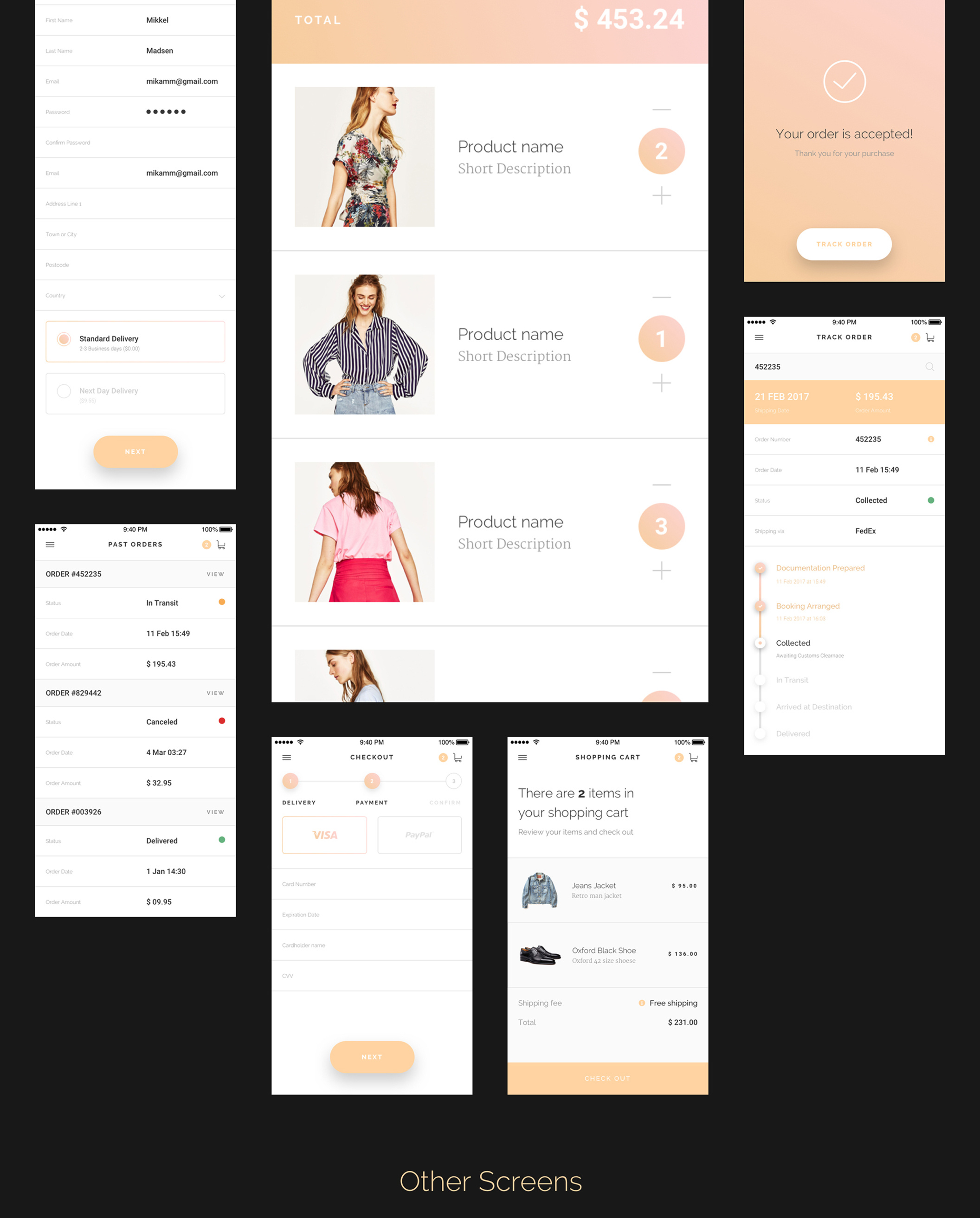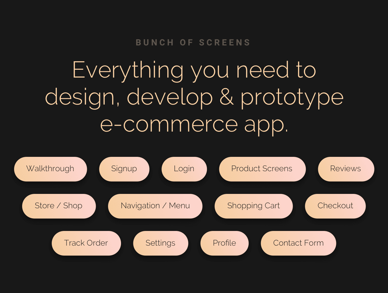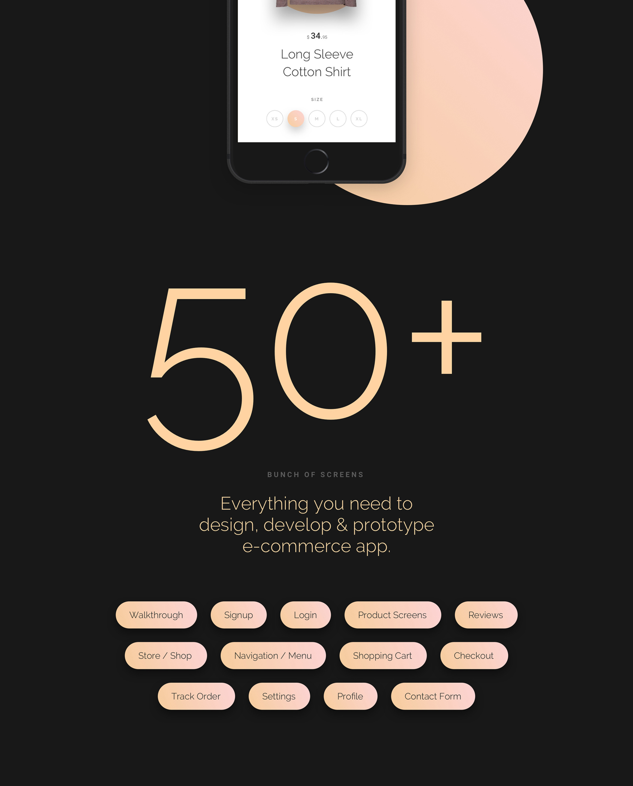 在这个用户界面工具包中,您可以找到10个不同的屏幕来展示您的产品,完整的结帐流程,用于跟踪订单,设置,商店,商店等的屏幕。