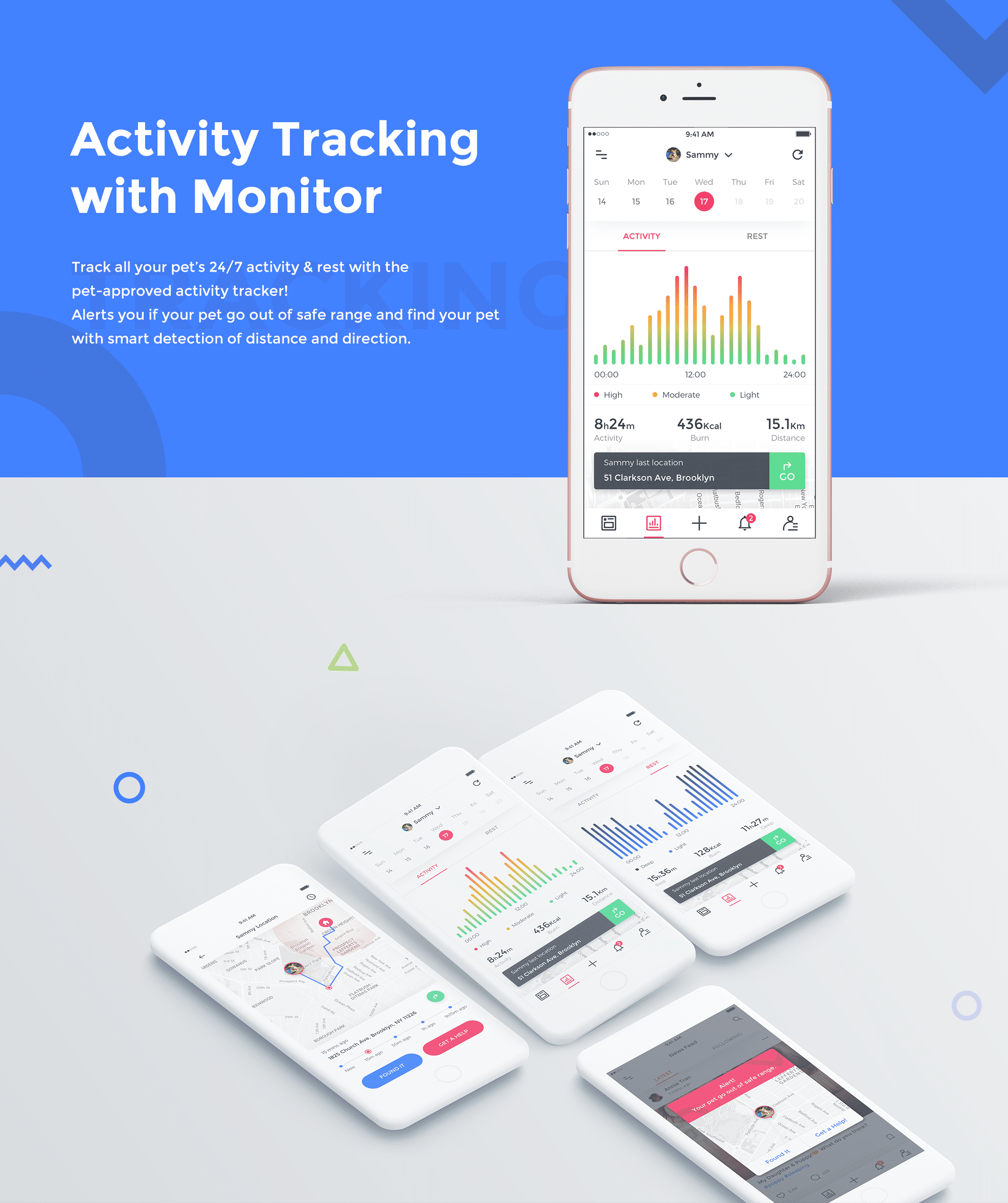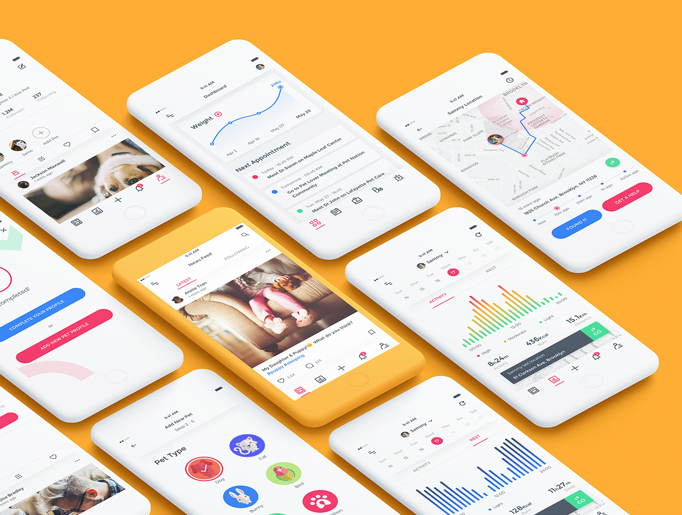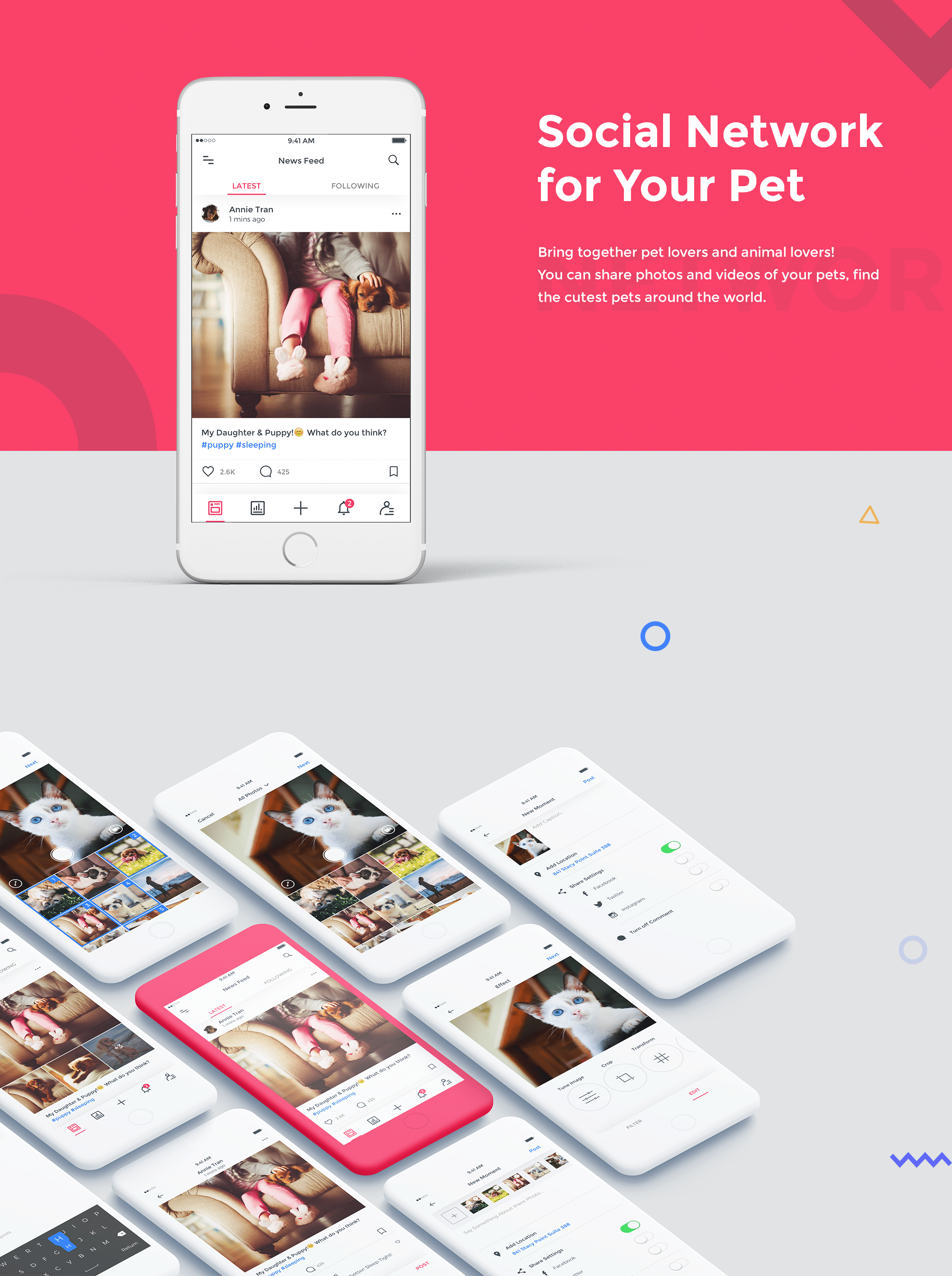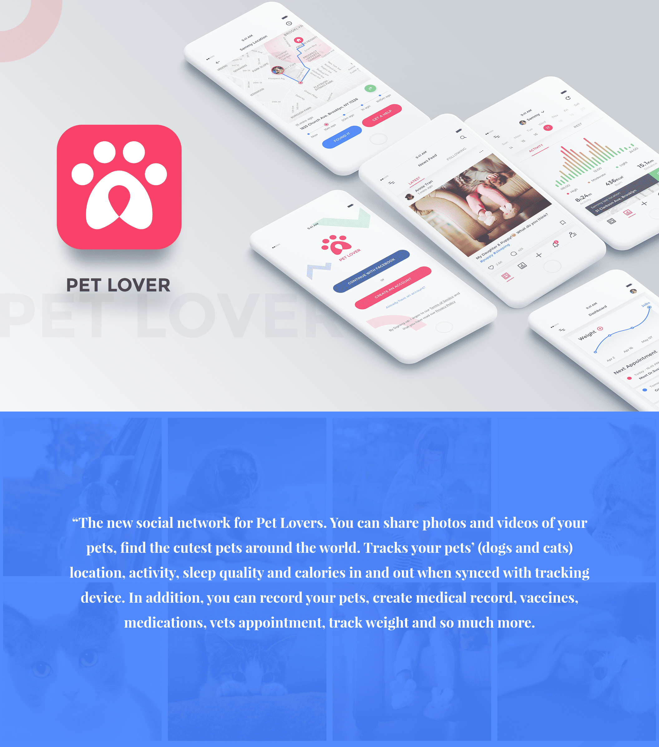 宠物爱好者新的社交网络。你可以分享你的宠物的照片和视频,找到世界上最可爱的宠物。跟踪您的宠物(狗和猫)的位置(通知您,如果您的宠物超出安全范围),活动,睡眠质量和卡路里与跟踪设备同步进出。此外,您可以记录您的宠物,创建病历,疫苗,药物,兽医预约,跟踪重量等等。此UI工具包包含80个独特的iOS屏幕,在Sketch和Adobe XD中设计。