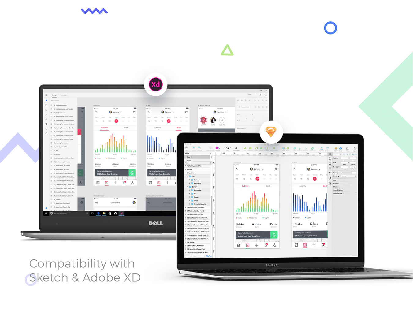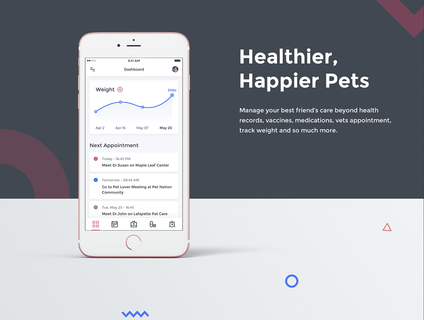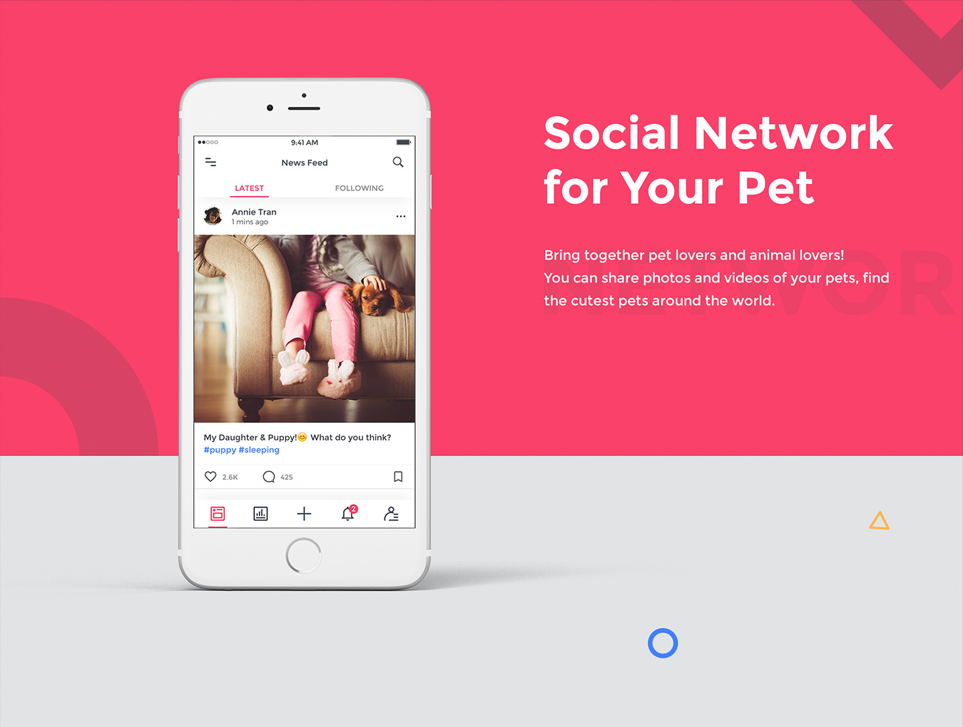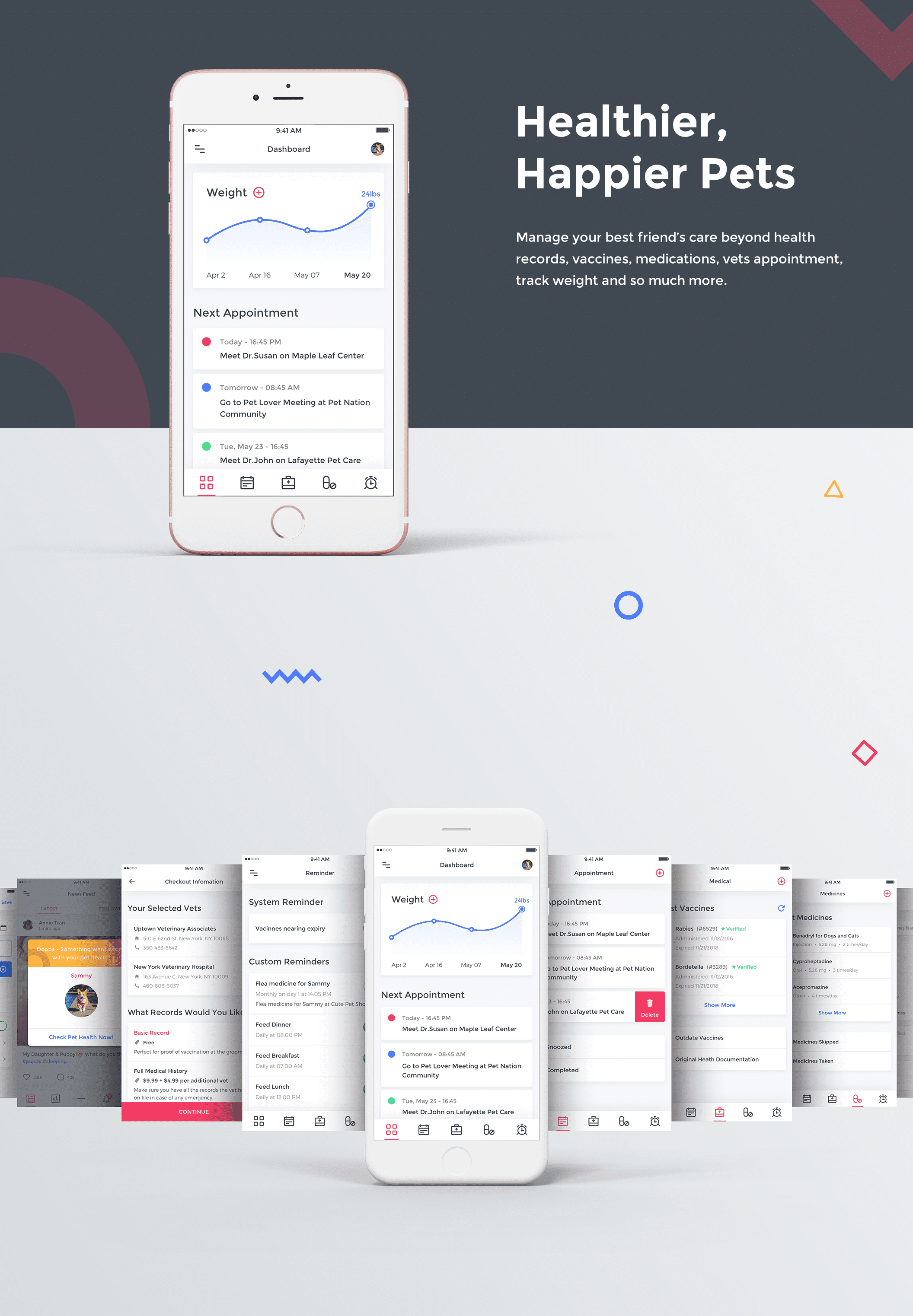 宠物爱好者新的社交网络。你可以分享你的宠物的照片和视频,找到世界上最可爱的宠物。跟踪您的宠物(狗和猫)的位置(通知您,如果您的宠物超出安全范围),活动,睡眠质量和卡路里与跟踪设备同步进出。此外,您可以记录您的宠物,创建病历,疫苗,药物,兽医预约,跟踪重量等等。此UI工具包包含80个独特的iOS屏幕,在Sketch和Adobe XD中设计。
