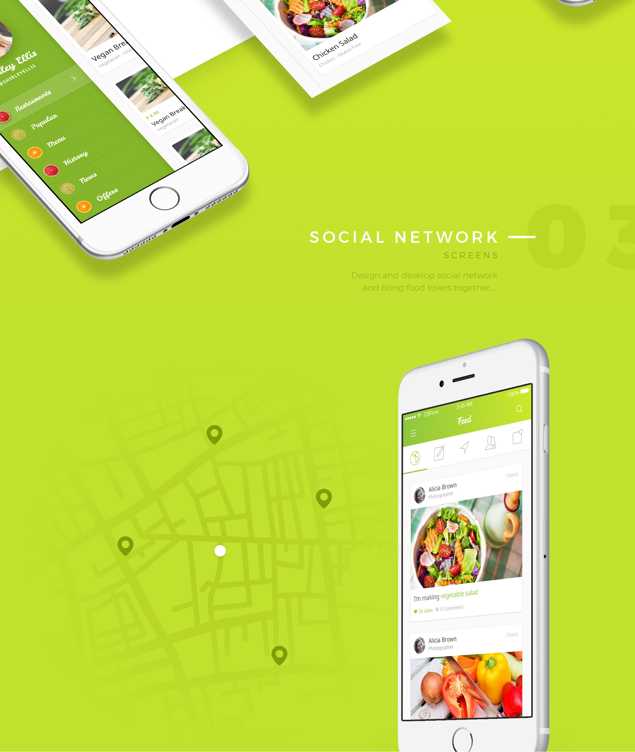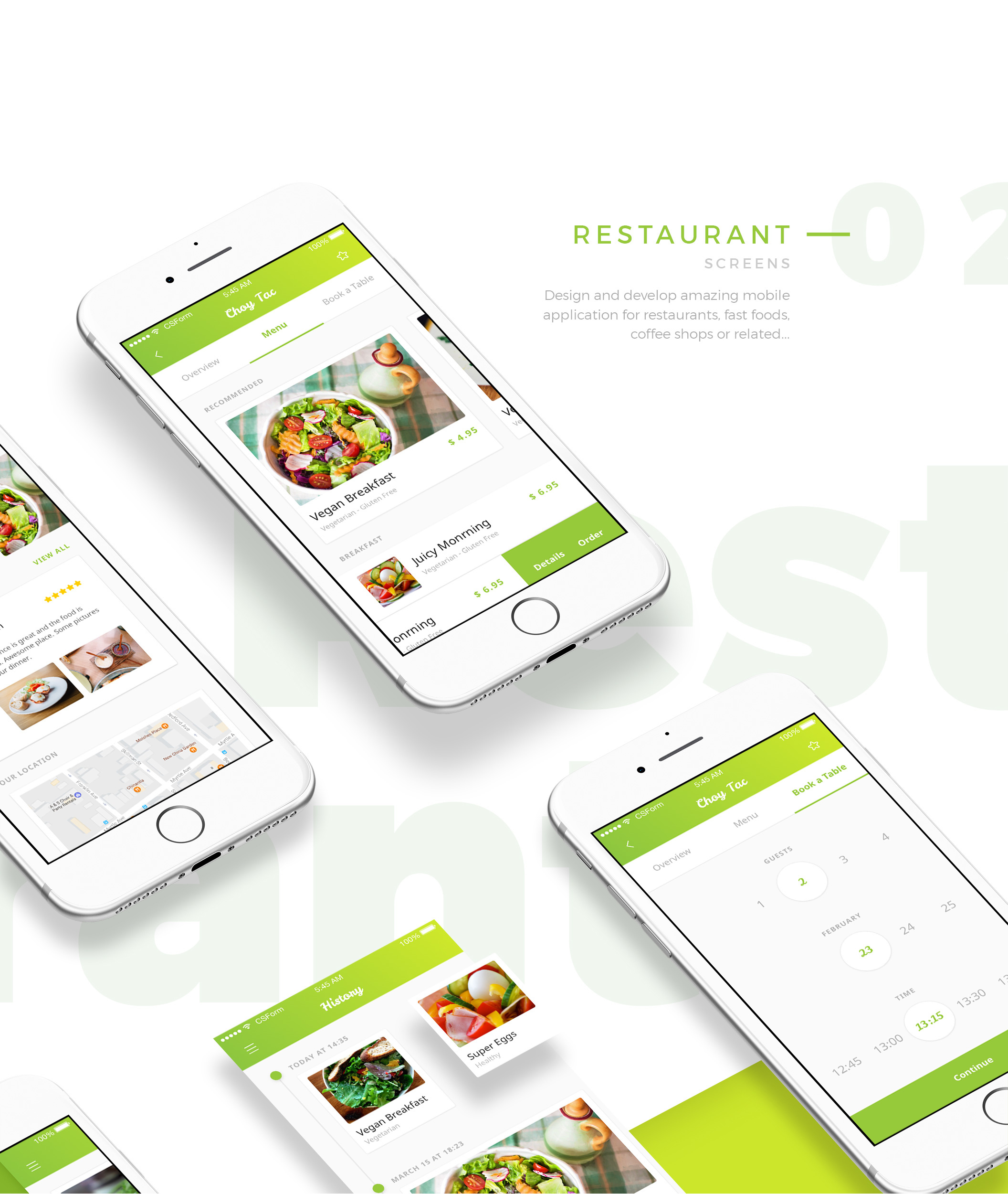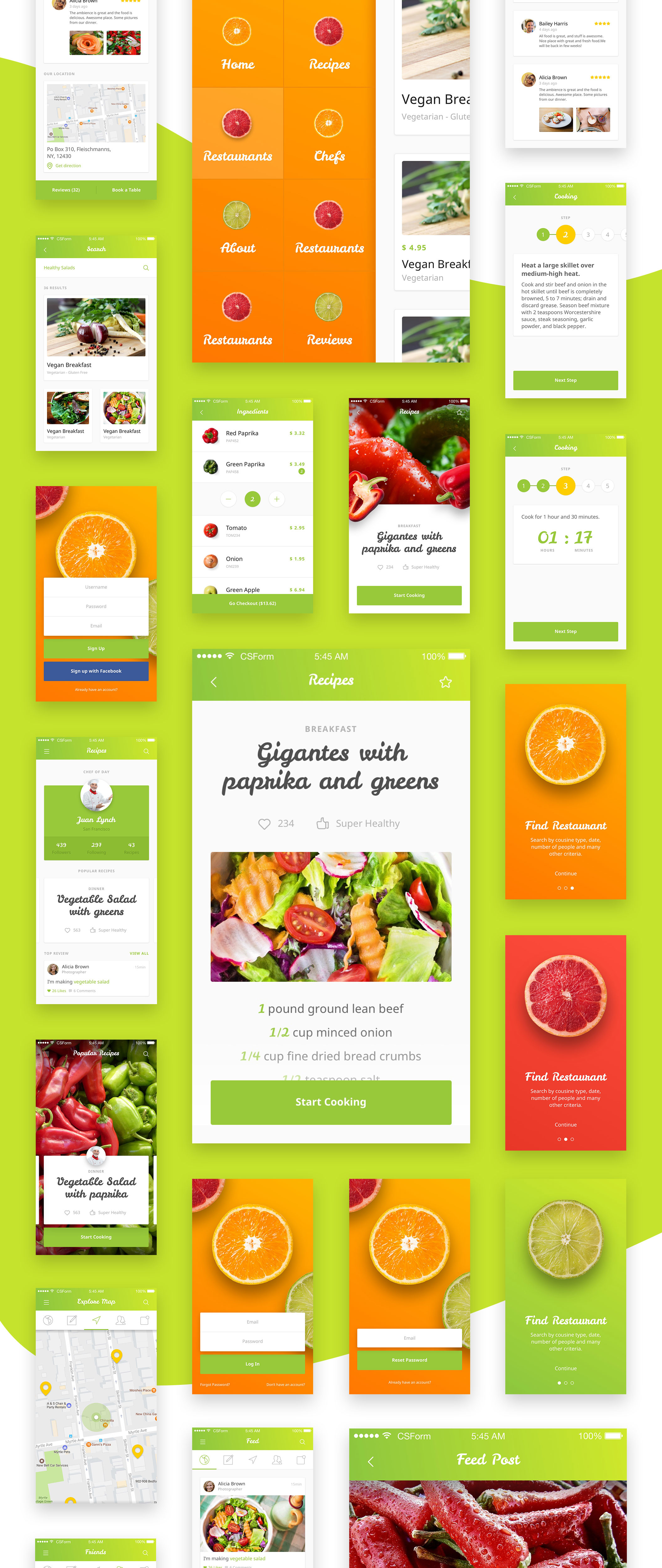 创建有机健康食品餐厅与食品菜单的移动应用程序,预订表过程等等。您还可以为有机和健康食品爱好者设计社交网络应用程序与新闻源,组和通知或设计食谱的应用程序的水果和蔬菜食谱的厨师。您可以通过烹饪过程画面显示食谱。还有一个健康的食品商店的应用程序,蔬菜和水果,购物清单,付款过程和屏幕,您可以在地图上跟踪您的交付。