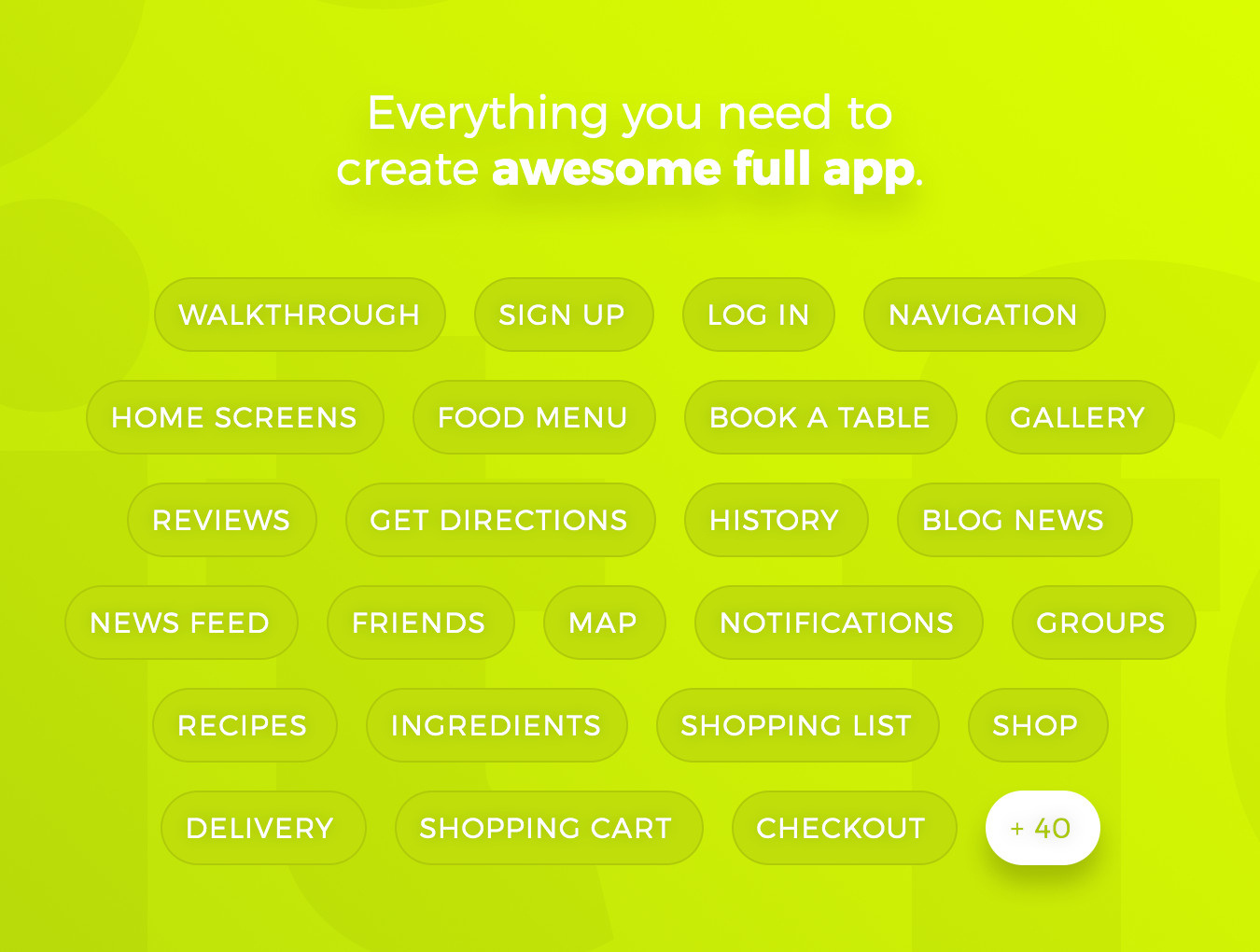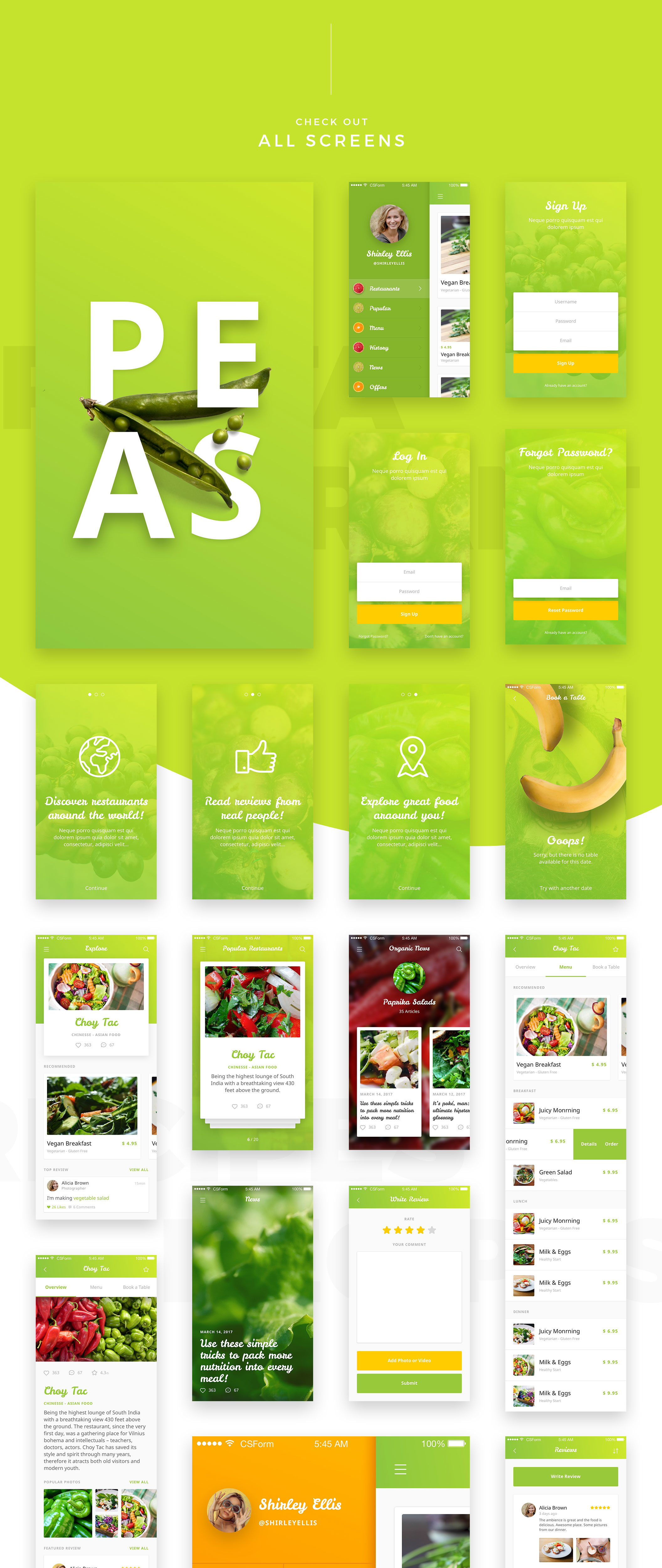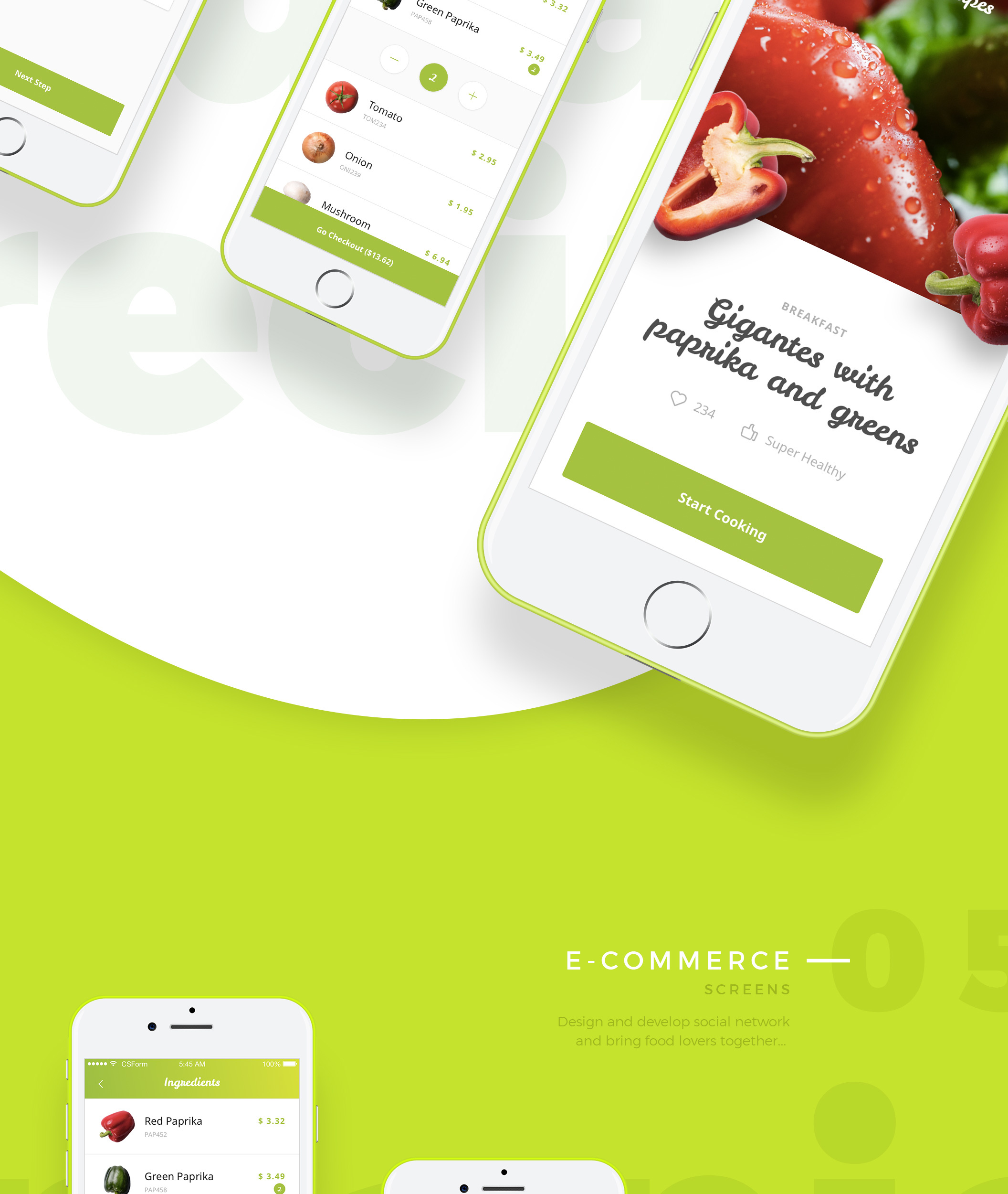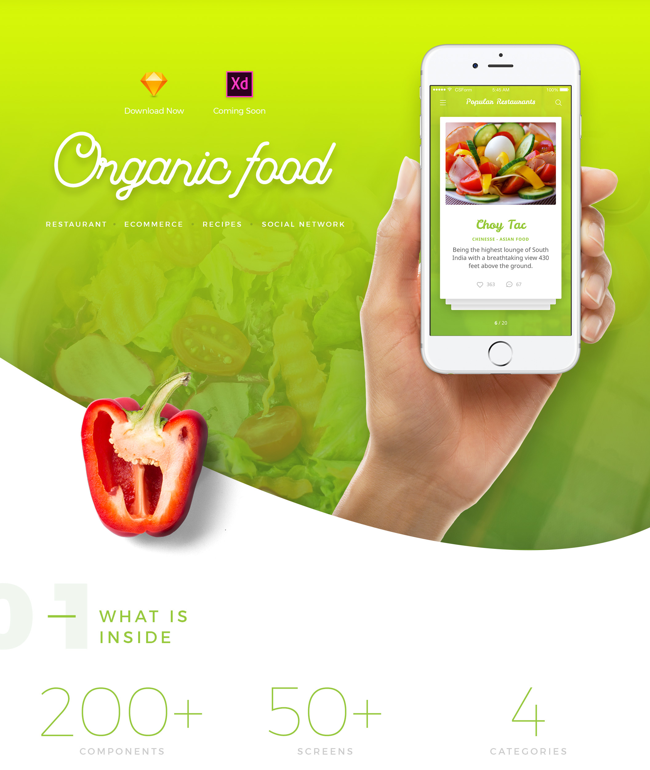 有机食品UI工具包是60+手机屏幕的高品质高级包。设计和开发餐厅,电子商务,食谱或社交网络的应用程序。或者根据您的意愿组合组件,并制作其他应用程序。