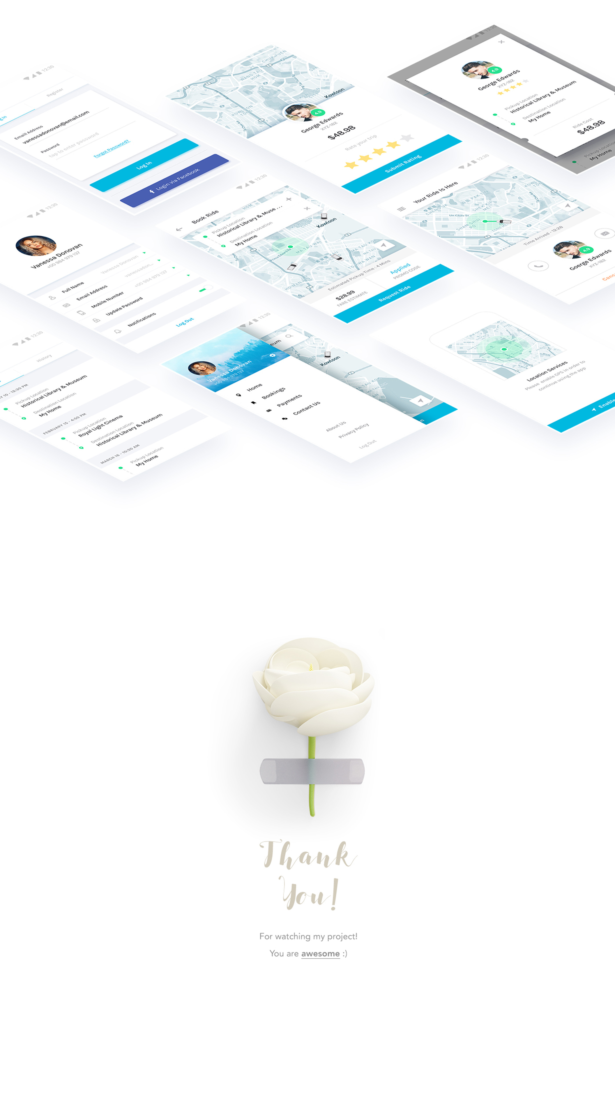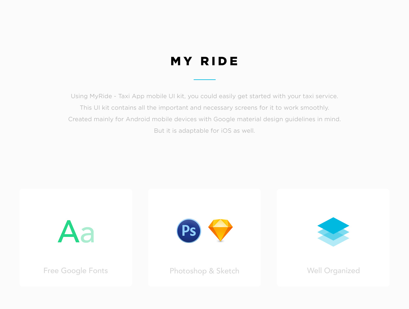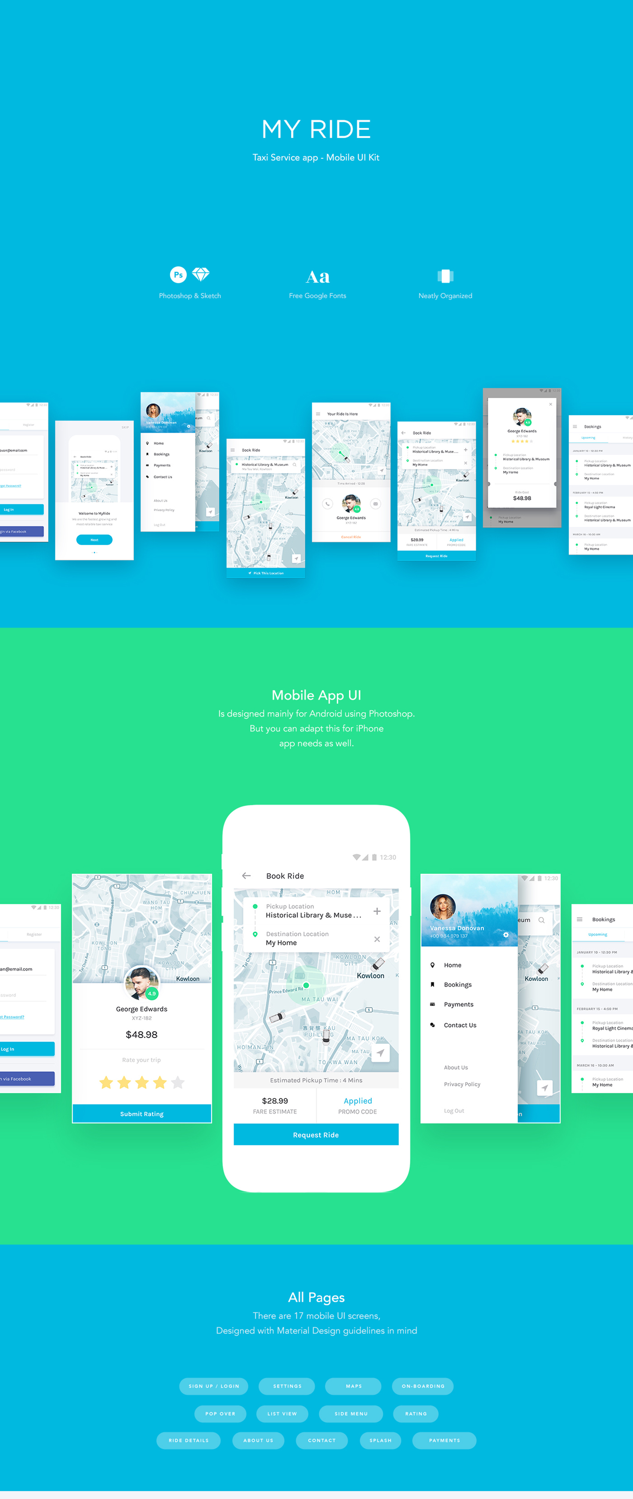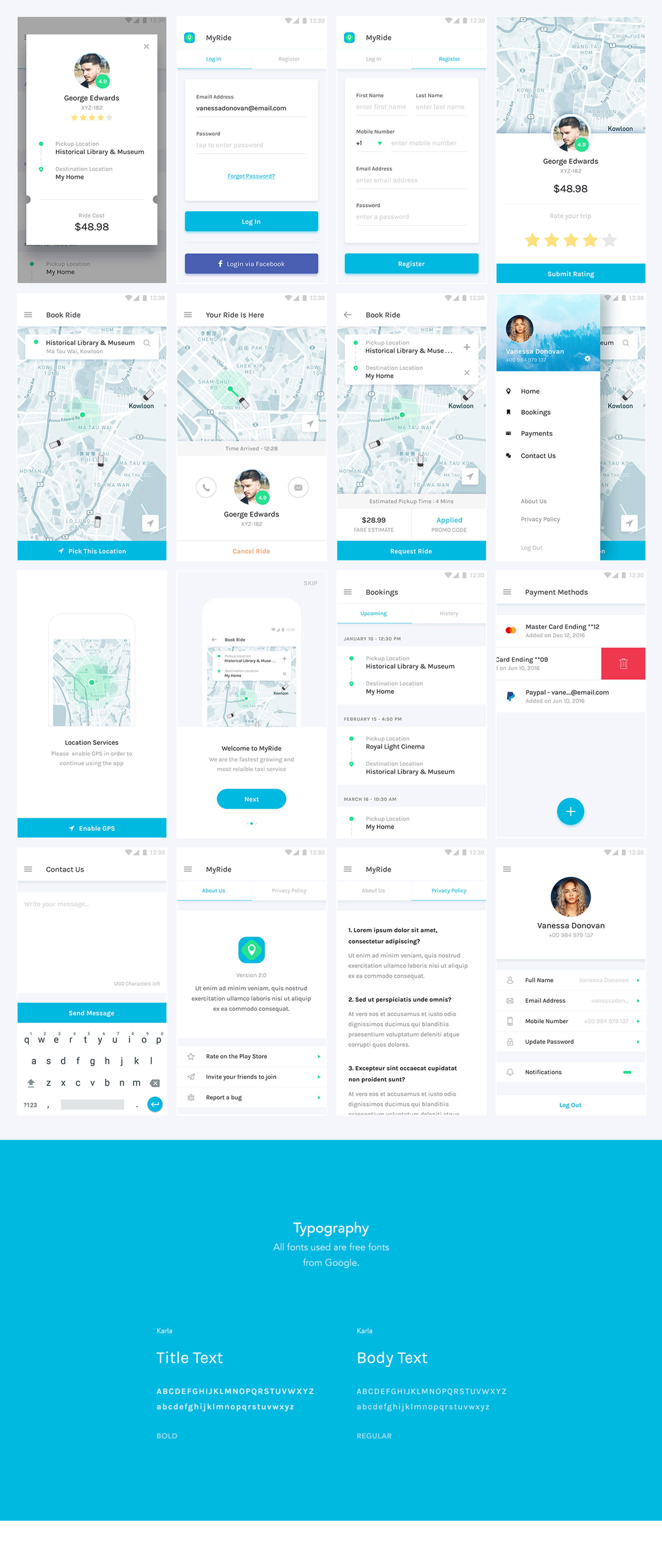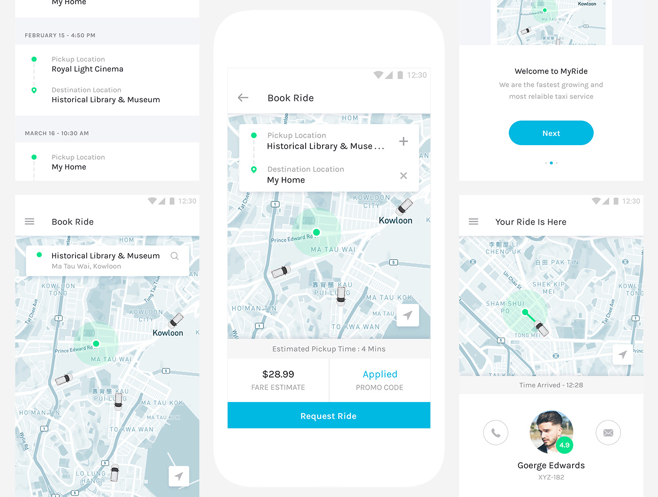 使用My Ride(出租车应用程序移动UI套件),您可以轻松开始使用出租车服务。这个用户界面套件包含17个手机模板,包括所有重要和必要的屏幕,让您的应用程序顺利运行。主要针对Android移动设备,并考虑Google材料设计指南。但它也适用于iOS。