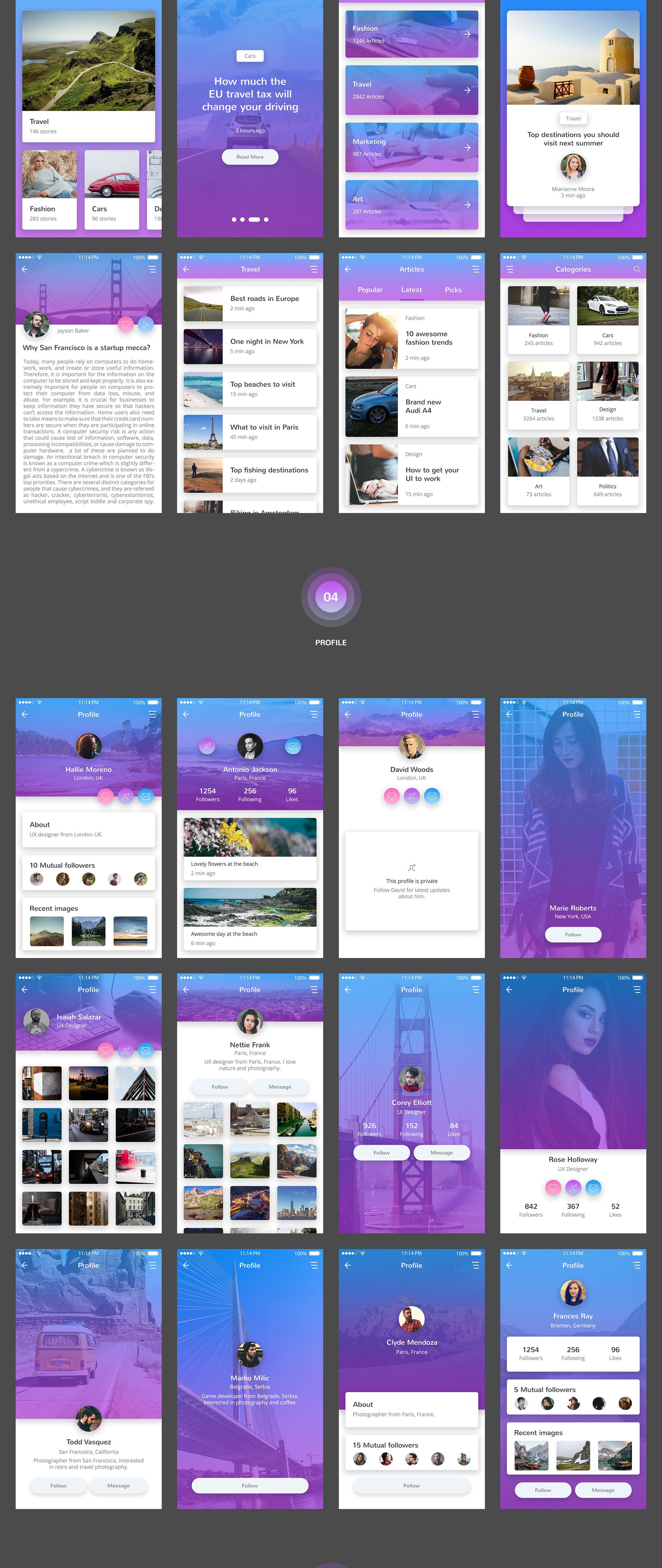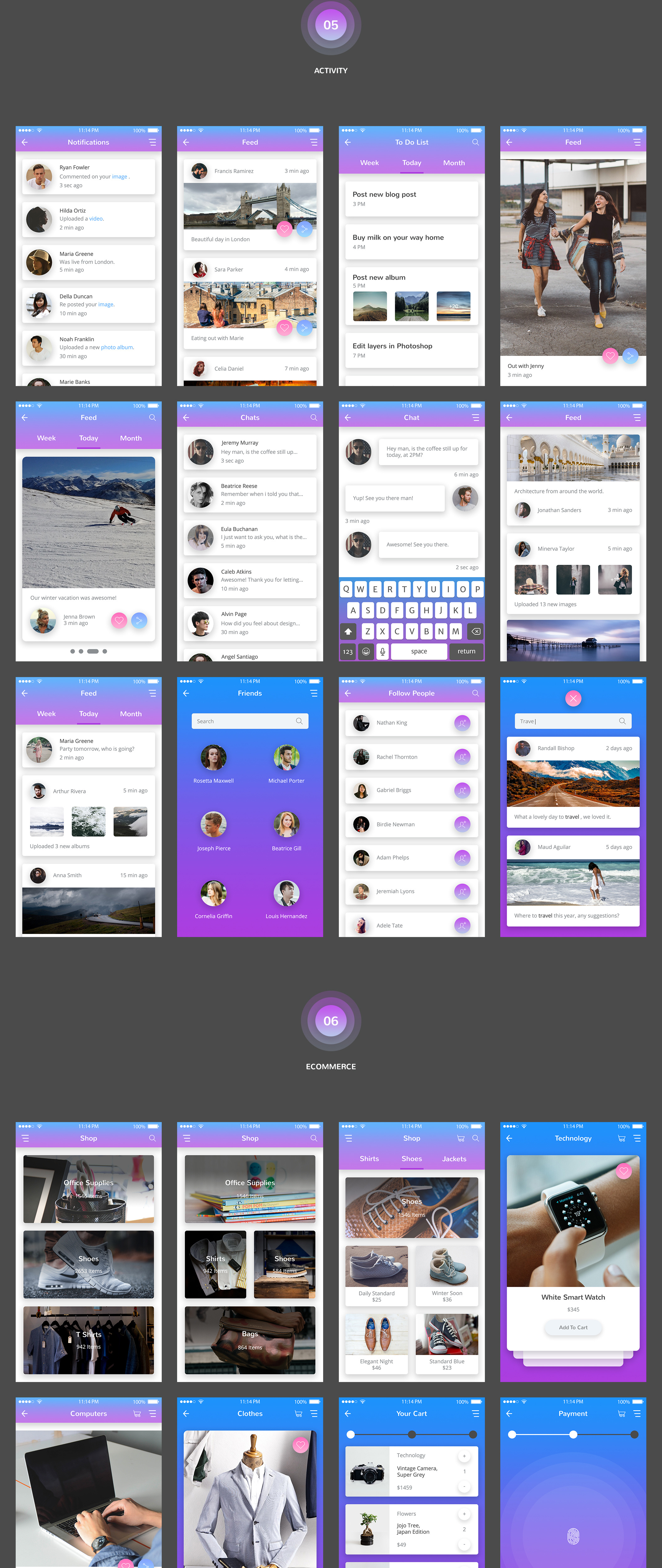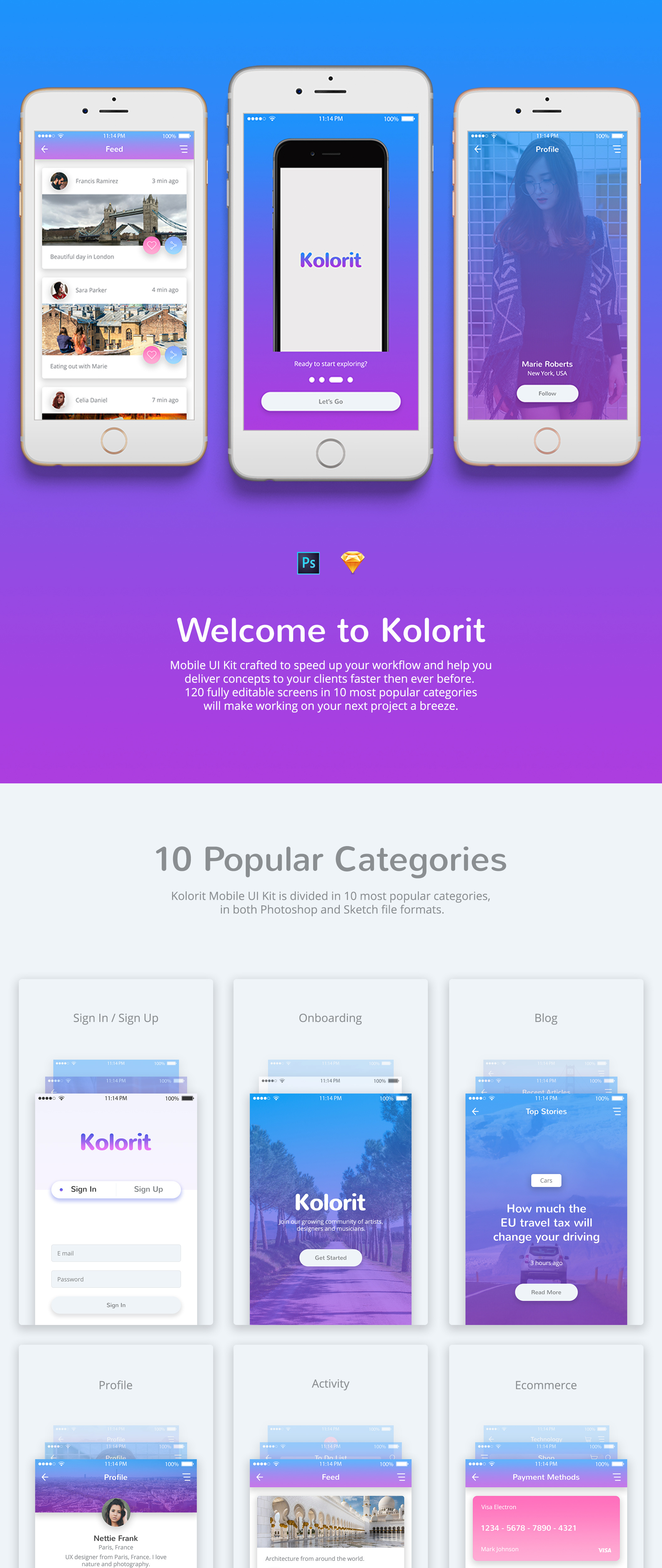 Kolorit移动UI套件是以快速工作流程为基础制作的,所以我们在Photoshop和Sketch中创建了120个可以使用的移动屏幕。您可以为任何复杂的移动项目创建设计,并在几分钟之内将这些设计展示给您的团队或客户。 Kolorit包含1000个UI元素,使用了10个不同的基本类别。超级简单的使用,以提高你的创造力和生产力。如果你愿意的话,你可以把它们上传到InVision,连接它们并把它们作为一个可点击的原型展示给你的客户。