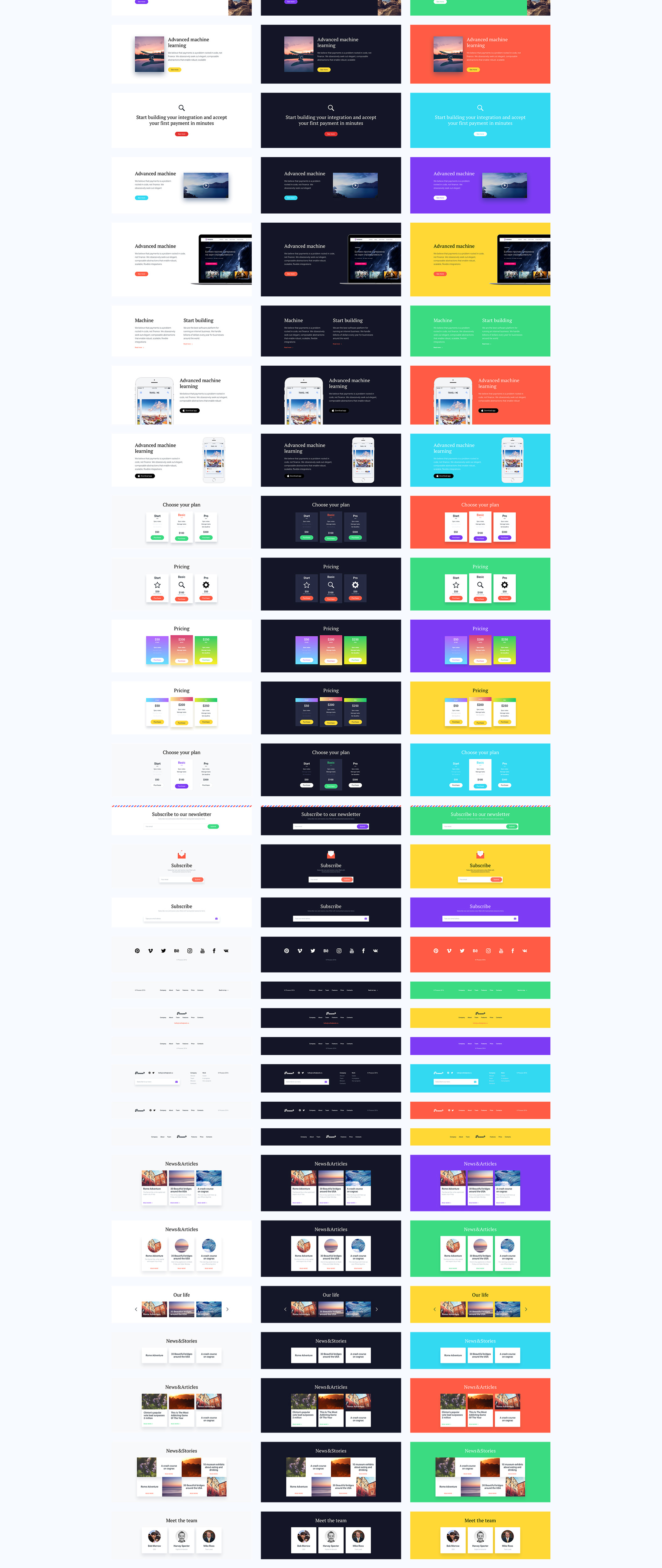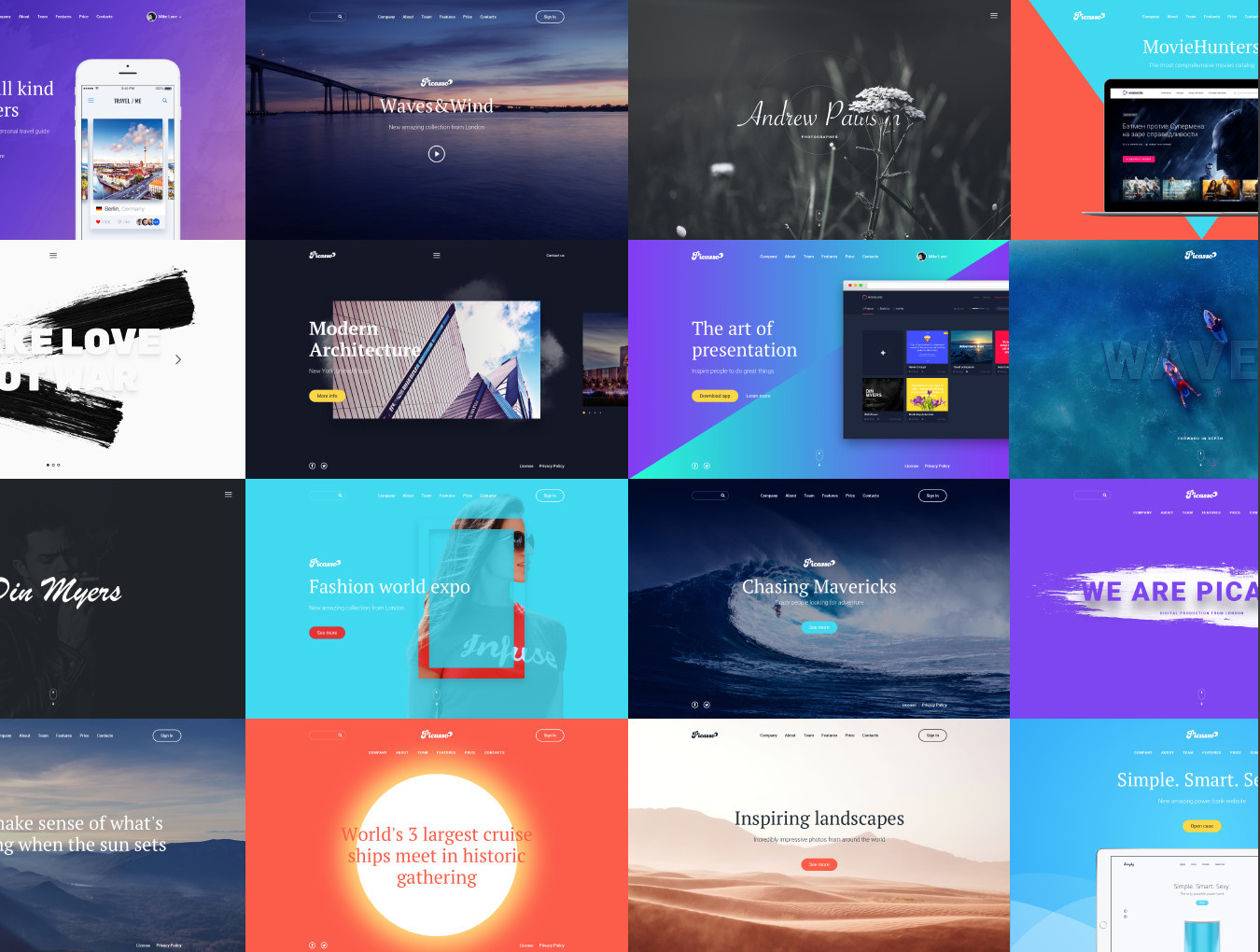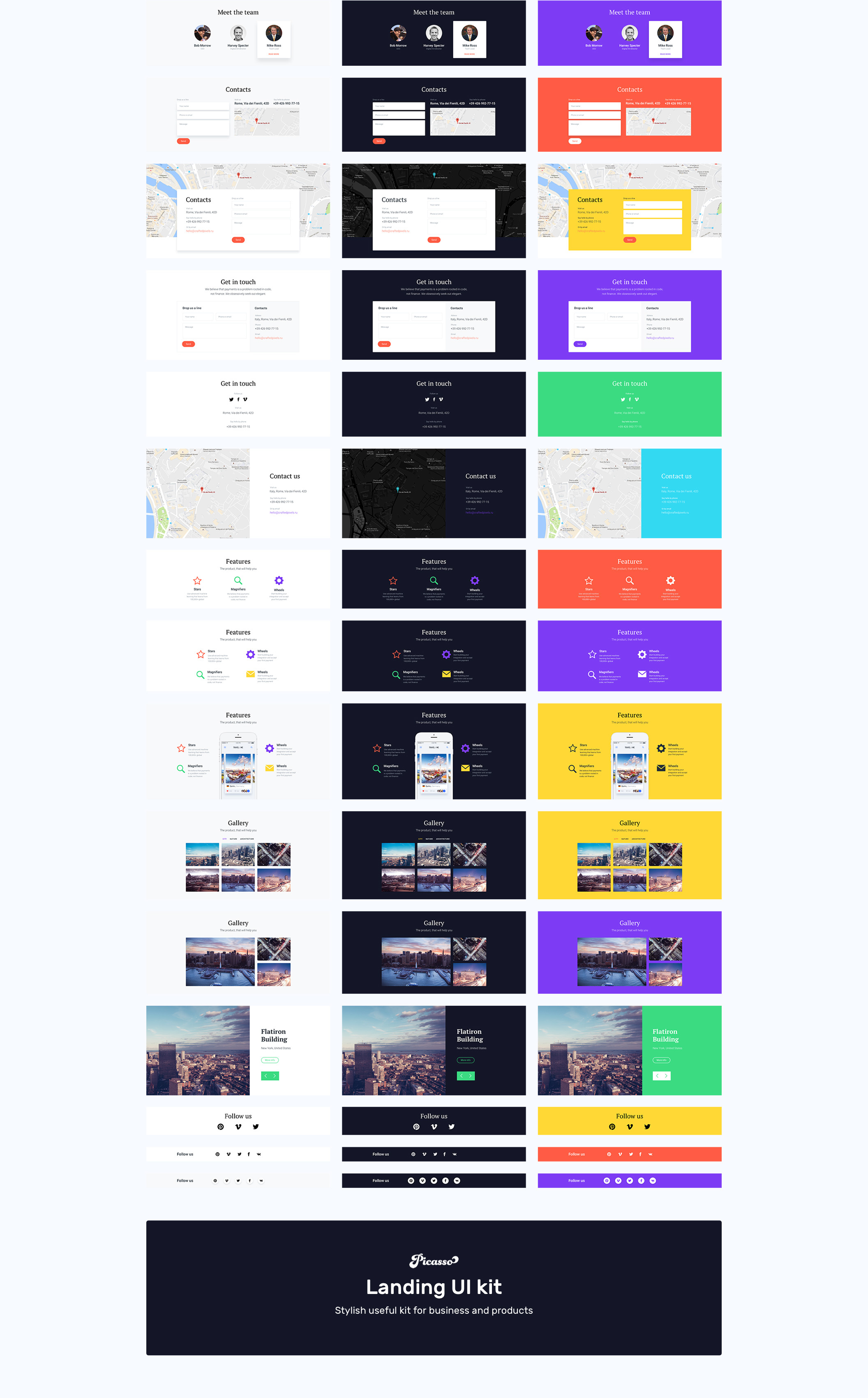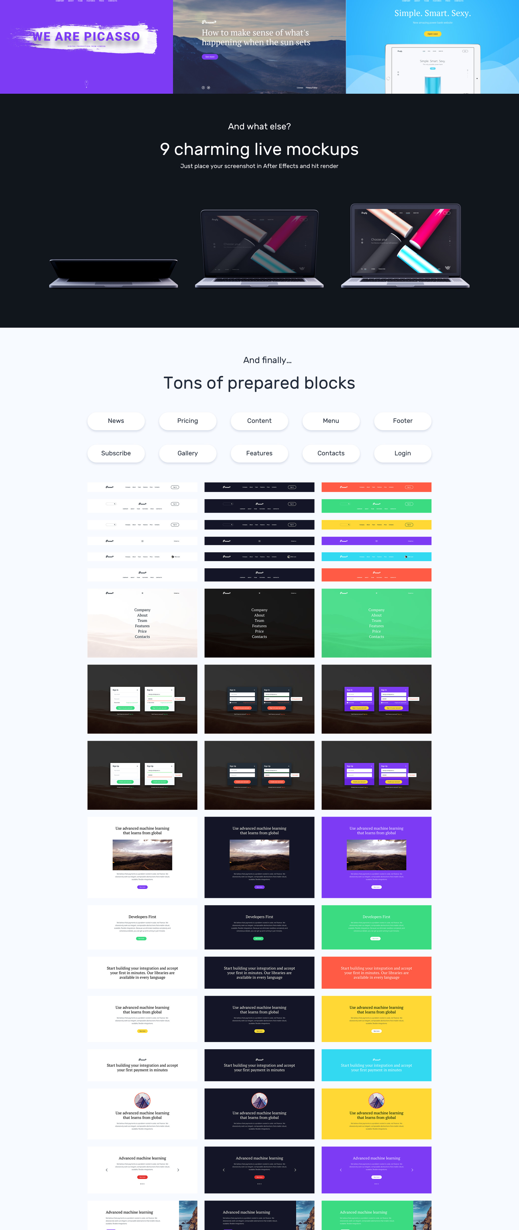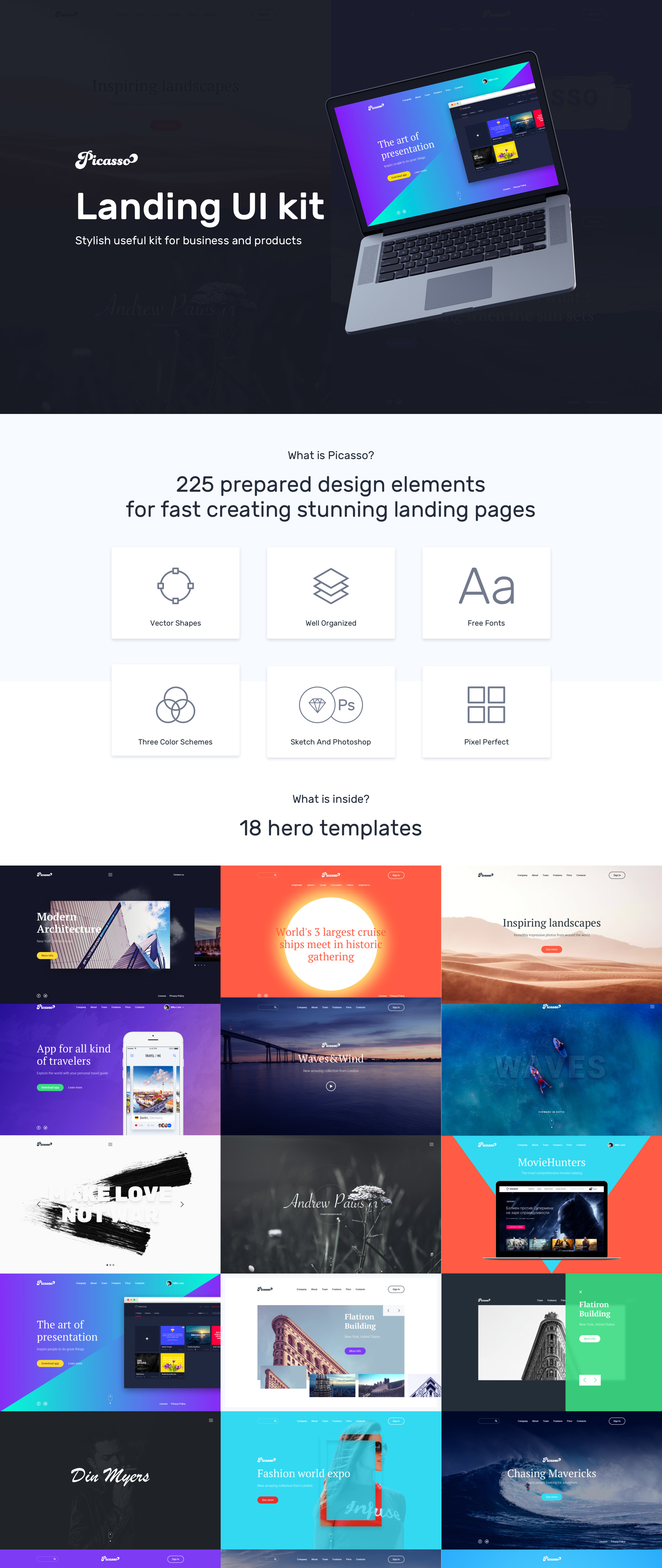 毕加索是一个干净的着陆页用户界面套件设计草图和Photoshop。它适用于商务和数字产品,包括225个为所有场合准备的设计元素 - 18个英雄模板,联系人,功能,页脚等等。此外,毕加索包括9个现场模拟(AEP文件)与一次点击可替换截图以优雅的方式呈现您的应用程序或网站。