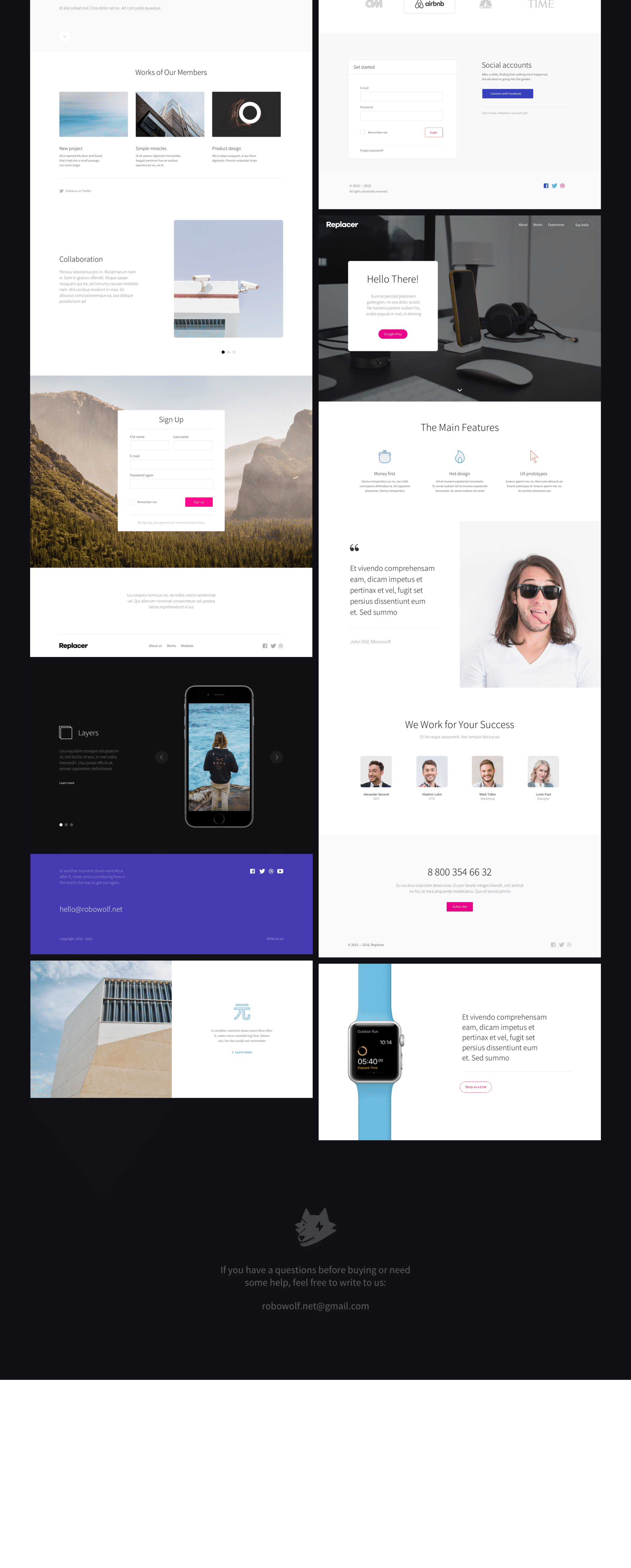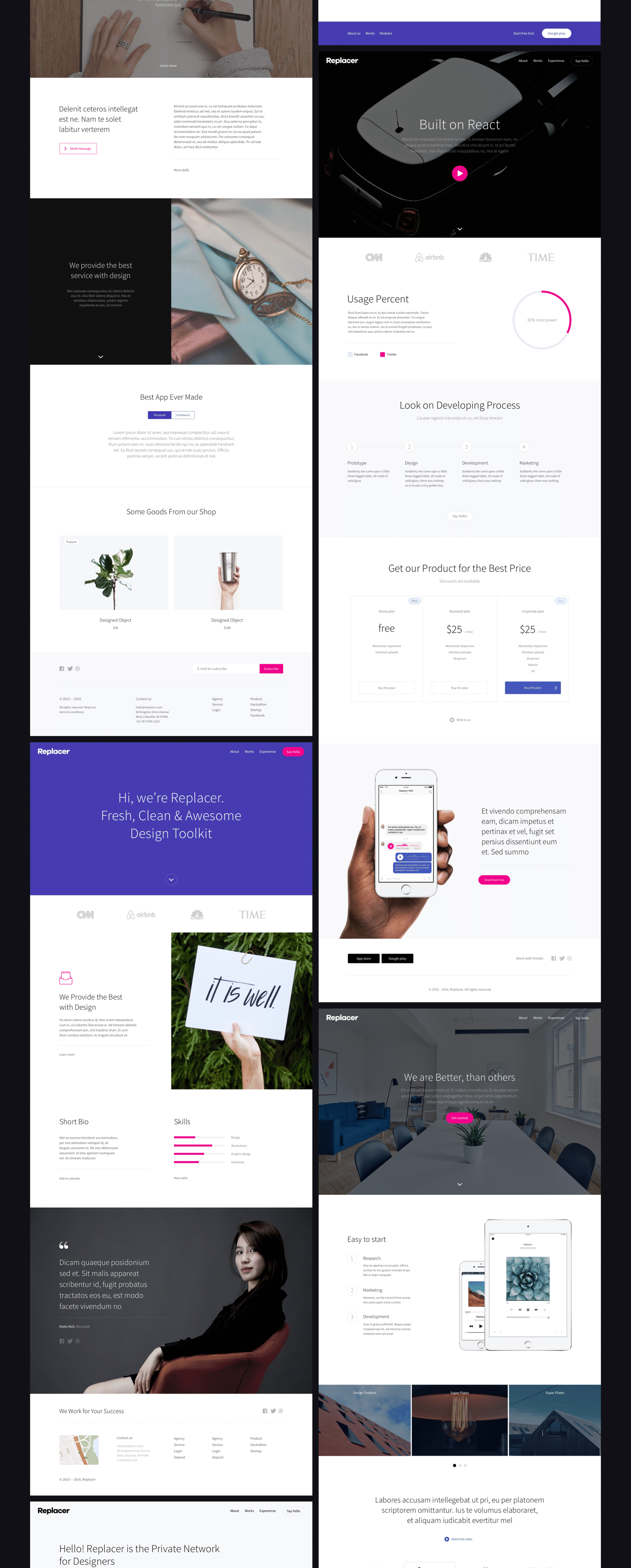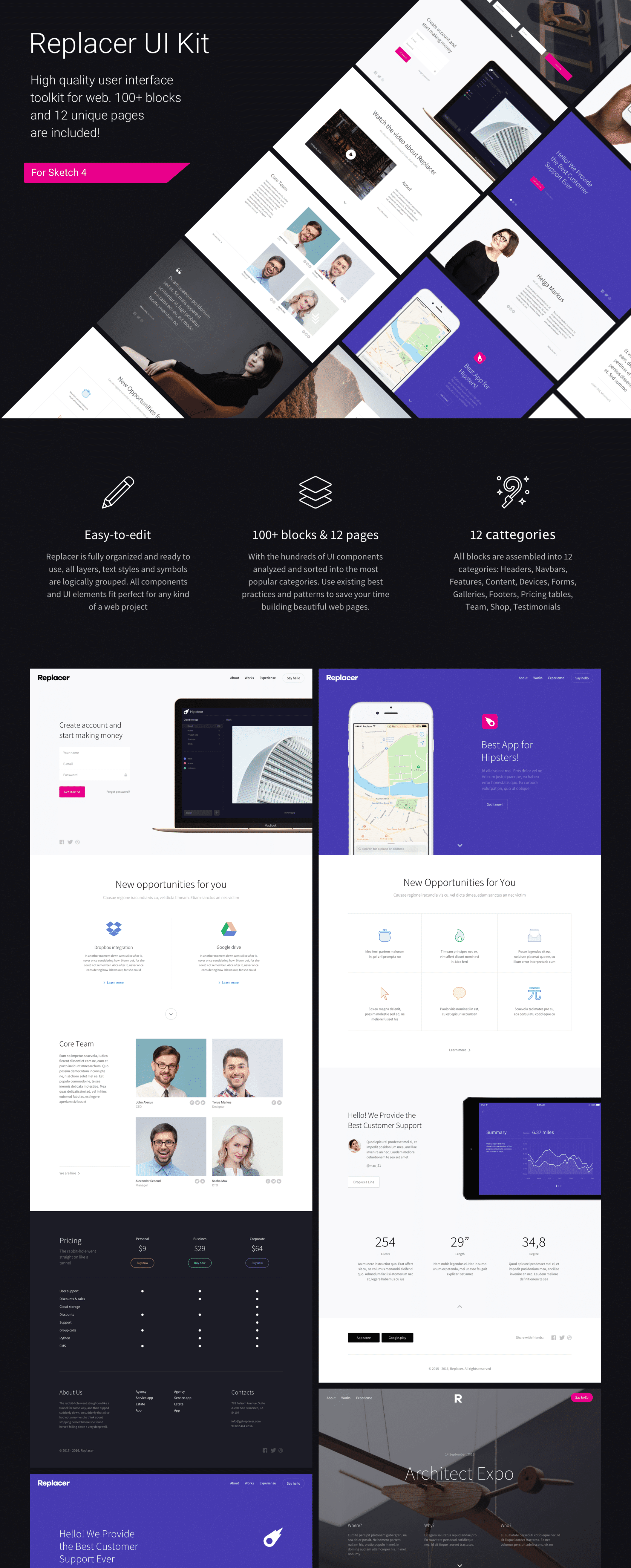 用于网页的高质量用户界面工具包,在Sketch&Photoshop中设计。包含超过100多个精心布局和12个即时可用的模板。适用于各种现代化项目:登陆和产品页面,博客,投资组合,网上商店,商业和企业网站,营销和广告活动。使用Replacer作为您下一个项目的起点。选择类别和布局,自定义任何UI组件,根据自己的意愿进行设置。通过预先设计的布局和模板来提升您的工作流程。 保持冷静&稳定!