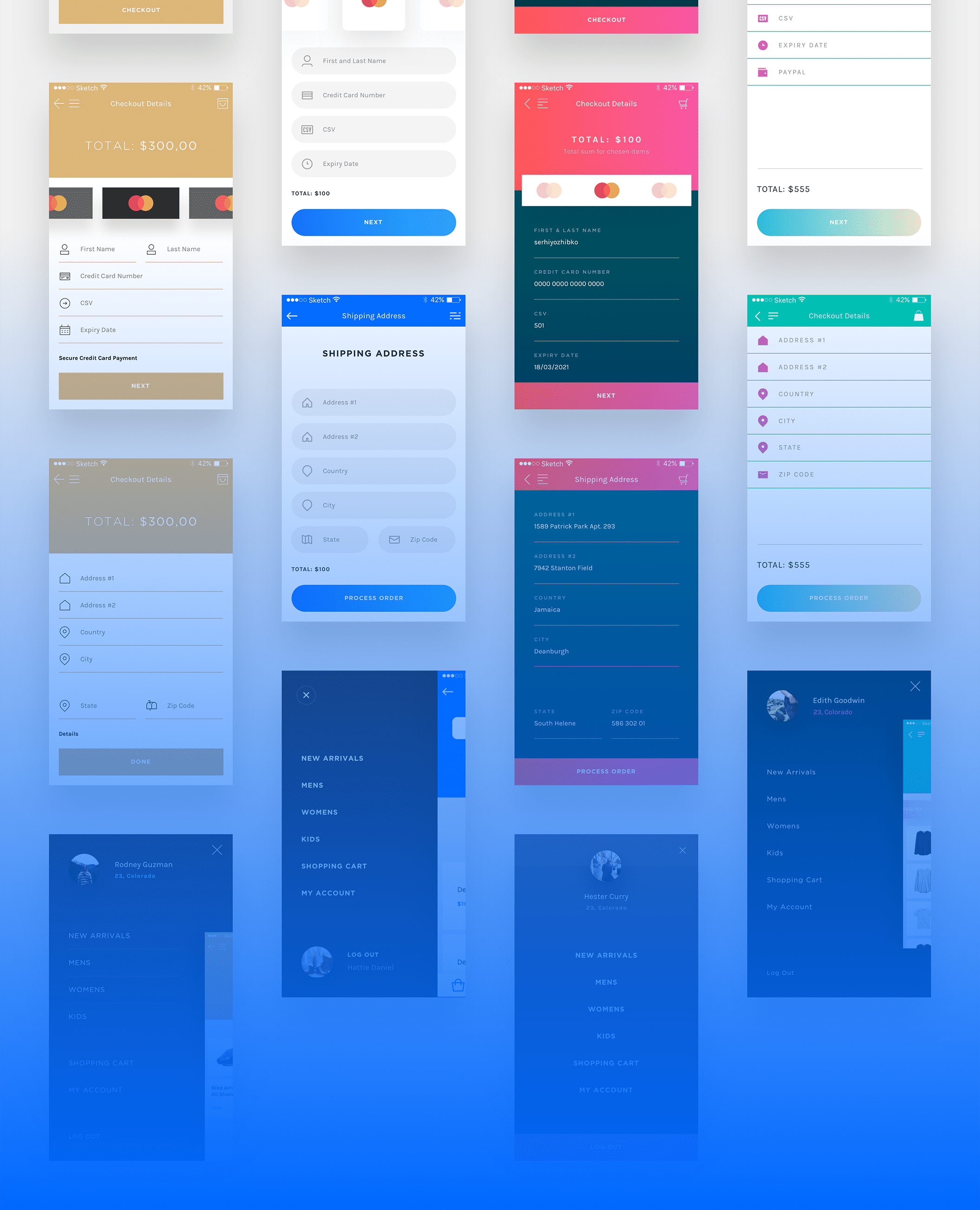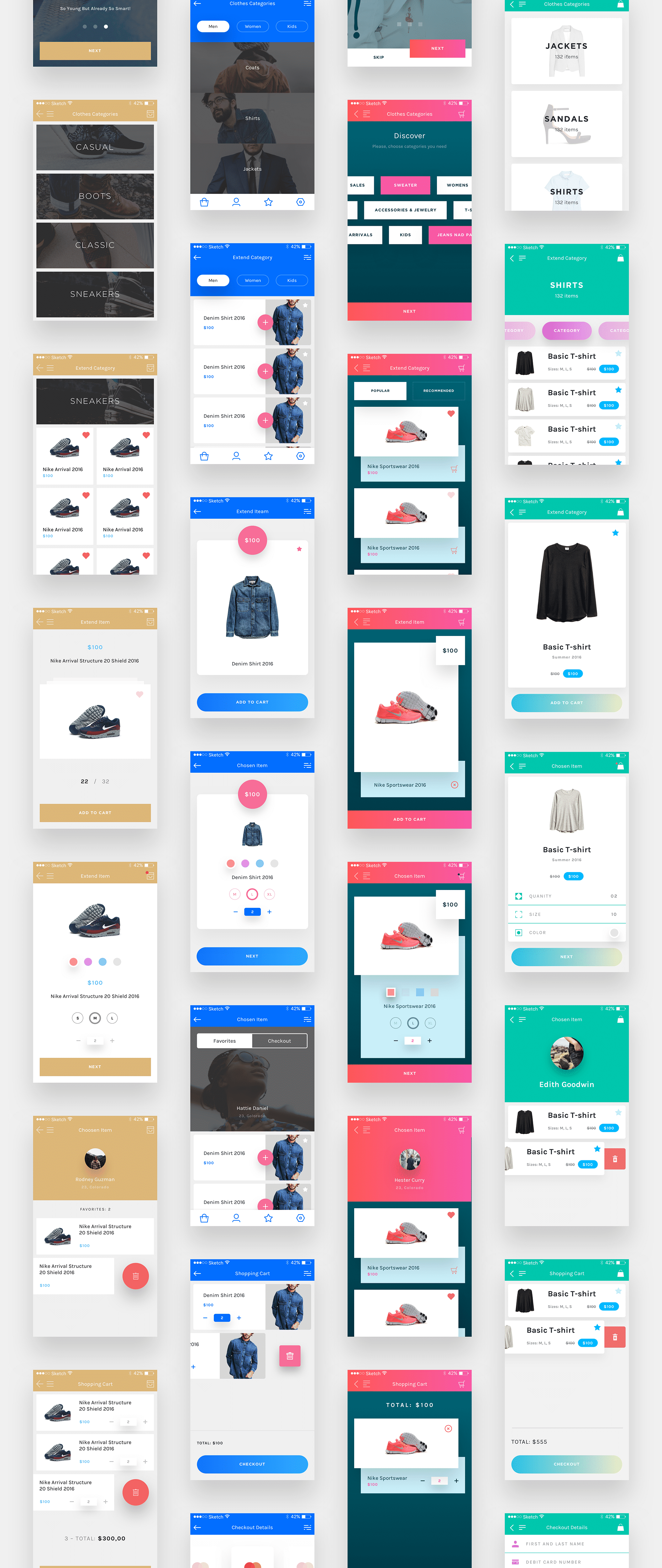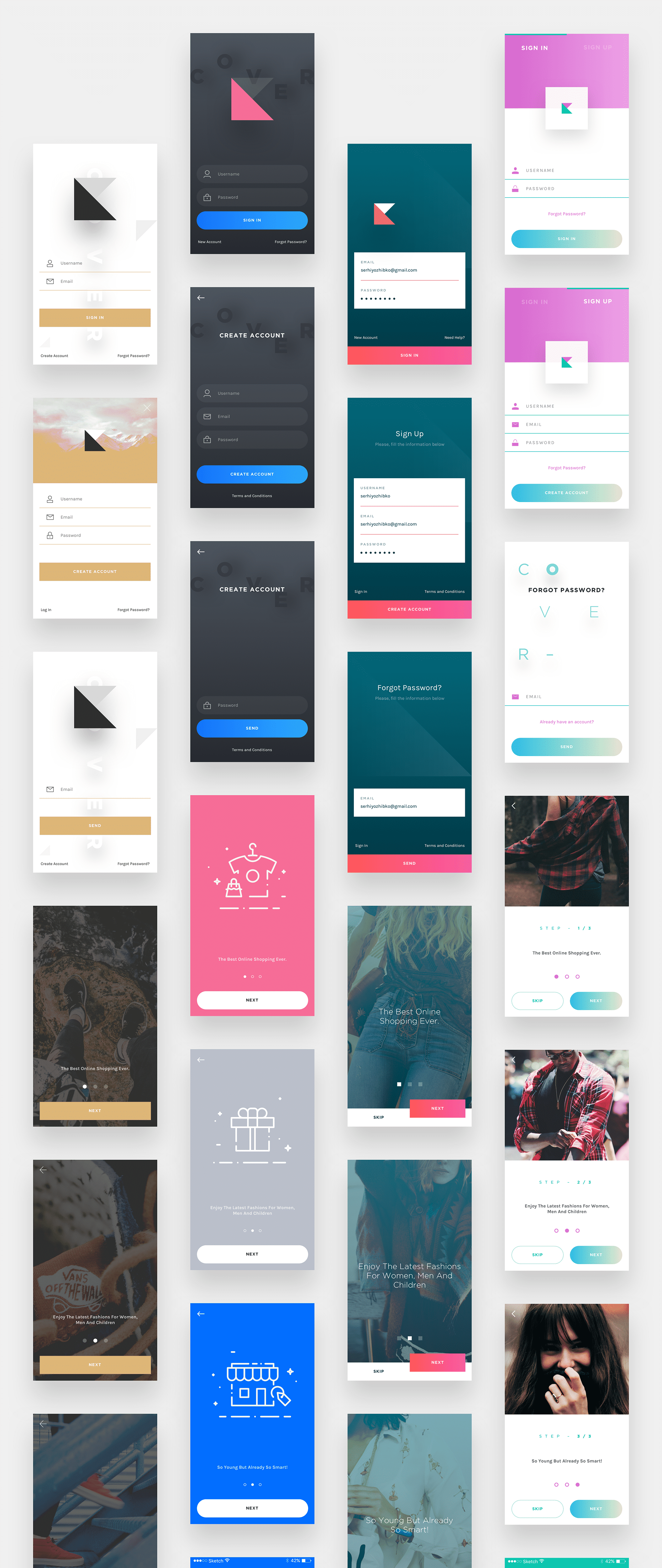 封面是一个移动购物电子商务用户界面工具包。封面包含矢量元素,网格,组织良好的图层和60个手机屏幕模板。每个组件都完全可定制,易于使用,并在Sketch中精心组装。包括4个不同的设计,以帮助您创建一个干净,上口的电子商务购物应用程序。设计非常华丽,并根据用户体验进行设计。为当前UI套件设计的各种元素将完美适合任何购物应用程序。