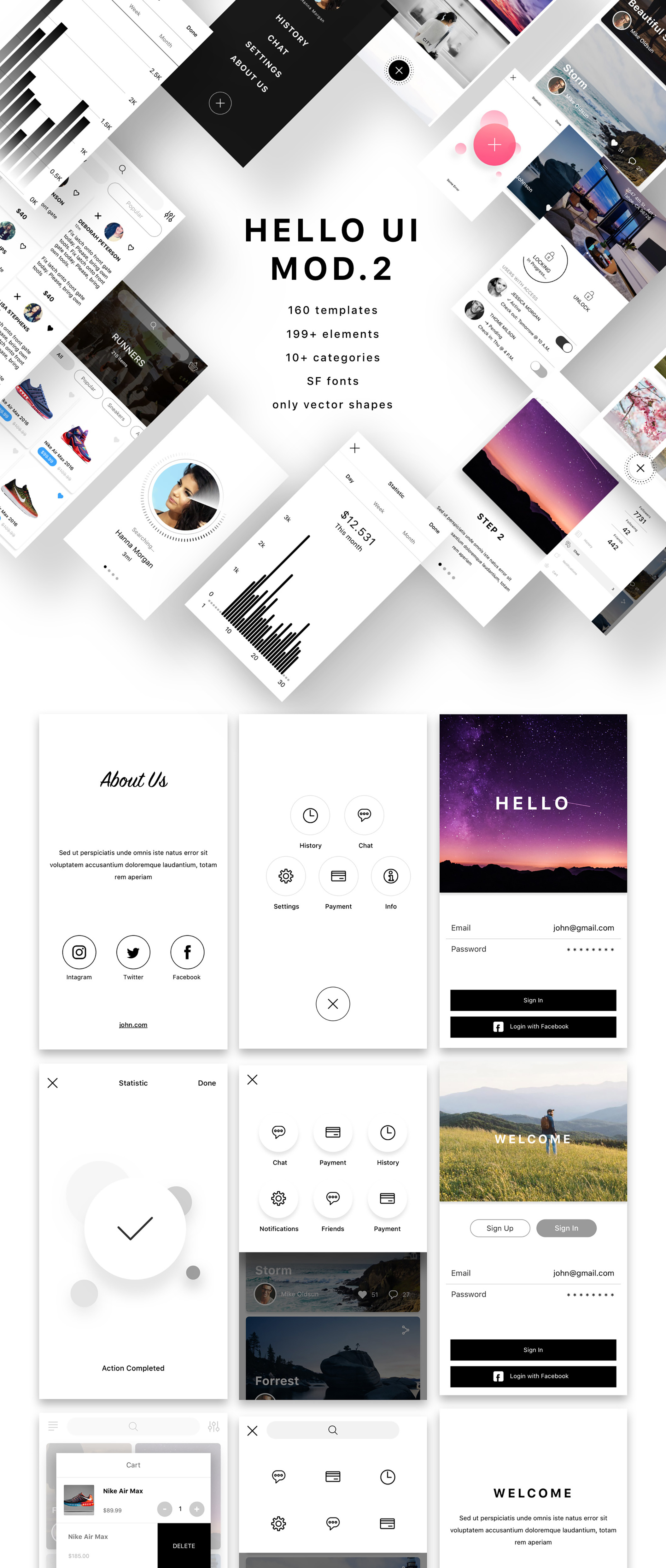 Heeeeey,Hello UI Kit Mod。 2!这款移动UI套件套件包含160多个独特的屏幕,700多种矢量自定义用户界面元素,供开发人员以及Sketch中设计的iOS应用程序设计人员使用。所有的元素,块和画廊可以很容易地结合起来。由于所有对象都是使用形状创建的。这套将是一个伟大的匹配您的应用程序! Hello UI Kit Mod。 2特点SF字体,整齐的组织层次和容易定制。类别包括;社交,菜单,活动,统计,配置文件,电子商务,画廊,杂项,注册,飞溅,相机和照片