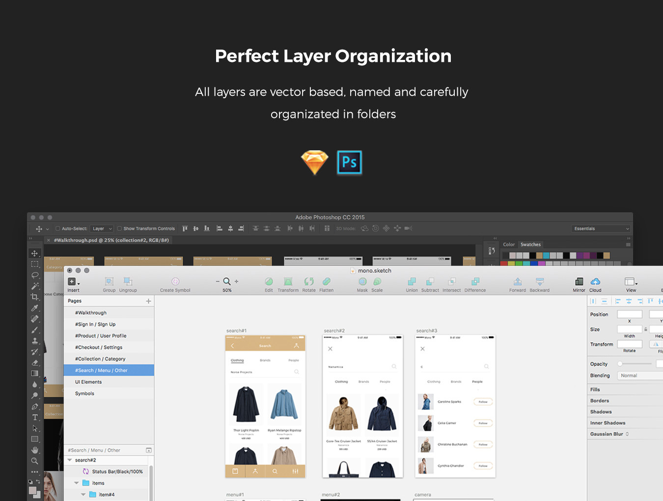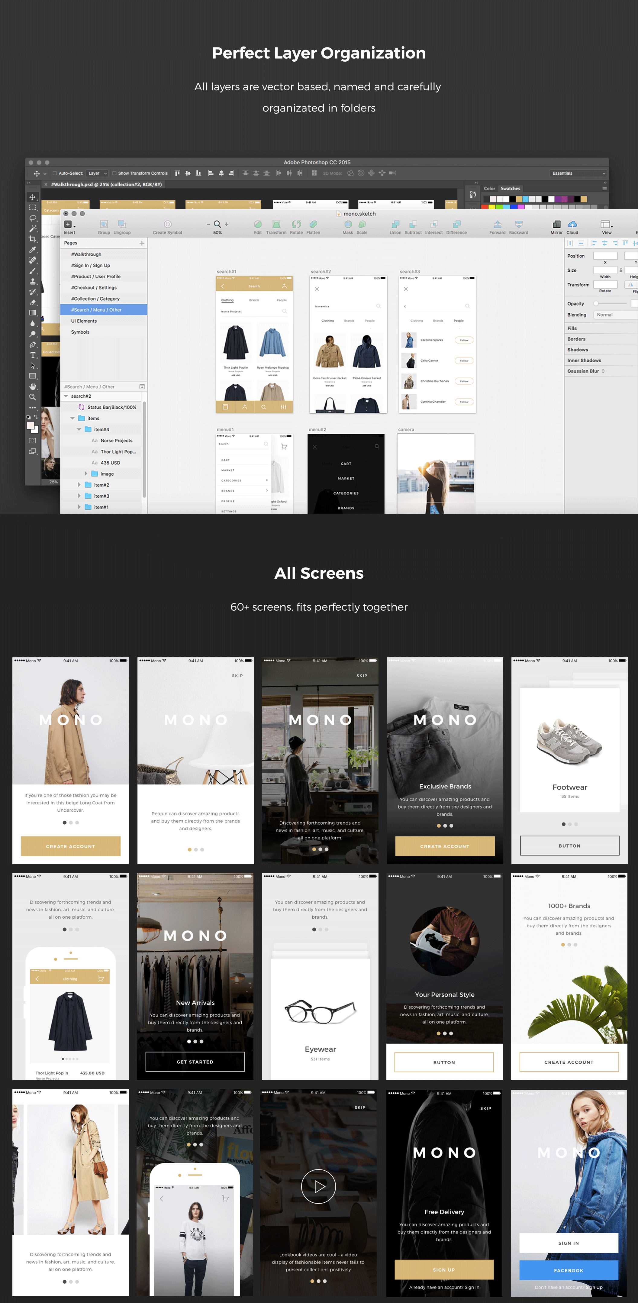 为电子商务项目引入移动UI套件。超过60个优雅的屏幕在10个类别与独特和干净的设计,将有助于时尚和艺术产品。单声道包含了构建应用程序所需的一切,甚至更多!完美的图层组织,所有的图层都是基于矢量的,命名和精心组织在文件夹中。兼容Sketch 3.7+和Photoshop CC +。