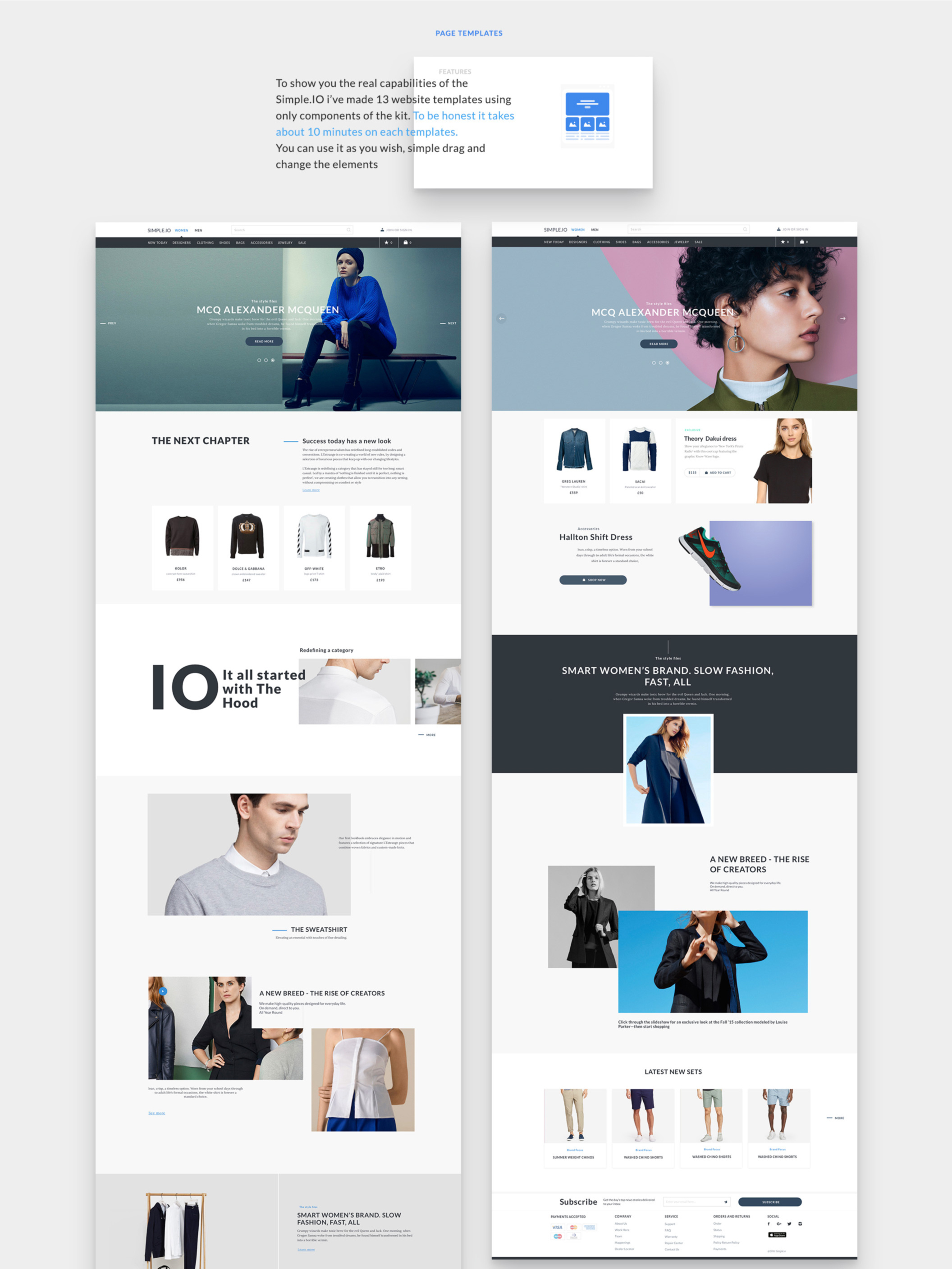 Simple.io套件是一个基于现代简约组件的UI套件,非常适合为您的个人或客户项目设计干净时尚的电子商务网站。 Simple.io构建于SketchApp之上,附带13个模板,完全自定义以及数千个模块/卡片。 Simple.io结合了美观和实用性,绝对是您收藏中需要的工具!为了您的方便,我将所有元素分为7个热门类别;文章,电子商务,表格,标题,导航,小工具,基本元素。