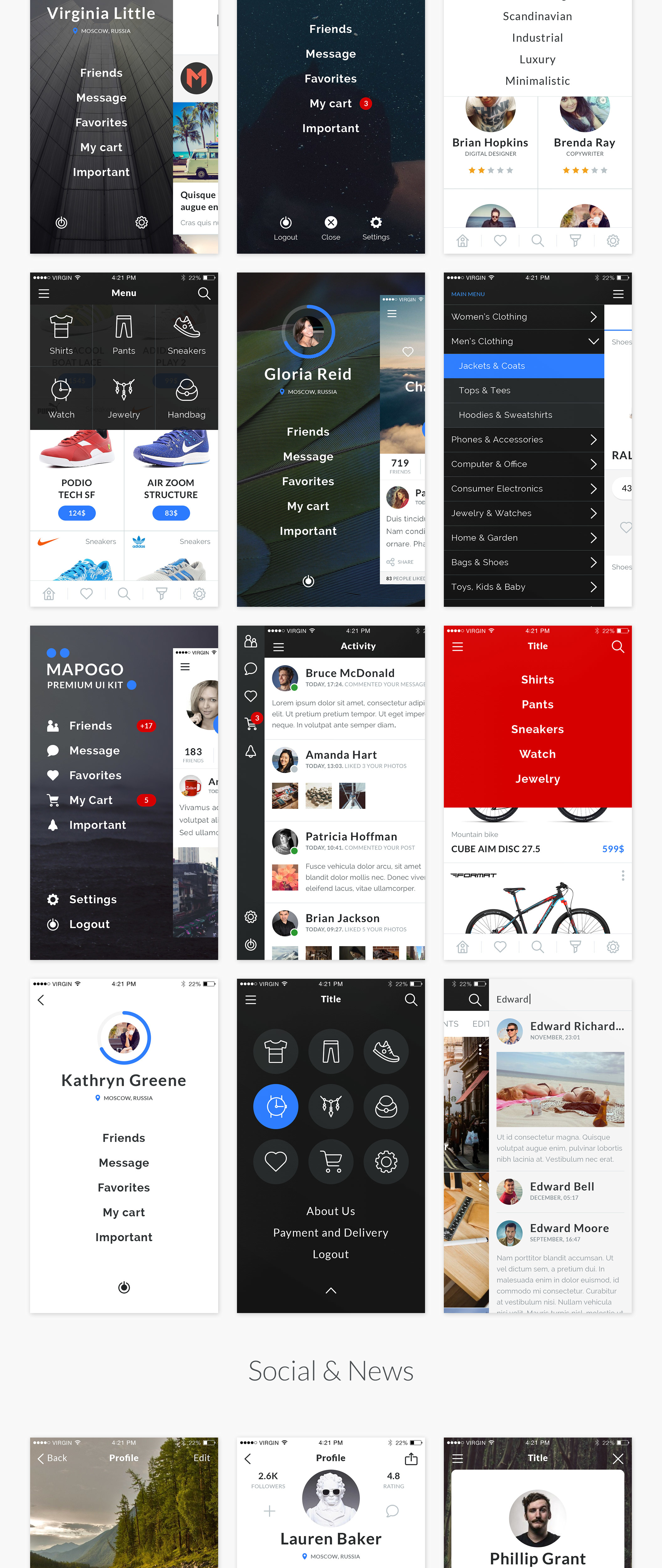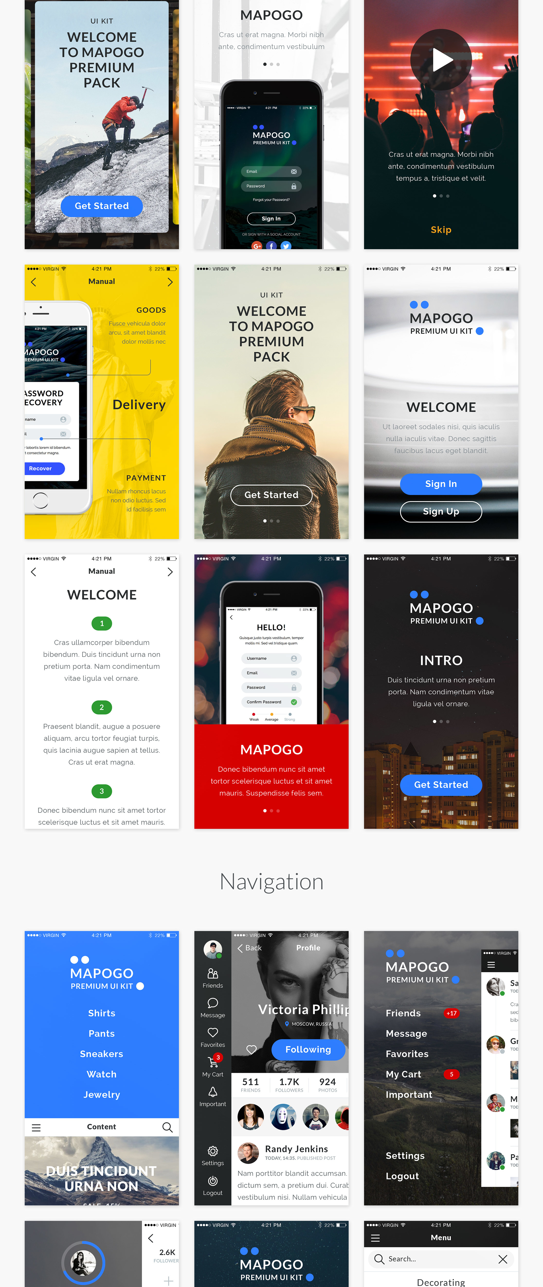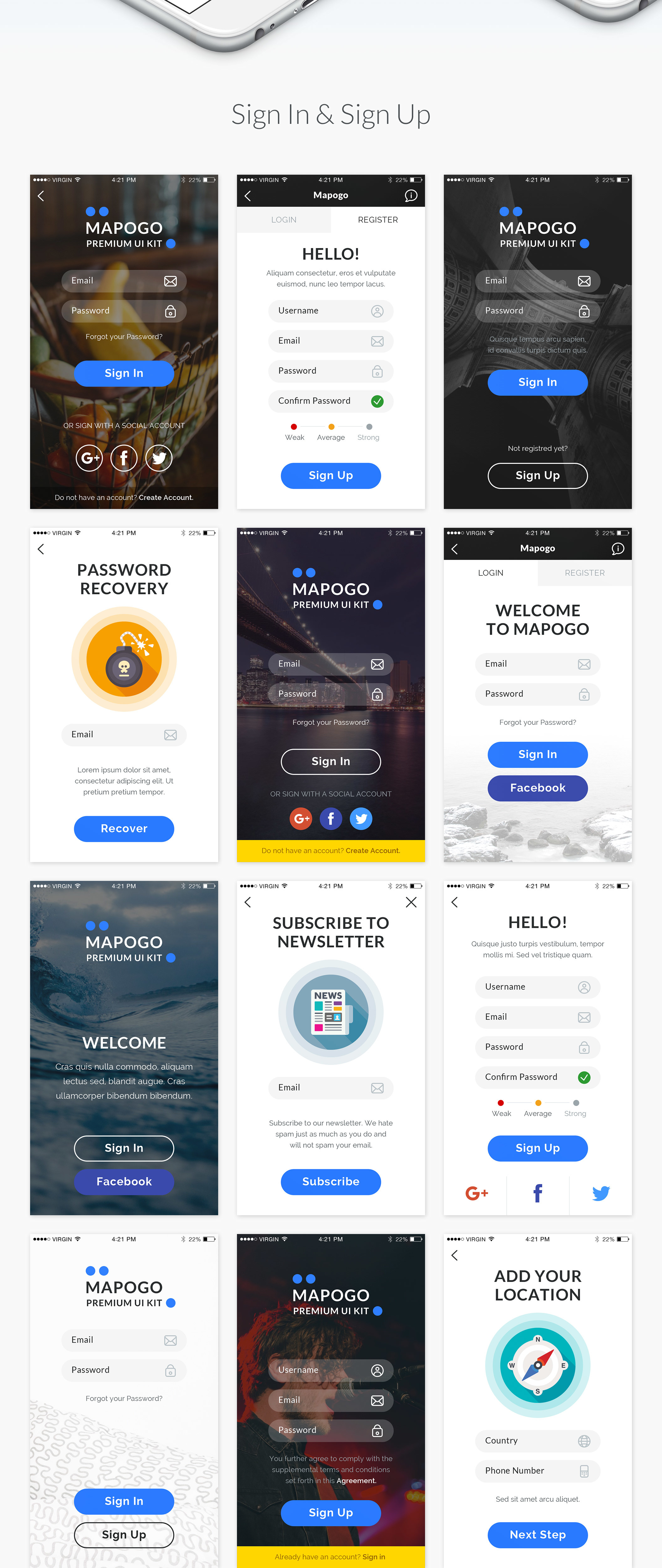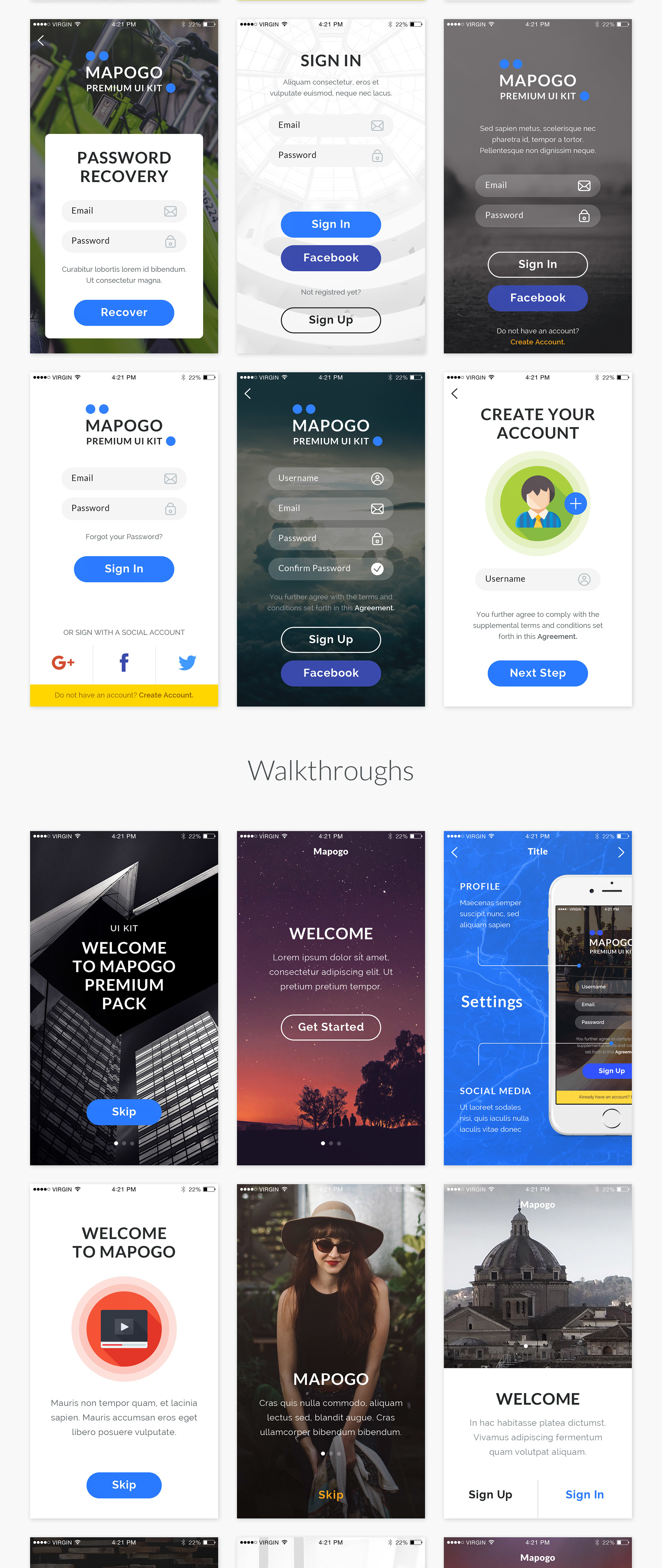 Mapogo是一个熟练的集合,充满了不错的用户界面元素。这是一个设计师和移动应用程序开发人员的完美UI套件。所有的元素都组织成120 +高品质的屏幕。所有屏幕分为9类;登录,注册,演练,导航,社交,新闻,配置文件,多媒体,电子商务,精心组装在素描,Illustrator和Photoshop中。