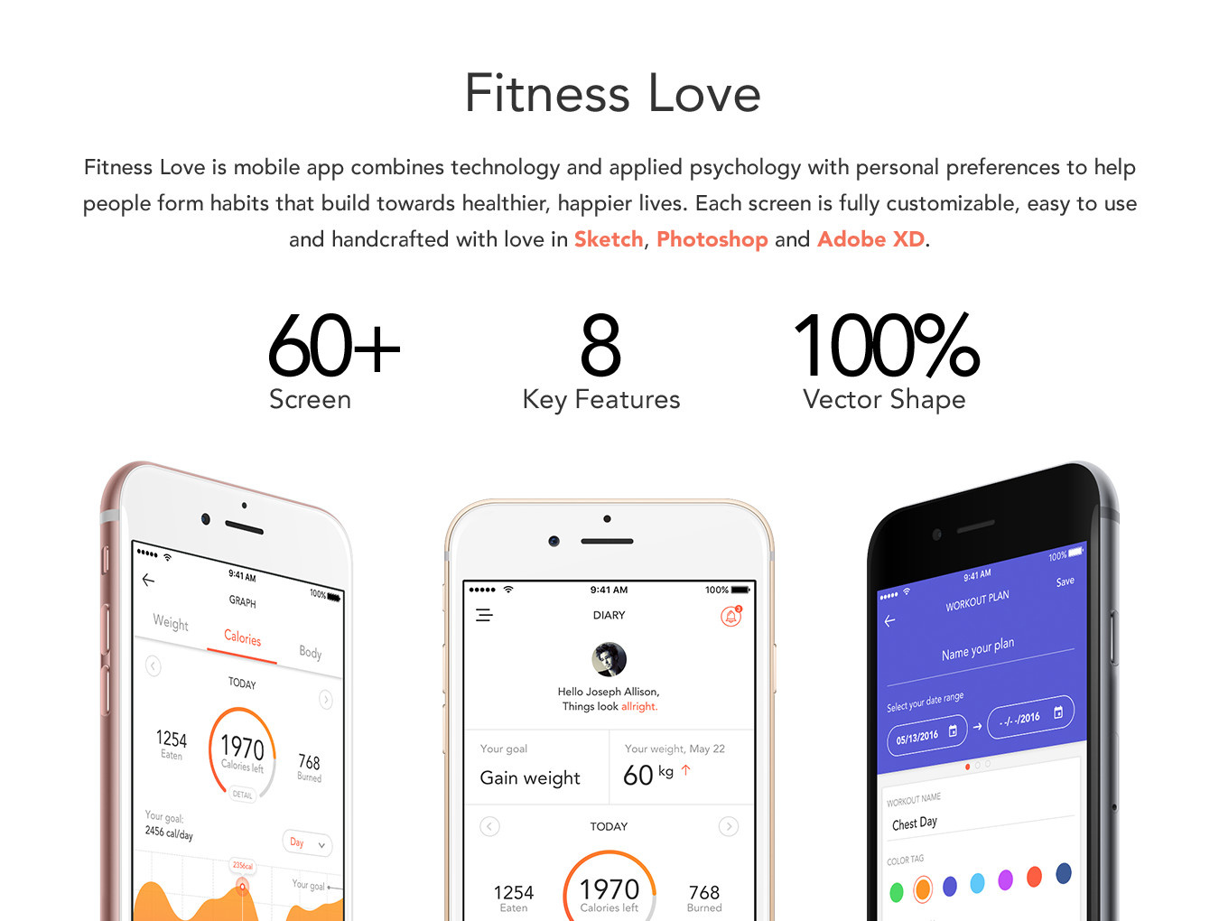 健身爱是一个移动应用程序,结合技术和应用心理学与个人喜好,帮助人们形成习惯,建立更健康,更快乐的生活。每个屏幕都是完全可定制的,易于使用和手工制作的Sketch,Photoshop和Adobe XD的爱。