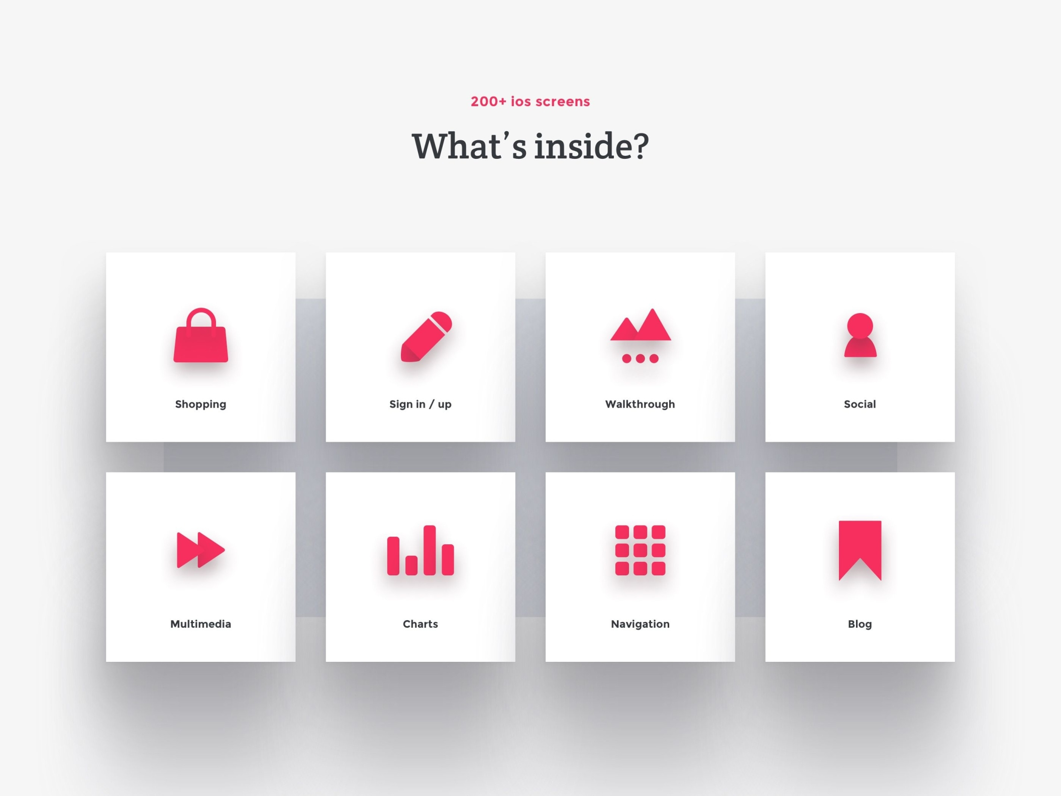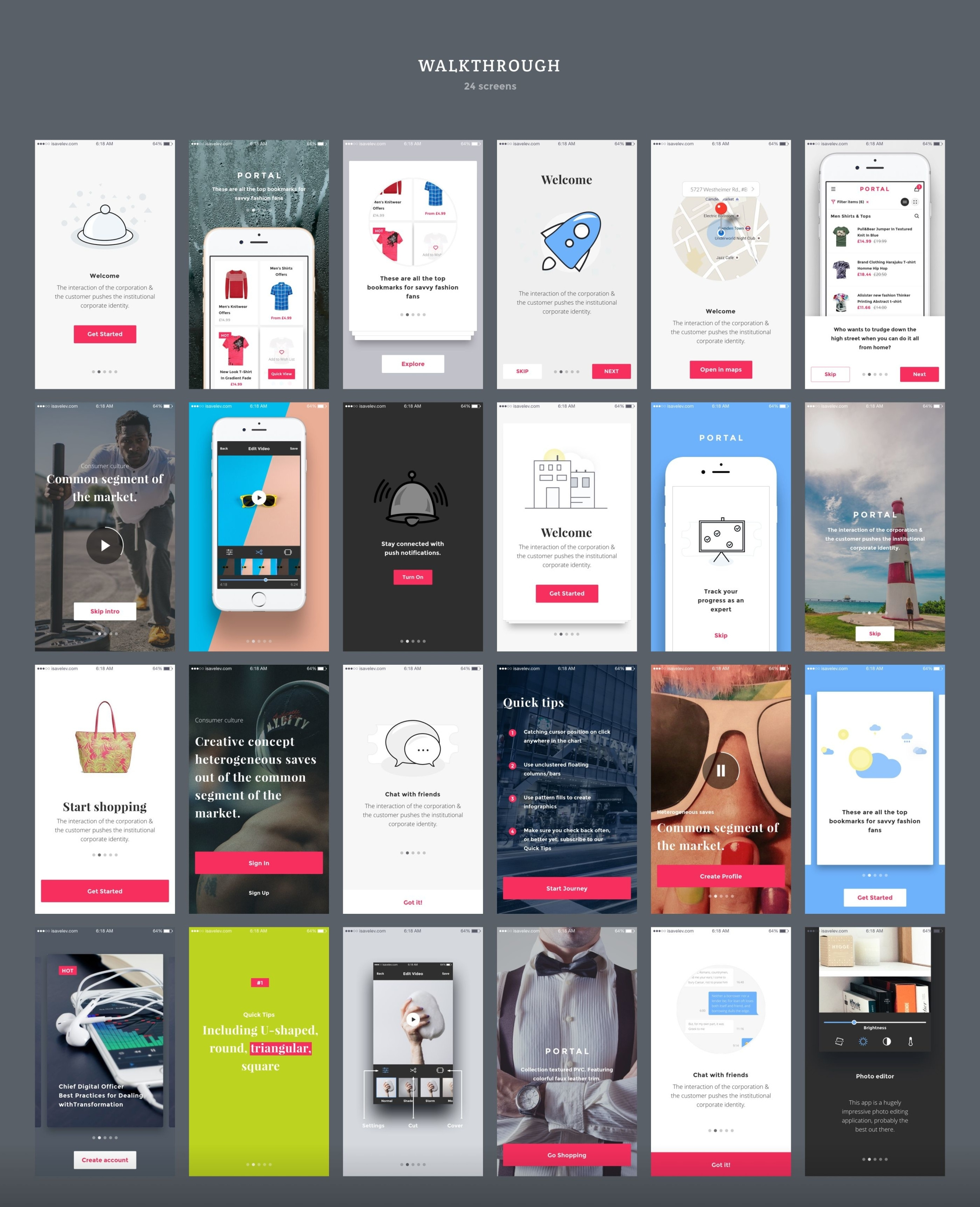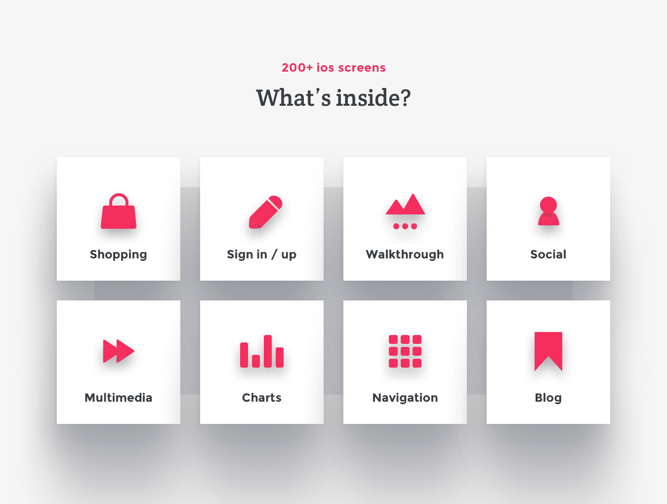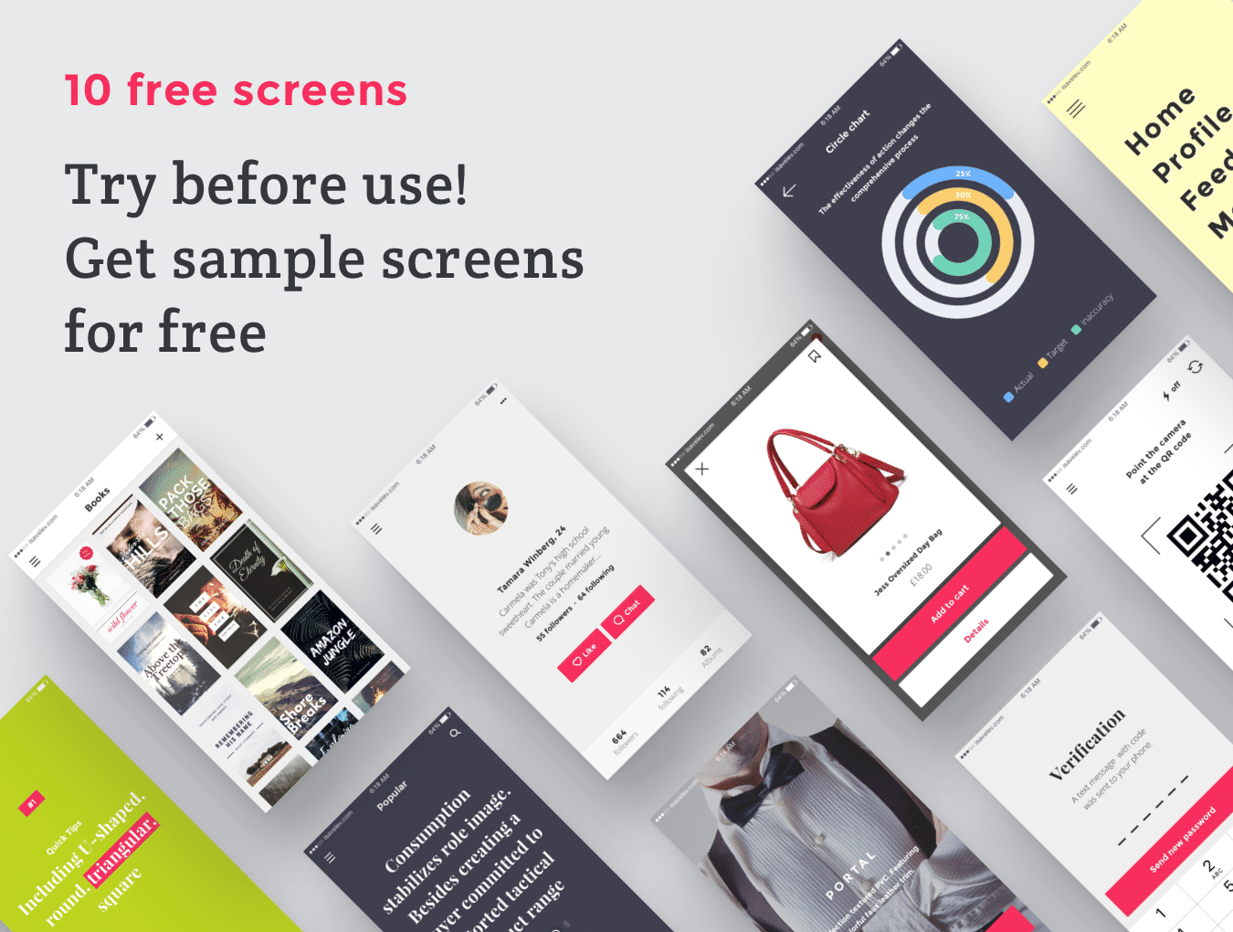创建您的应用程序设计,原型或获得启发与超过200个iOS屏幕和数百个用户界面元素,组织成8个流行的内容类别;购物,登录/注册,演练,社交,多媒体,图表,导航和博客。