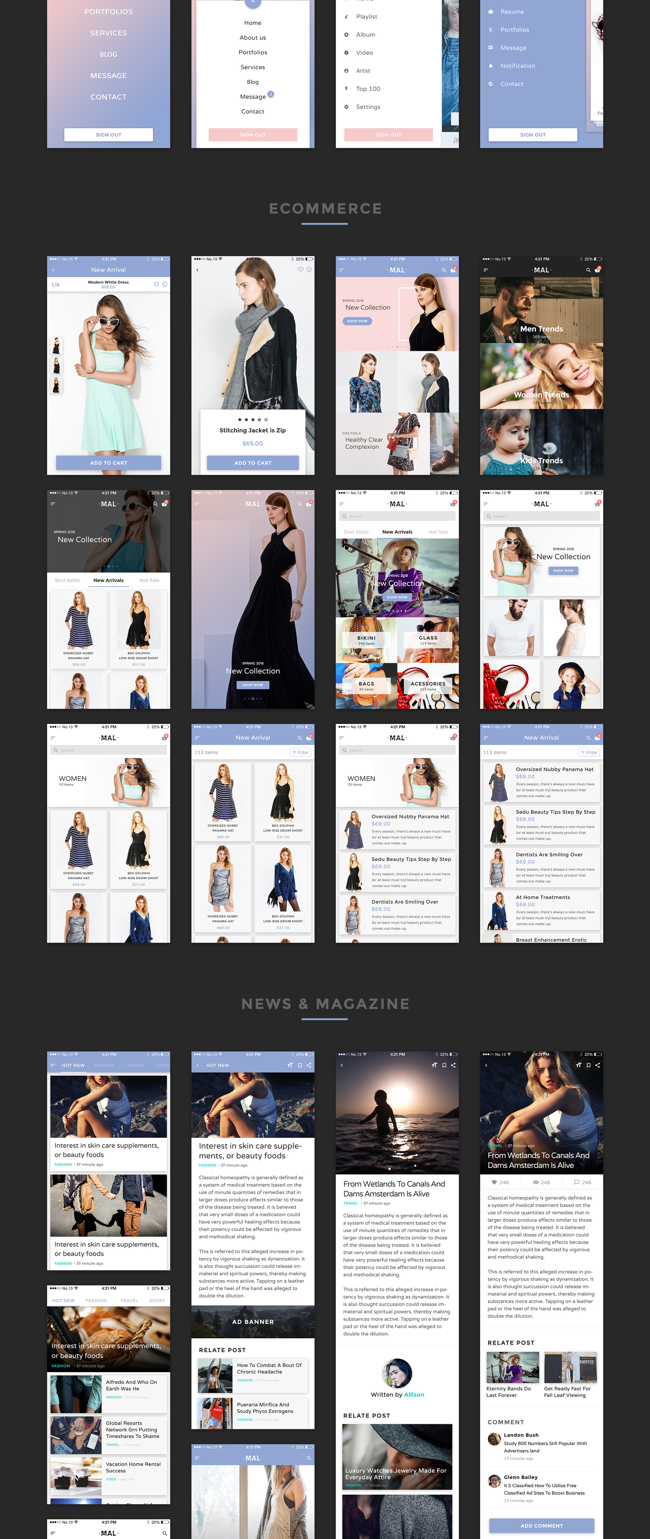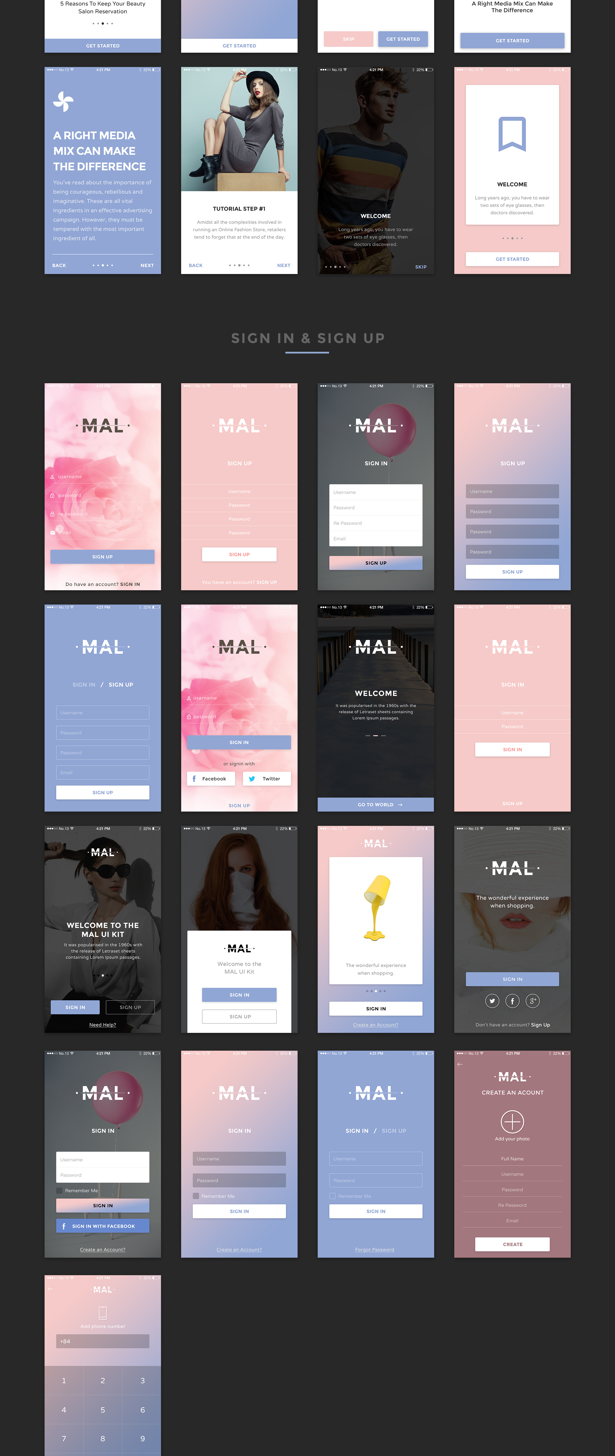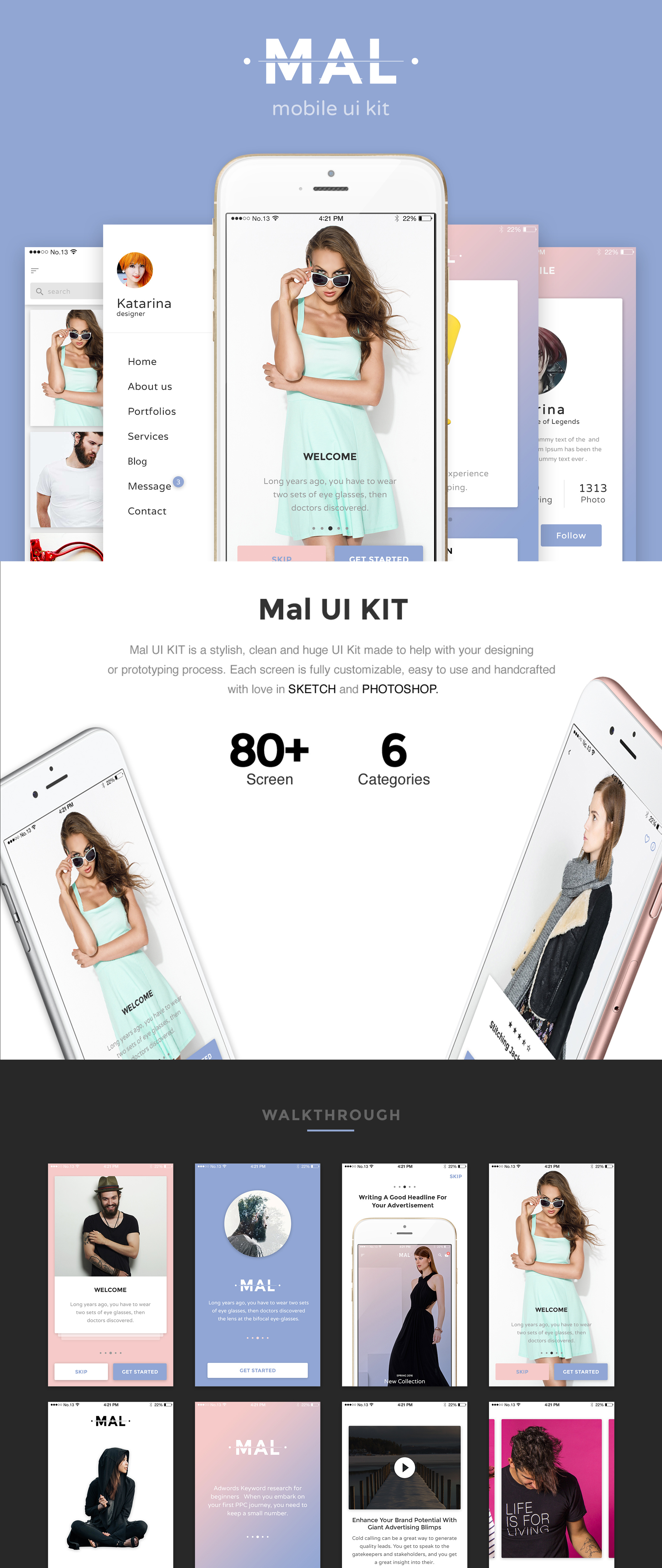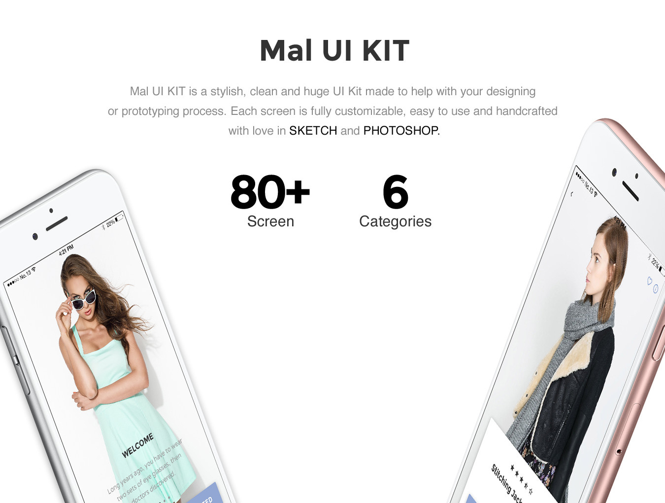 Mal UI KIT是一款时尚,干净且庞大的用户界面工具包,可帮助您进行设计或原型设计。每个屏幕都是完全可定制的,易于使用,并在Sketch和Photoshop中用爱手工制作。