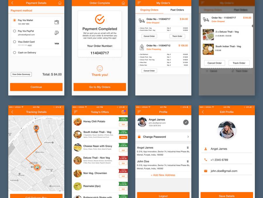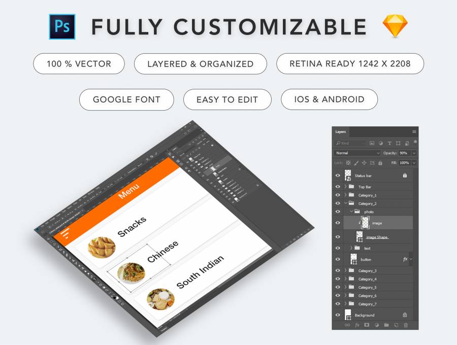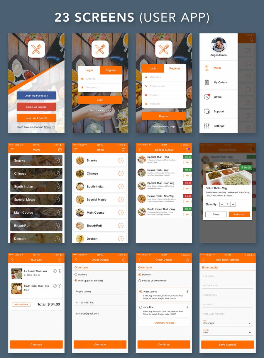 食物订购应用程序App UI套件专为餐厅,食品配送店和供应商而设计。这个UI工具包有一个完整的用户和管理工作流程。用户界面套件包含与食品运送业务相关的所有可能功能 这个UI套件包含23个用户和18个管理应用程序模板高品质的屏幕(PSD和素描文件)与平面和现代的设计。 如果您需要修改主题,则可以轻松更改颜色并更改单个元素。只使用矢量形状和图层样式。您可以为iPhone和Android应用设计使用相同的文件。